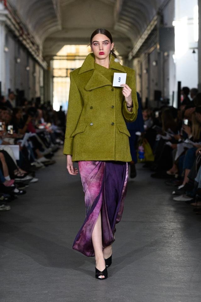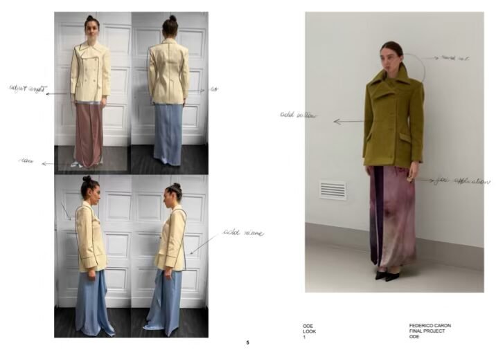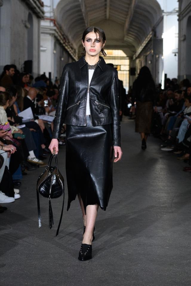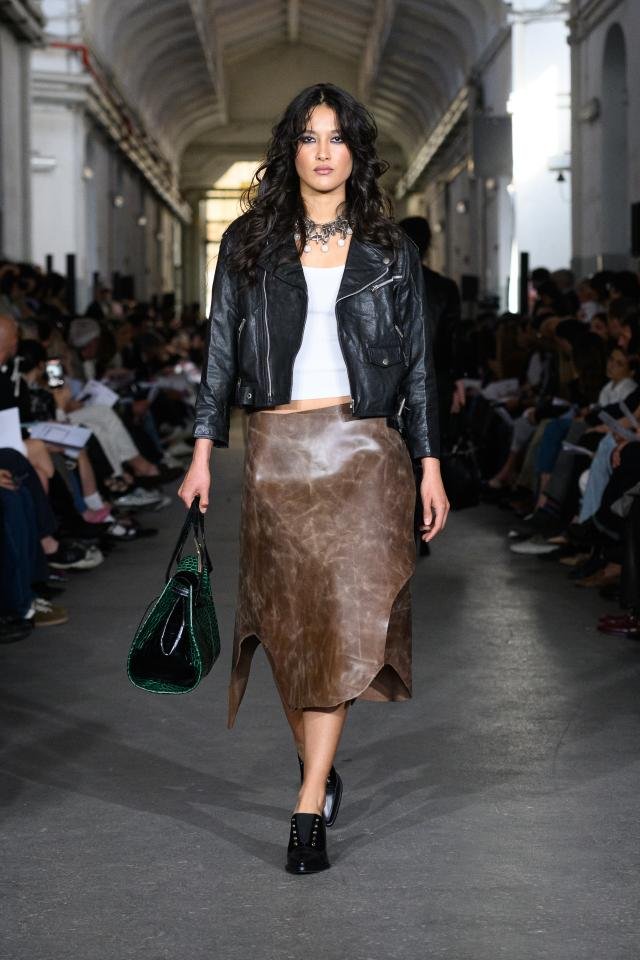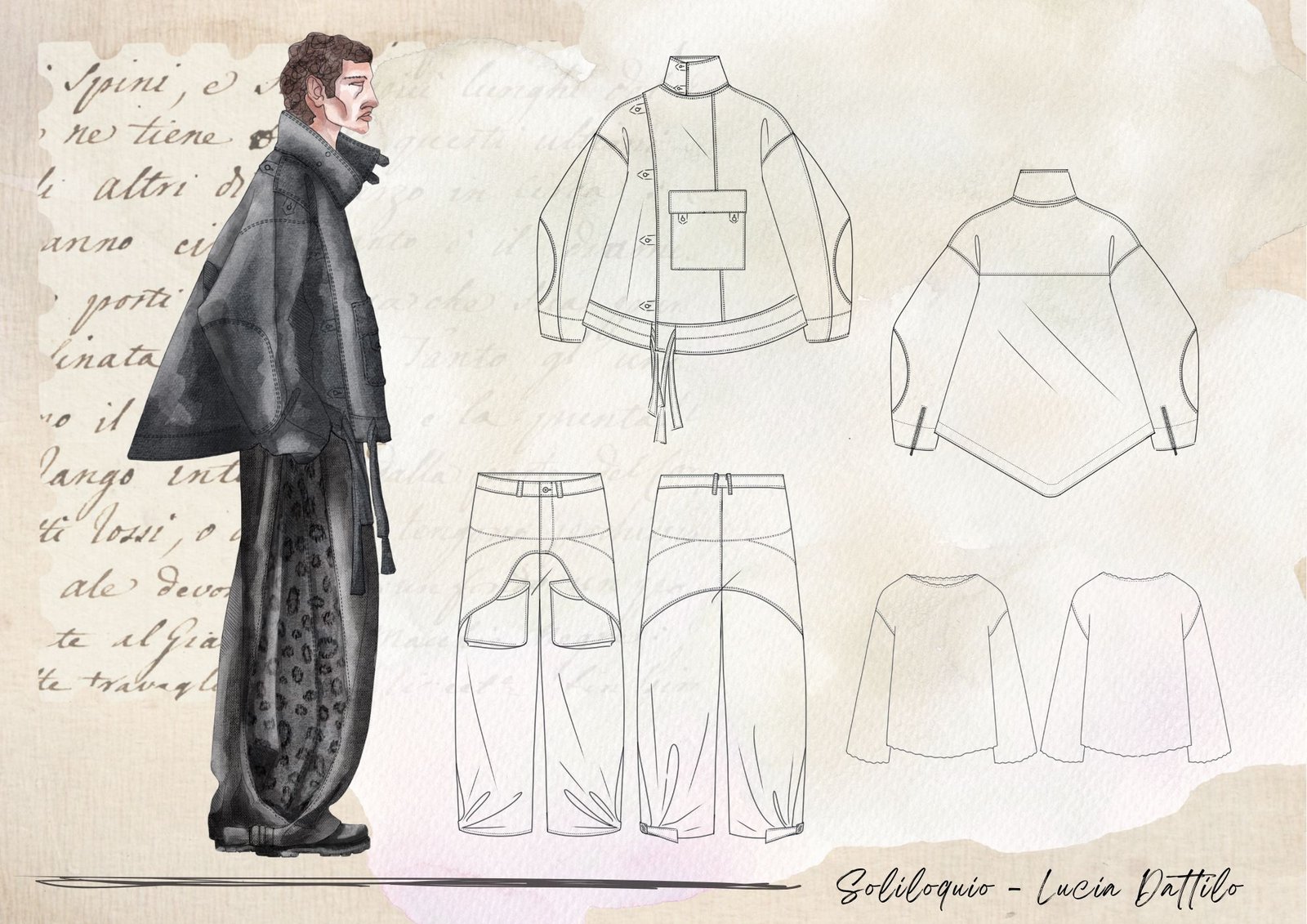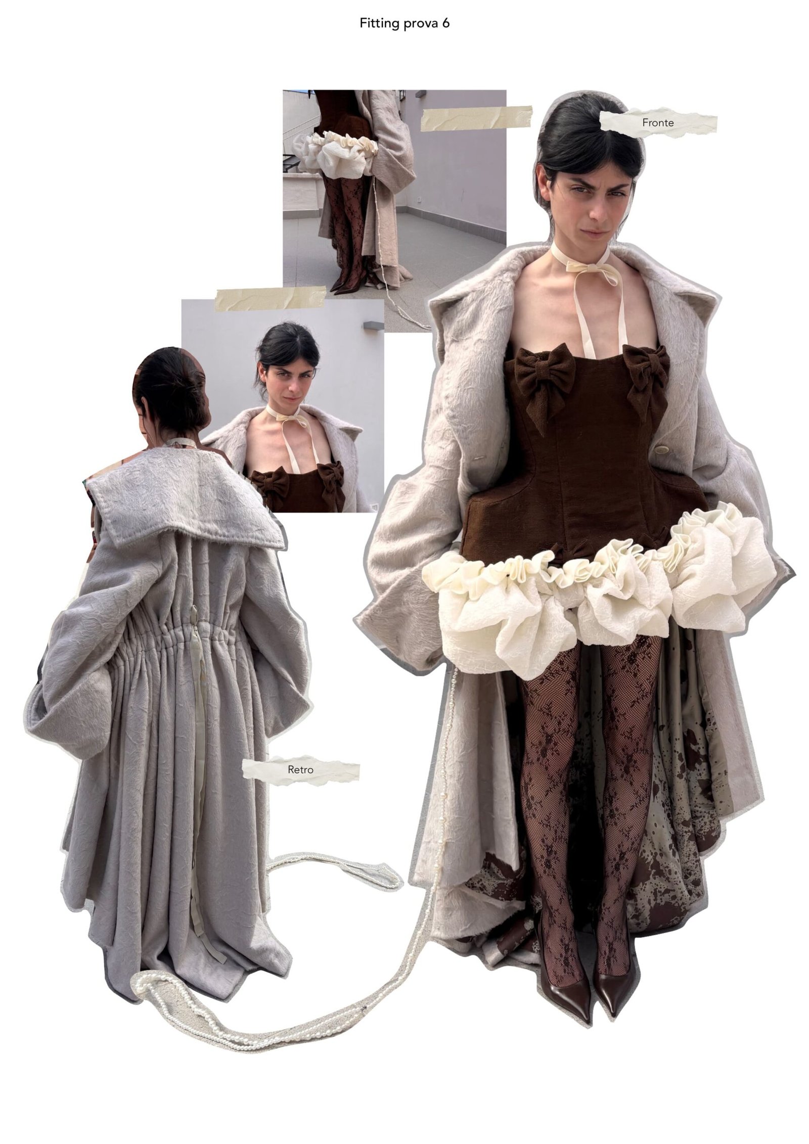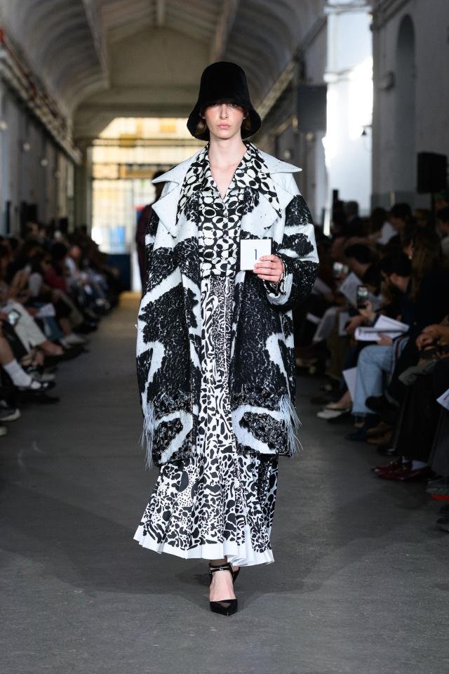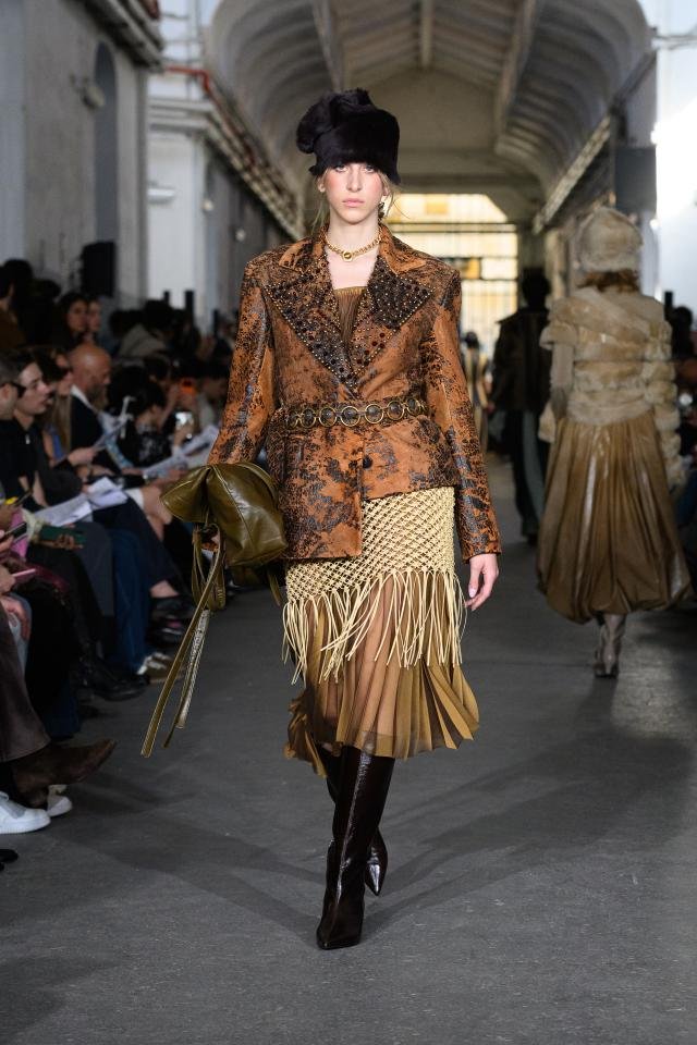 Benedetta Boidi’s collection is inspired by the concept of nomadism, explored through both a historical and iconographic investigation and a reflection on its evolution into the present day, creating a dialogue between past and future. Materiality plays a central role, with a focus on durable fabrics such as leather, alongside shearling and upcycled fur, combined with resin-coated cotton, jersey, and vintage-effect denim. Colour is equally significant, particularly in look one, where three different tones are intentionally combined. Collaborations with industry companies such as Goretti, for leather weaving and stud applications, and Wash Italia, for washed denim with a vintage finish and faux leather detailing, further shaped the work. Through these processes, the collection reflects a continuous exchange between materials, cultures, and time, shaping garments as evolving, nomadic identities. What concerns Boidi most about the contemporary fashion system is the increasing centralisation of creative power within large conglomerates, where brand identity appears shaped more by commercial imperatives than by genuine creative vision, and the pressure to constantly produce risks overshadowing experimentation and research. She is also unsettled by the speed at which the system now operates, with accelerated production cycles and continuous collections leaving little room for reflection and depth. Yet this awareness is exactly what drives her: she enters the field with clarity and intention, fully conscious of its contradictions, believing strongly in the value of personal vision, in research as a necessary process, and in fashion as a form of critical and cultural expression.