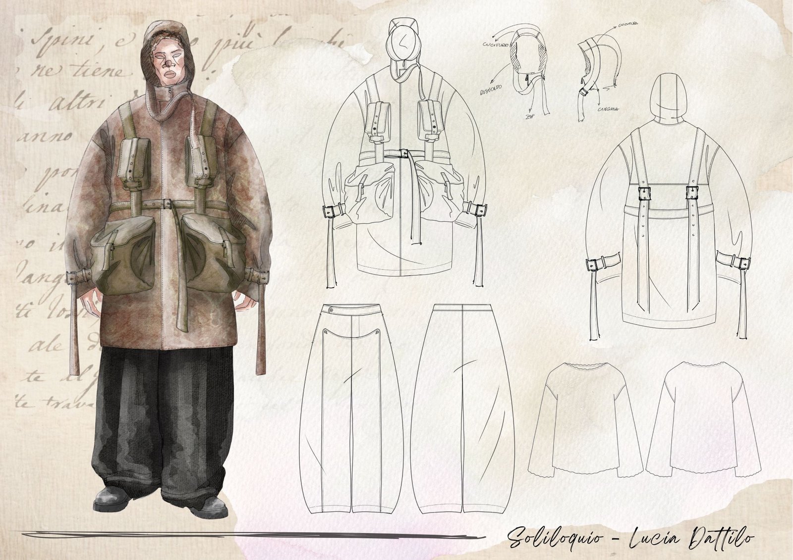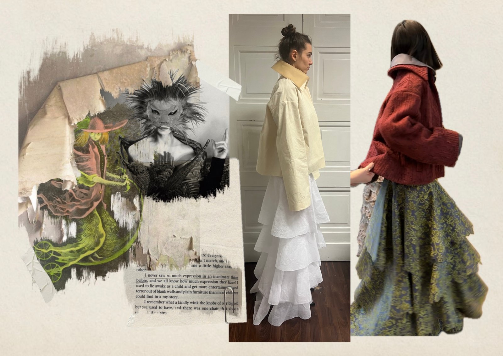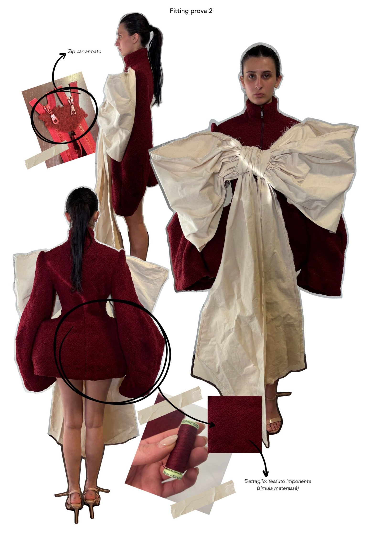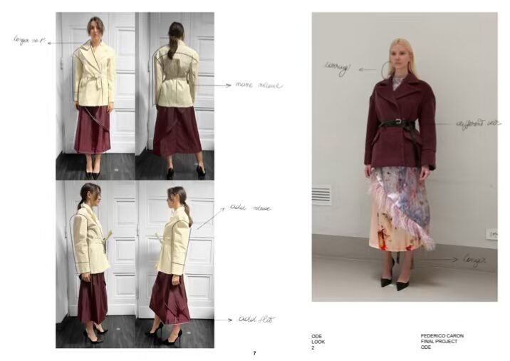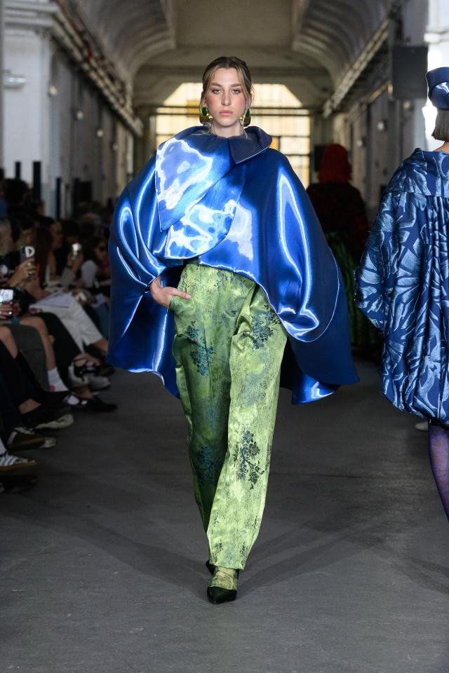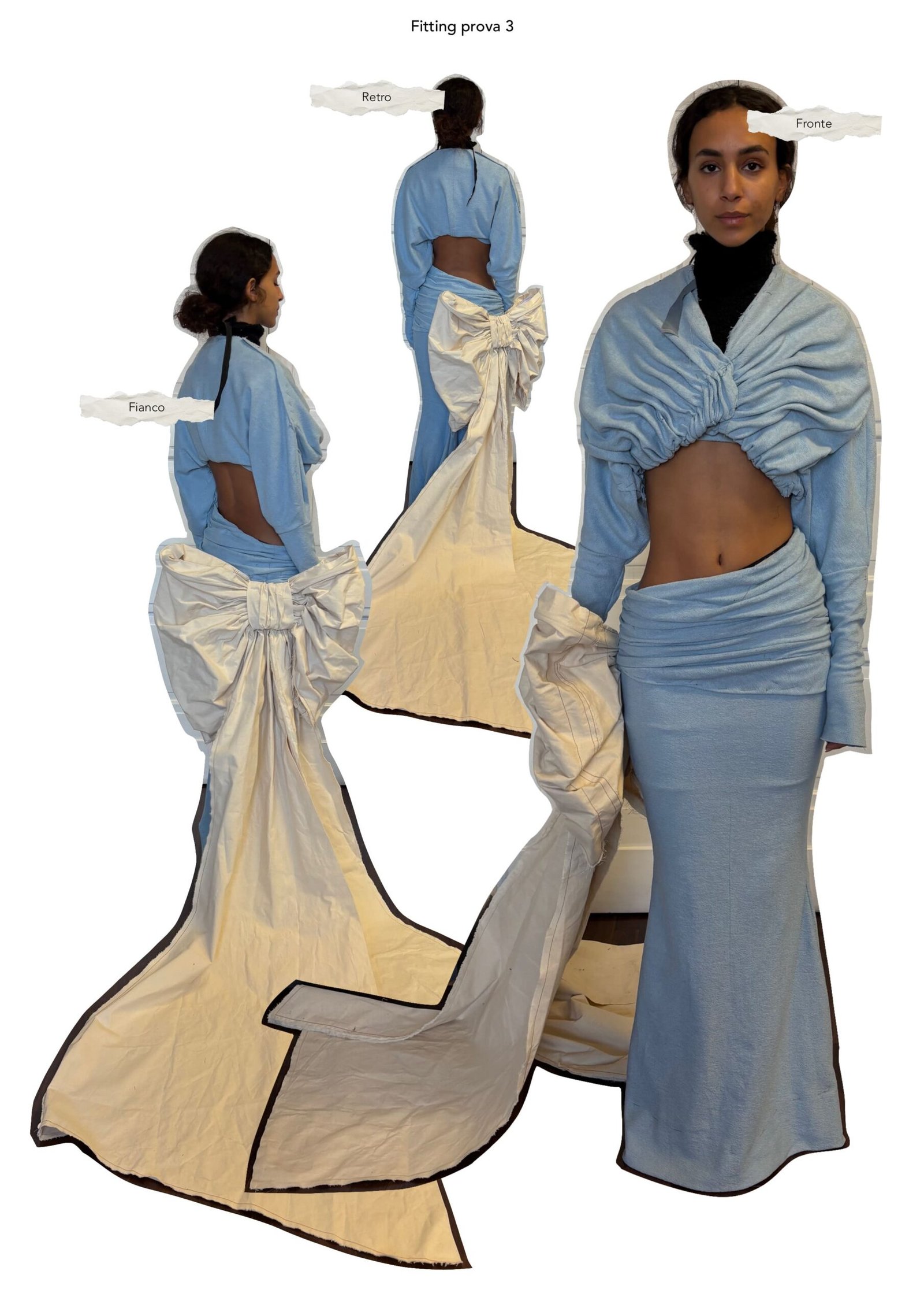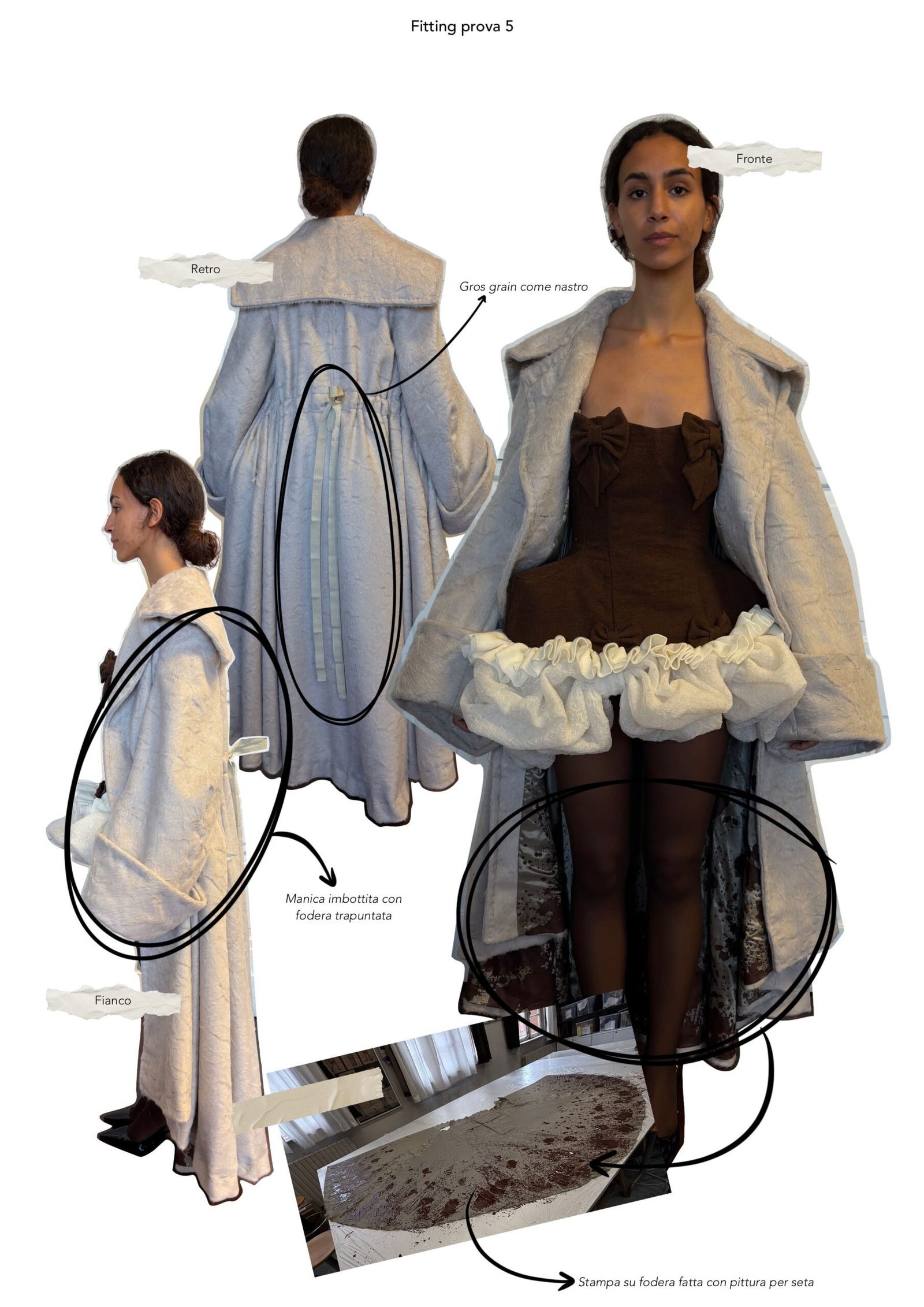 Benedetta Boidi’s collection is inspired by the concept of nomadism, explored through both a historical and iconographic investigation and a reflection on its evolution into the present day, creating a dialogue between past and future. Materiality plays a central role, with a focus on durable fabrics such as leather, alongside shearling and upcycled fur, combined with resin-coated cotton, jersey, and vintage-effect denim. Colour is equally significant, particularly in look one, where three different tones are intentionally combined. Collaborations with industry companies such as Goretti, for leather weaving and stud applications, and Wash Italia, for washed denim with a vintage finish and faux leather detailing, further shaped the work. Through these processes, the collection reflects a continuous exchange between materials, cultures, and time, shaping garments as evolving, nomadic identities. What concerns Boidi most about the contemporary fashion system is the increasing centralisation of creative power within large conglomerates, where brand identity appears shaped more by commercial imperatives than by genuine creative vision, and the pressure to constantly produce risks overshadowing experimentation and research. She is also unsettled by the speed at which the system now operates, with accelerated production cycles and continuous collections leaving little room for reflection and depth. Yet this awareness is exactly what drives her: she enters the field with clarity and intention, fully conscious of its contradictions, believing strongly in the value of personal vision, in research as a necessary process, and in fashion as a form of critical and cultural expression.