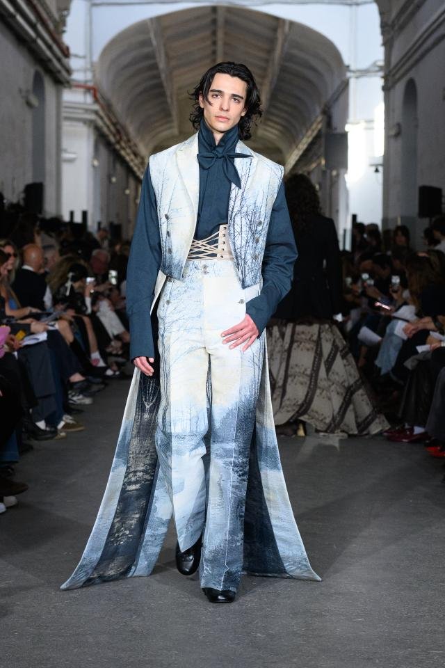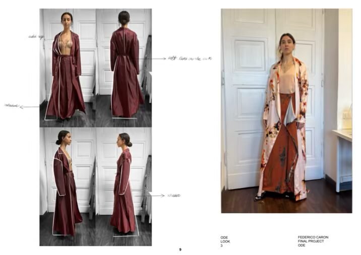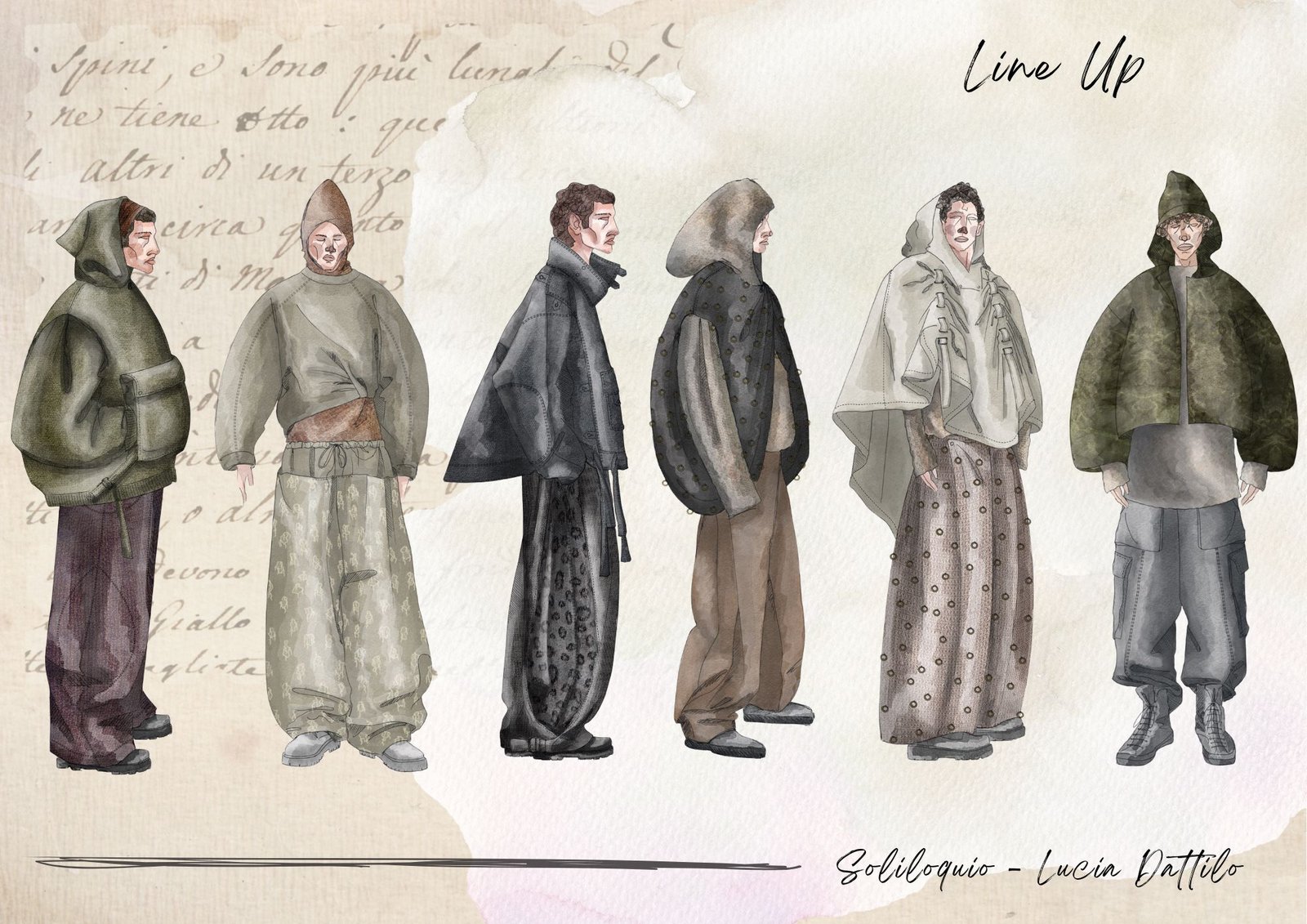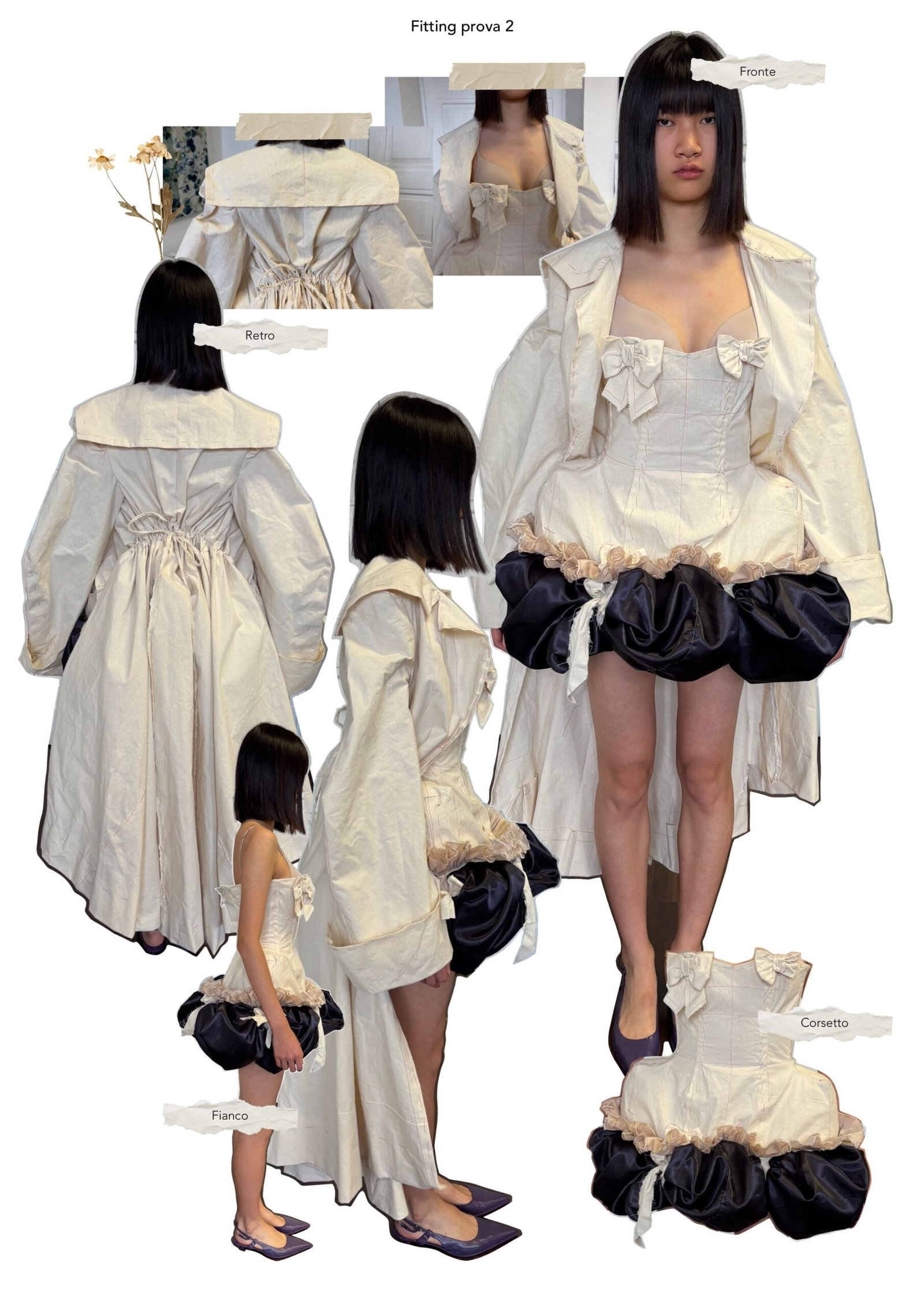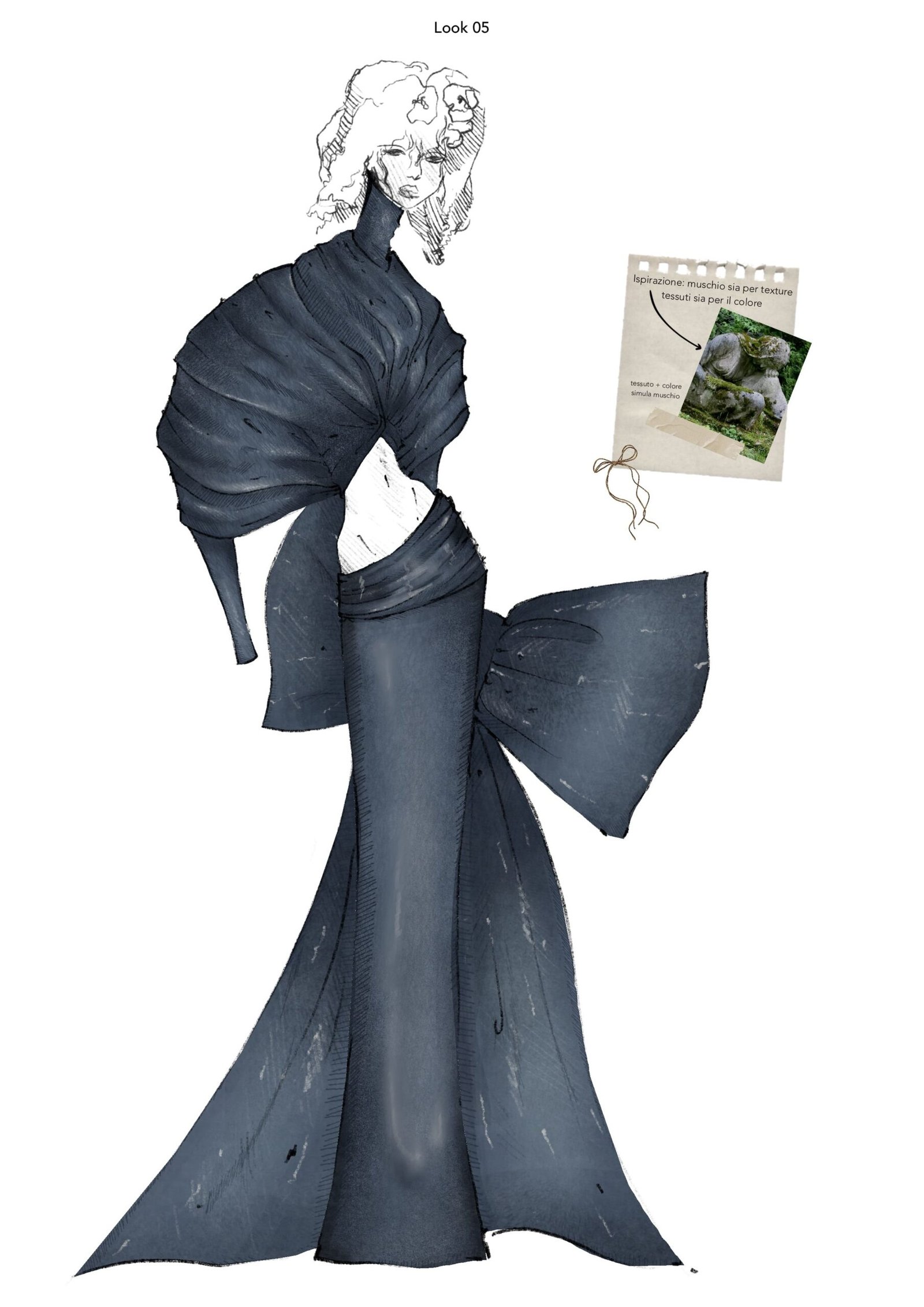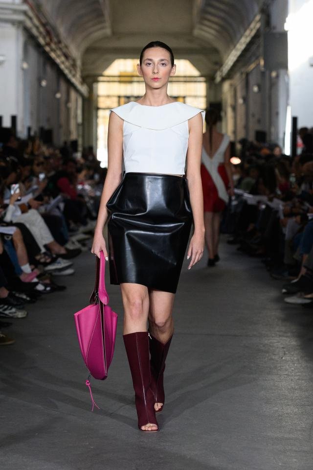 Benedetta Boidi’s collection is inspired by the concept of nomadism, explored through both a historical and iconographic investigation and a reflection on its evolution into the present day, creating a dialogue between past and future. Materiality plays a central role, with a focus on durable fabrics such as leather, alongside shearling and upcycled fur, combined with resin-coated cotton, jersey, and vintage-effect denim. Colour is equally significant, particularly in look one, where three different tones are intentionally combined. Collaborations with industry companies such as Goretti, for leather weaving and stud applications, and Wash Italia, for washed denim with a vintage finish and faux leather detailing, further shaped the work. Through these processes, the collection reflects a continuous exchange between materials, cultures, and time, shaping garments as evolving, nomadic identities. What concerns Boidi most about the contemporary fashion system is the increasing centralisation of creative power within large conglomerates, where brand identity appears shaped more by commercial imperatives than by genuine creative vision, and the pressure to constantly produce risks overshadowing experimentation and research. She is also unsettled by the speed at which the system now operates, with accelerated production cycles and continuous collections leaving little room for reflection and depth. Yet this awareness is exactly what drives her: she enters the field with clarity and intention, fully conscious of its contradictions, believing strongly in the value of personal vision, in research as a necessary process, and in fashion as a form of critical and cultural expression.