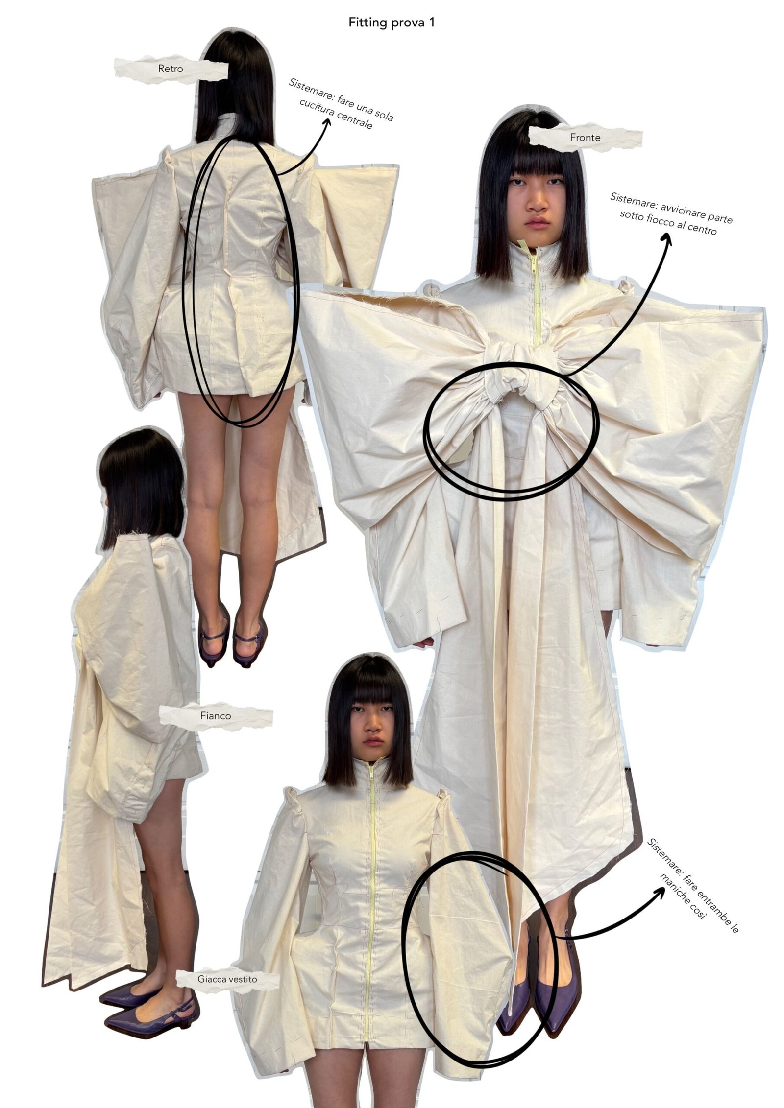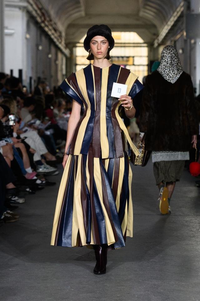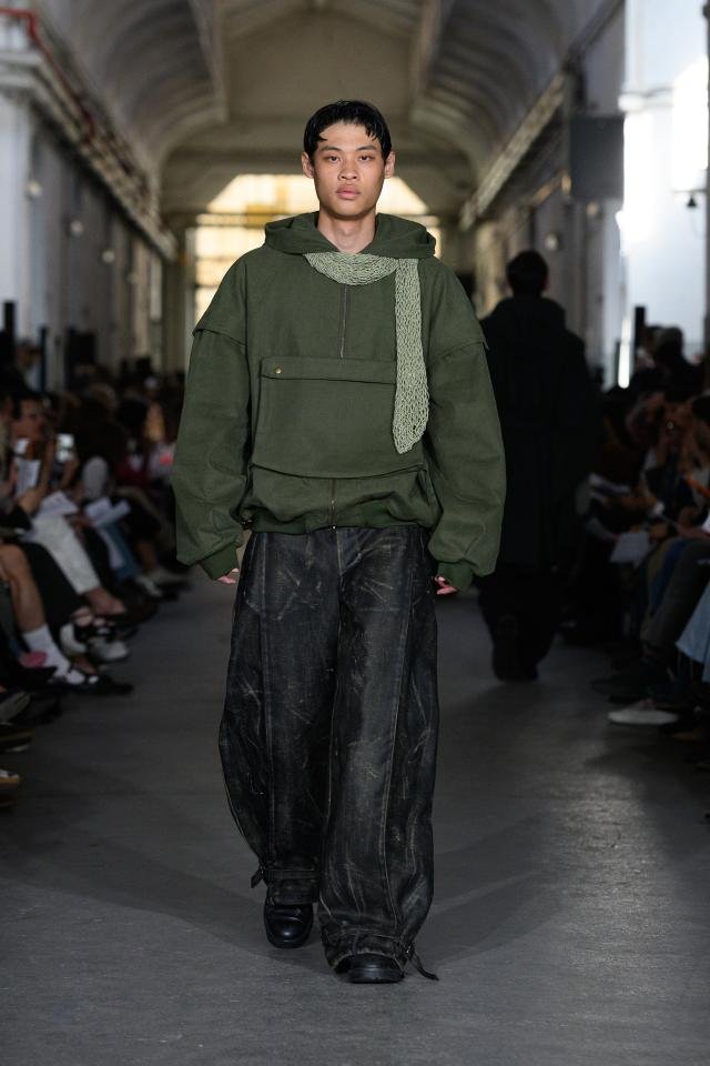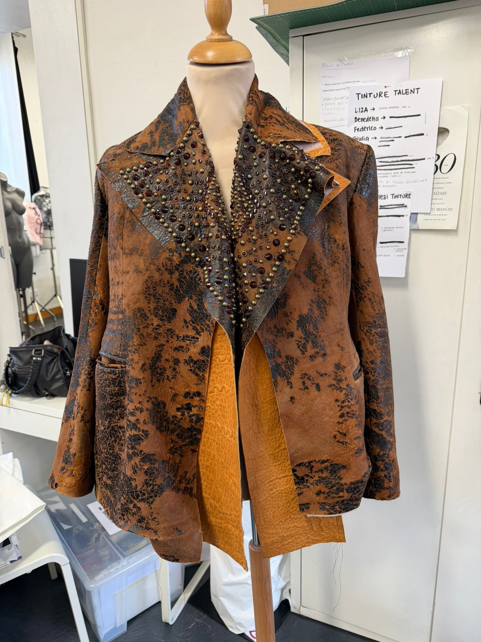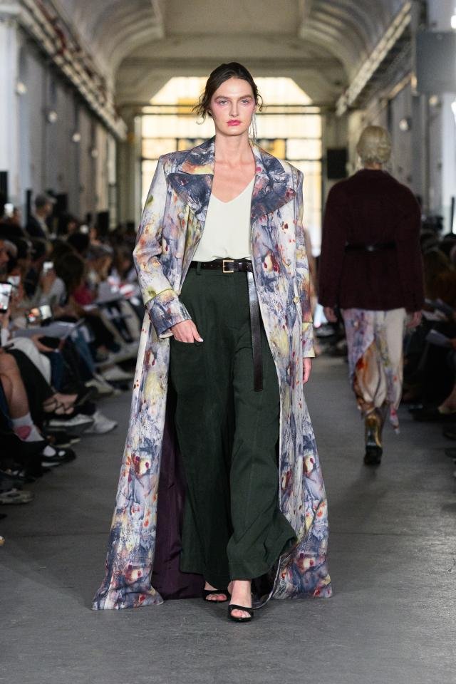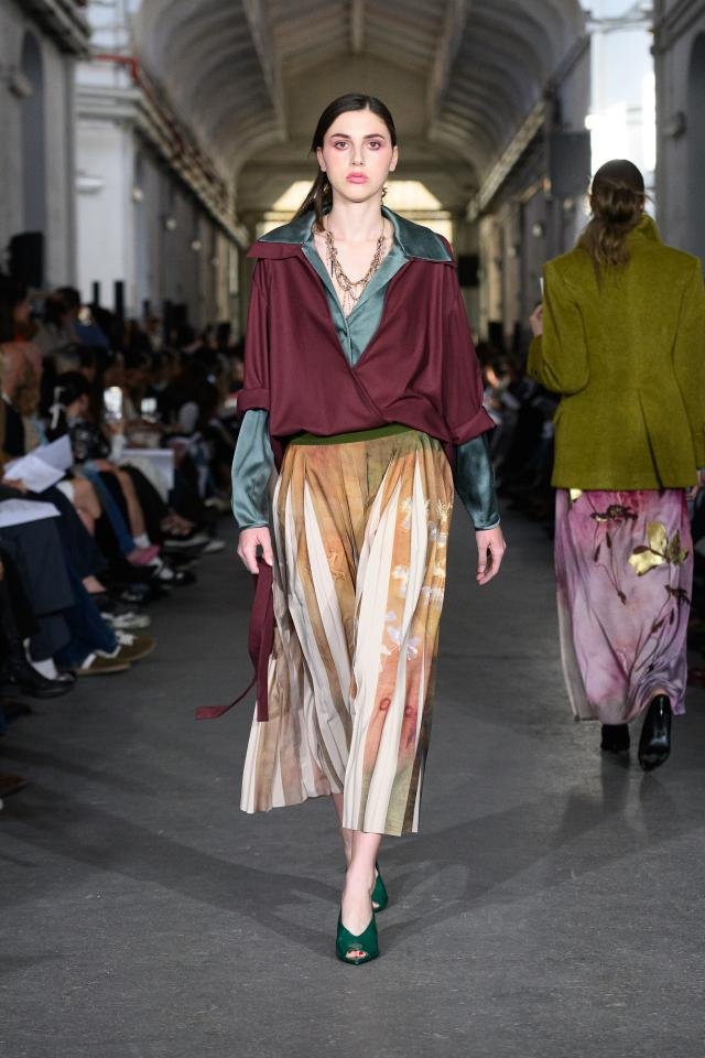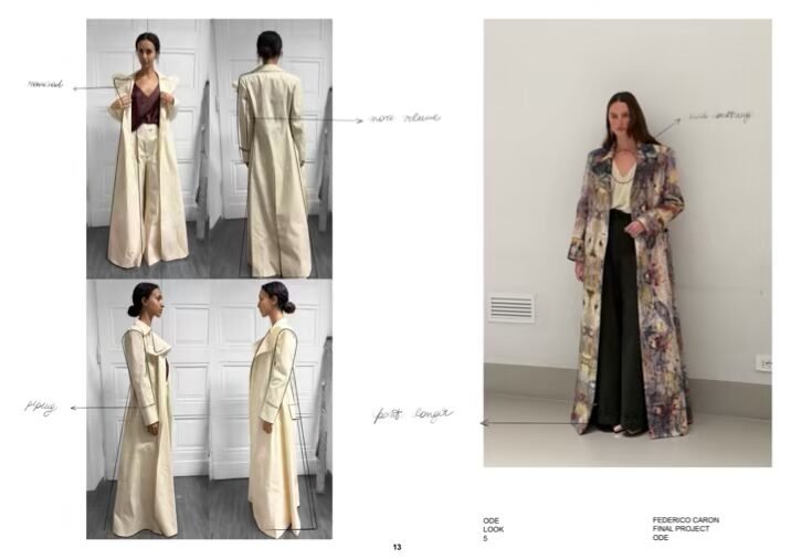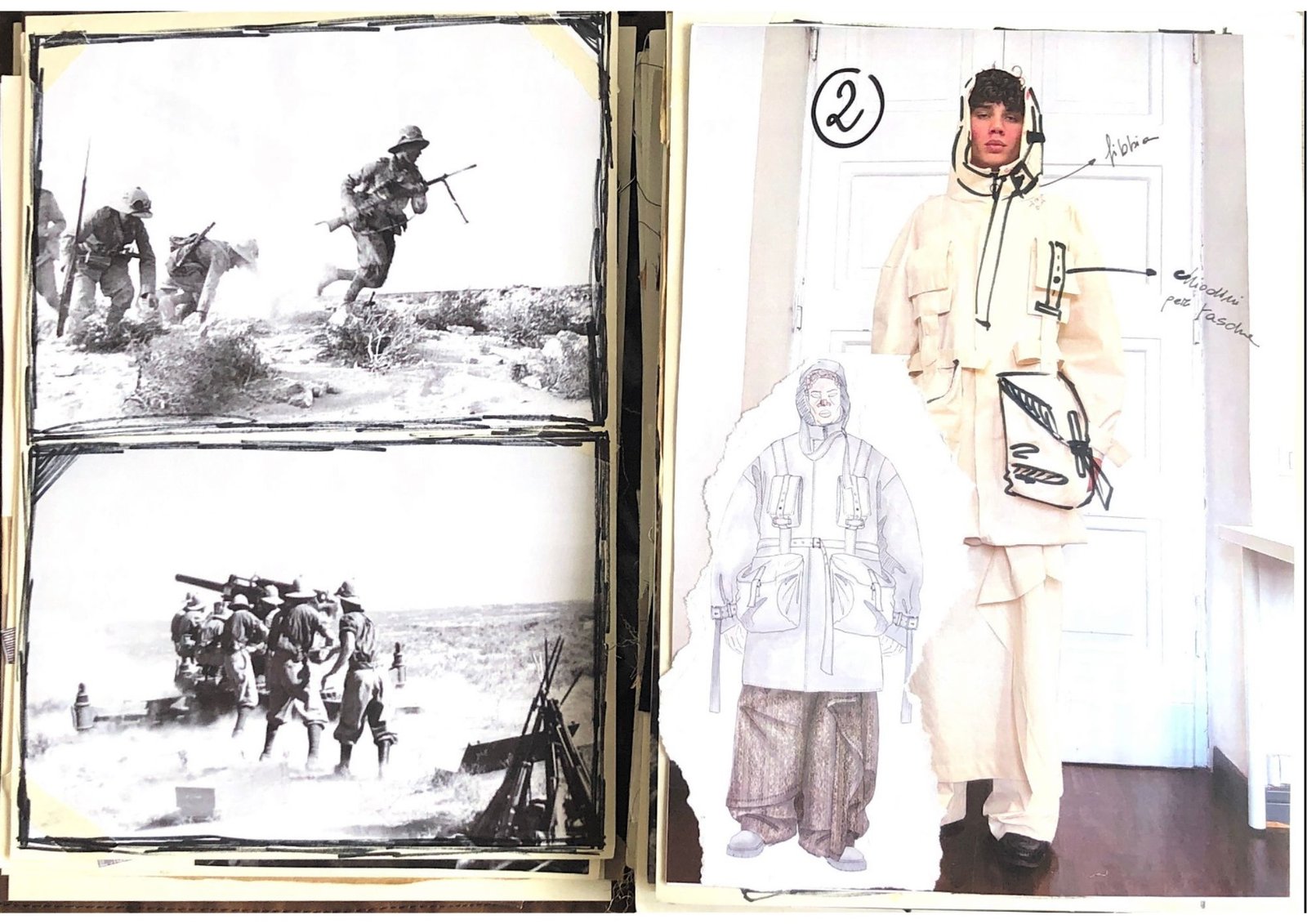 Benedetta Boidi’s collection is inspired by the concept of nomadism, explored through both a historical and iconographic investigation and a reflection on its evolution into the present day, creating a dialogue between past and future. Materiality plays a central role, with a focus on durable fabrics such as leather, alongside shearling and upcycled fur, combined with resin-coated cotton, jersey, and vintage-effect denim. Colour is equally significant, particularly in look one, where three different tones are intentionally combined. Collaborations with industry companies such as Goretti, for leather weaving and stud applications, and Wash Italia, for washed denim with a vintage finish and faux leather detailing, further shaped the work. Through these processes, the collection reflects a continuous exchange between materials, cultures, and time, shaping garments as evolving, nomadic identities. What concerns Boidi most about the contemporary fashion system is the increasing centralisation of creative power within large conglomerates, where brand identity appears shaped more by commercial imperatives than by genuine creative vision, and the pressure to constantly produce risks overshadowing experimentation and research. She is also unsettled by the speed at which the system now operates, with accelerated production cycles and continuous collections leaving little room for reflection and depth. Yet this awareness is exactly what drives her: she enters the field with clarity and intention, fully conscious of its contradictions, believing strongly in the value of personal vision, in research as a necessary process, and in fashion as a form of critical and cultural expression.