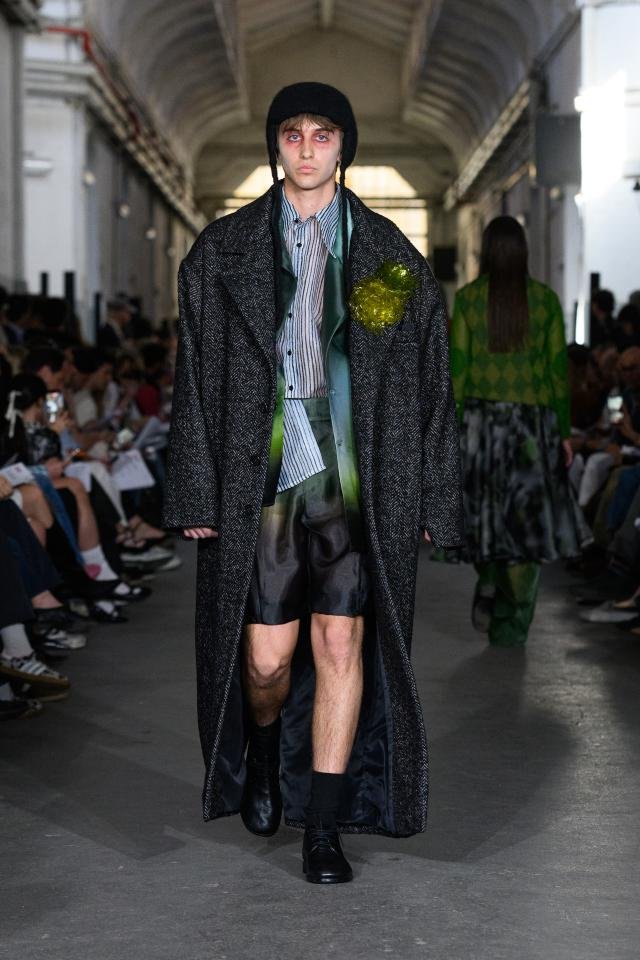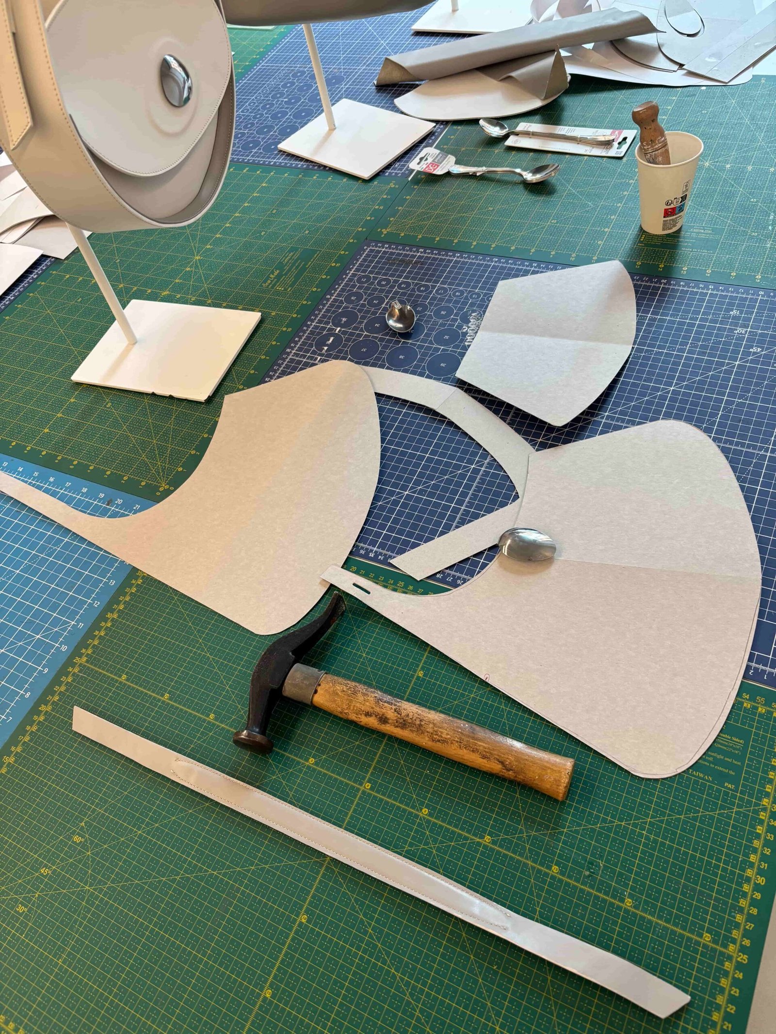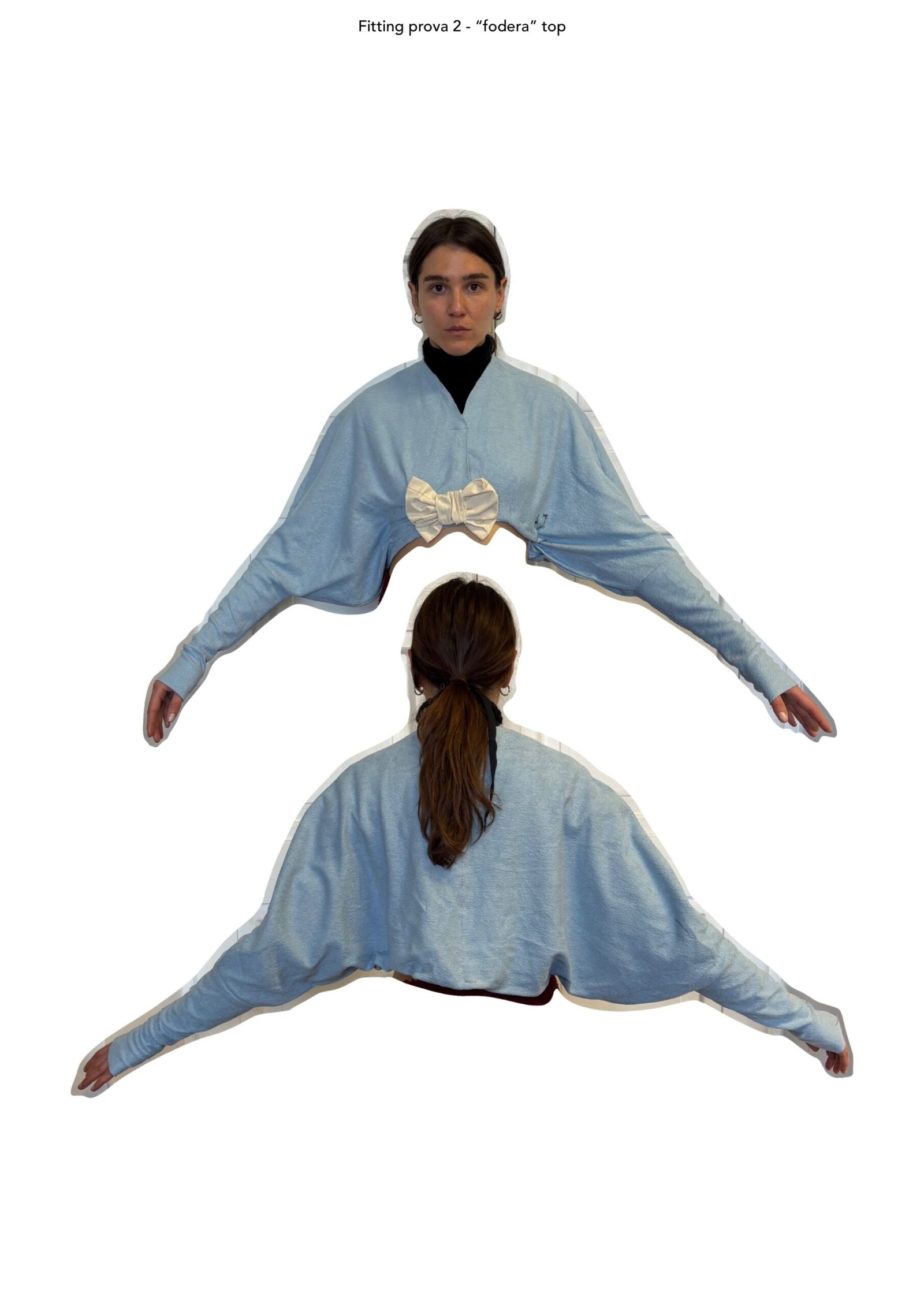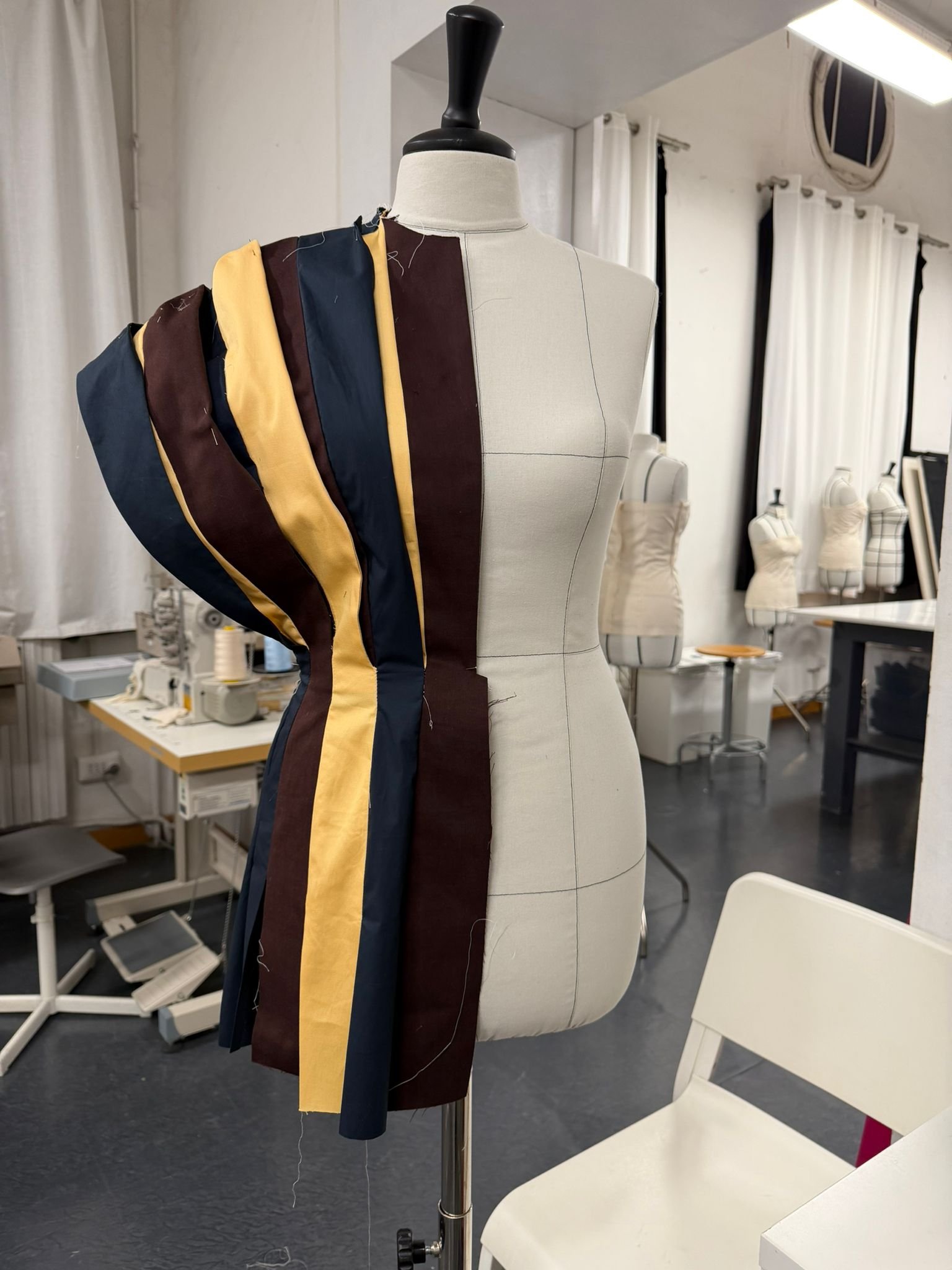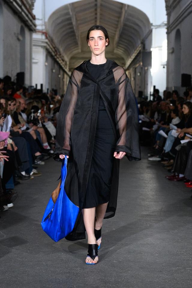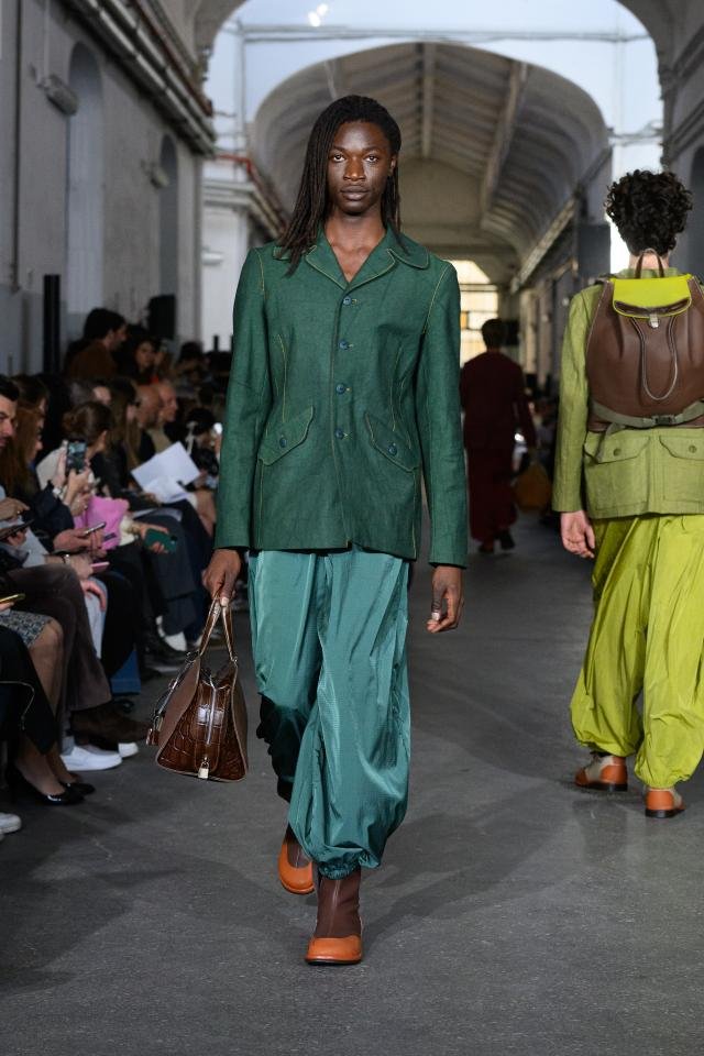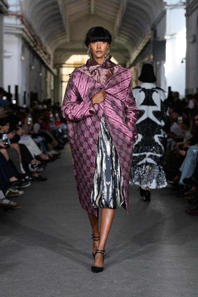 Benedetta Boidi’s collection is inspired by the concept of nomadism, explored through both a historical and iconographic investigation and a reflection on its evolution into the present day, creating a dialogue between past and future. Materiality plays a central role, with a focus on durable fabrics such as leather, alongside shearling and upcycled fur, combined with resin-coated cotton, jersey, and vintage-effect denim. Colour is equally significant, particularly in look one, where three different tones are intentionally combined. Collaborations with industry companies such as Goretti, for leather weaving and stud applications, and Wash Italia, for washed denim with a vintage finish and faux leather detailing, further shaped the work. Through these processes, the collection reflects a continuous exchange between materials, cultures, and time, shaping garments as evolving, nomadic identities. What concerns Boidi most about the contemporary fashion system is the increasing centralisation of creative power within large conglomerates, where brand identity appears shaped more by commercial imperatives than by genuine creative vision, and the pressure to constantly produce risks overshadowing experimentation and research. She is also unsettled by the speed at which the system now operates, with accelerated production cycles and continuous collections leaving little room for reflection and depth. Yet this awareness is exactly what drives her: she enters the field with clarity and intention, fully conscious of its contradictions, believing strongly in the value of personal vision, in research as a necessary process, and in fashion as a form of critical and cultural expression.