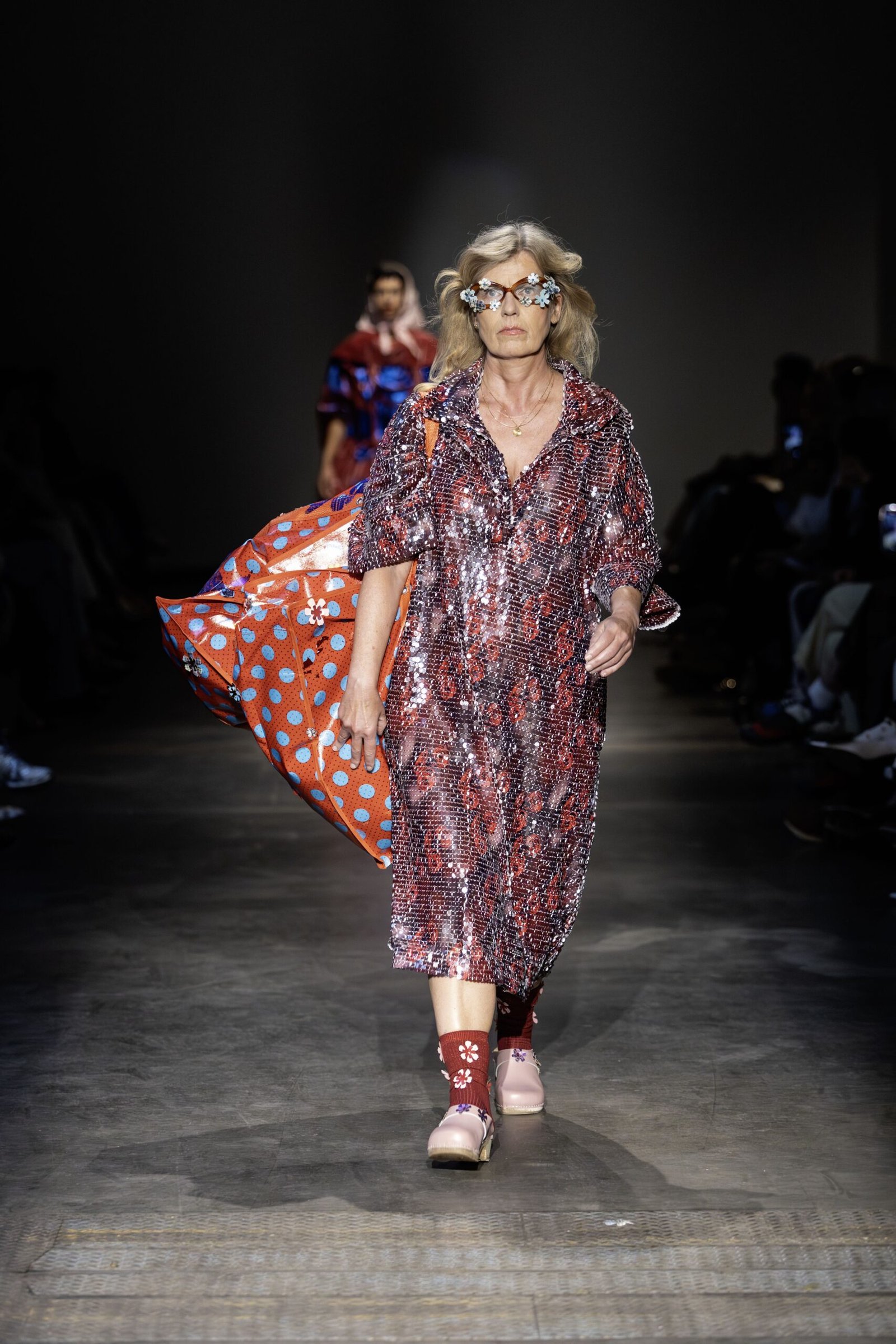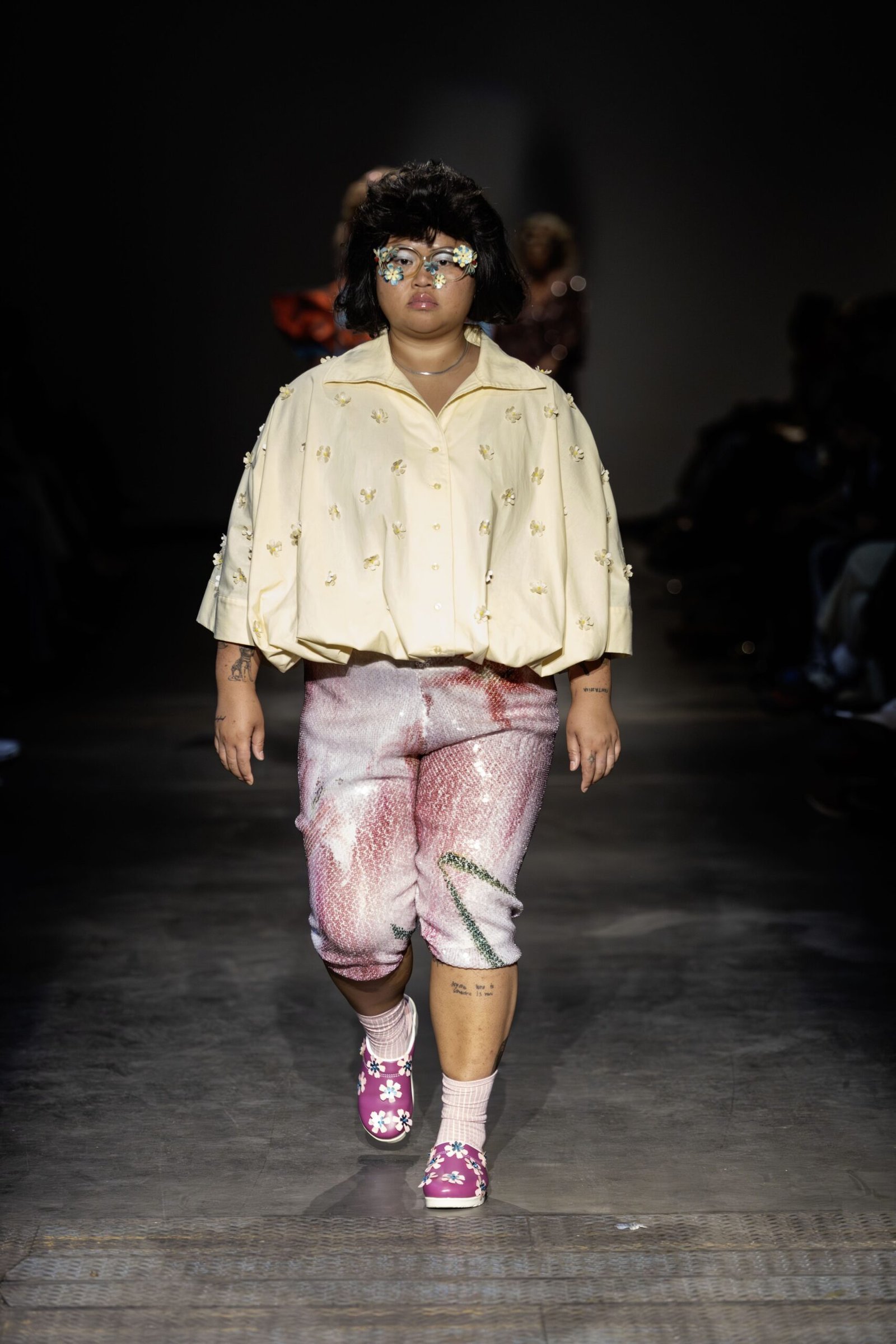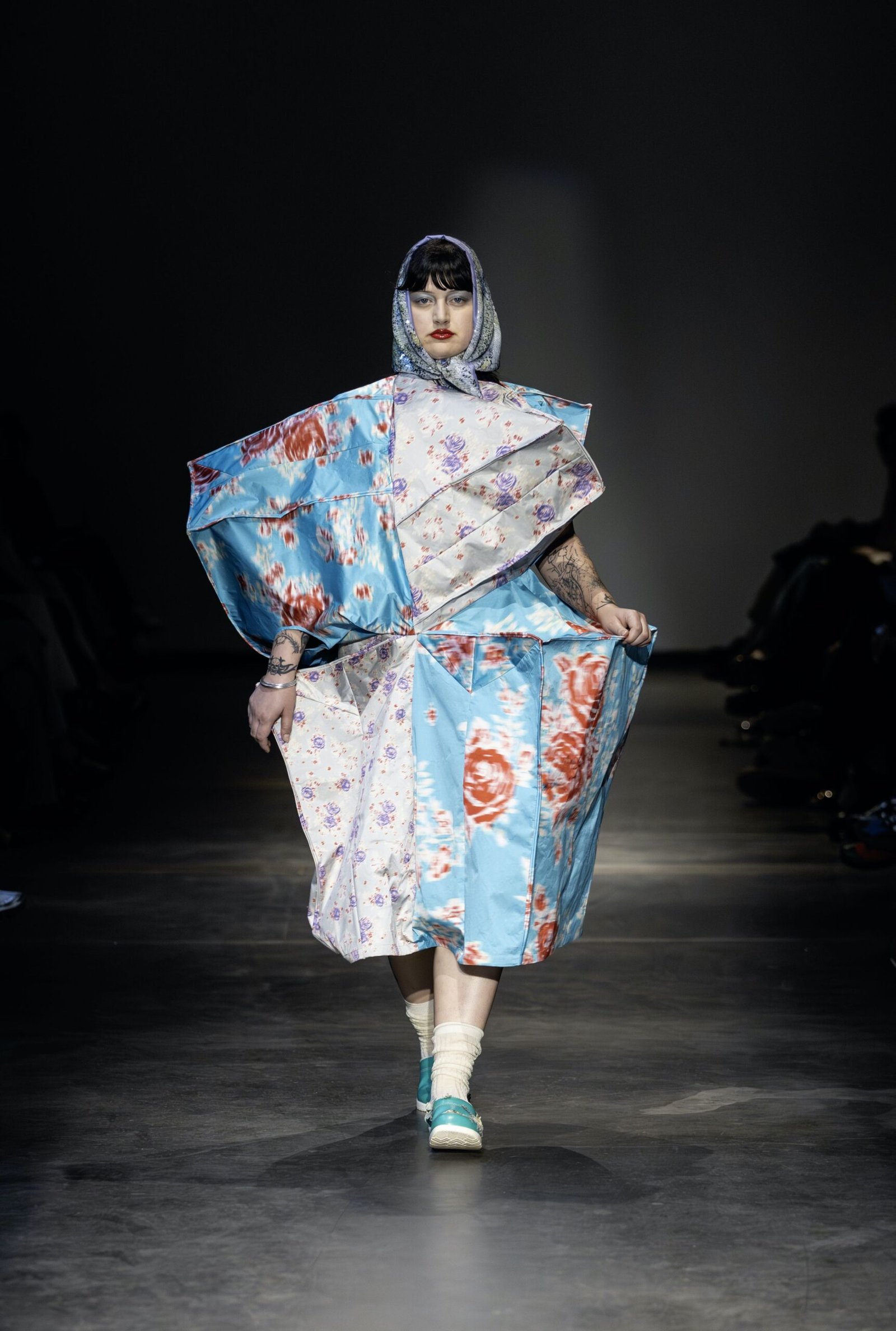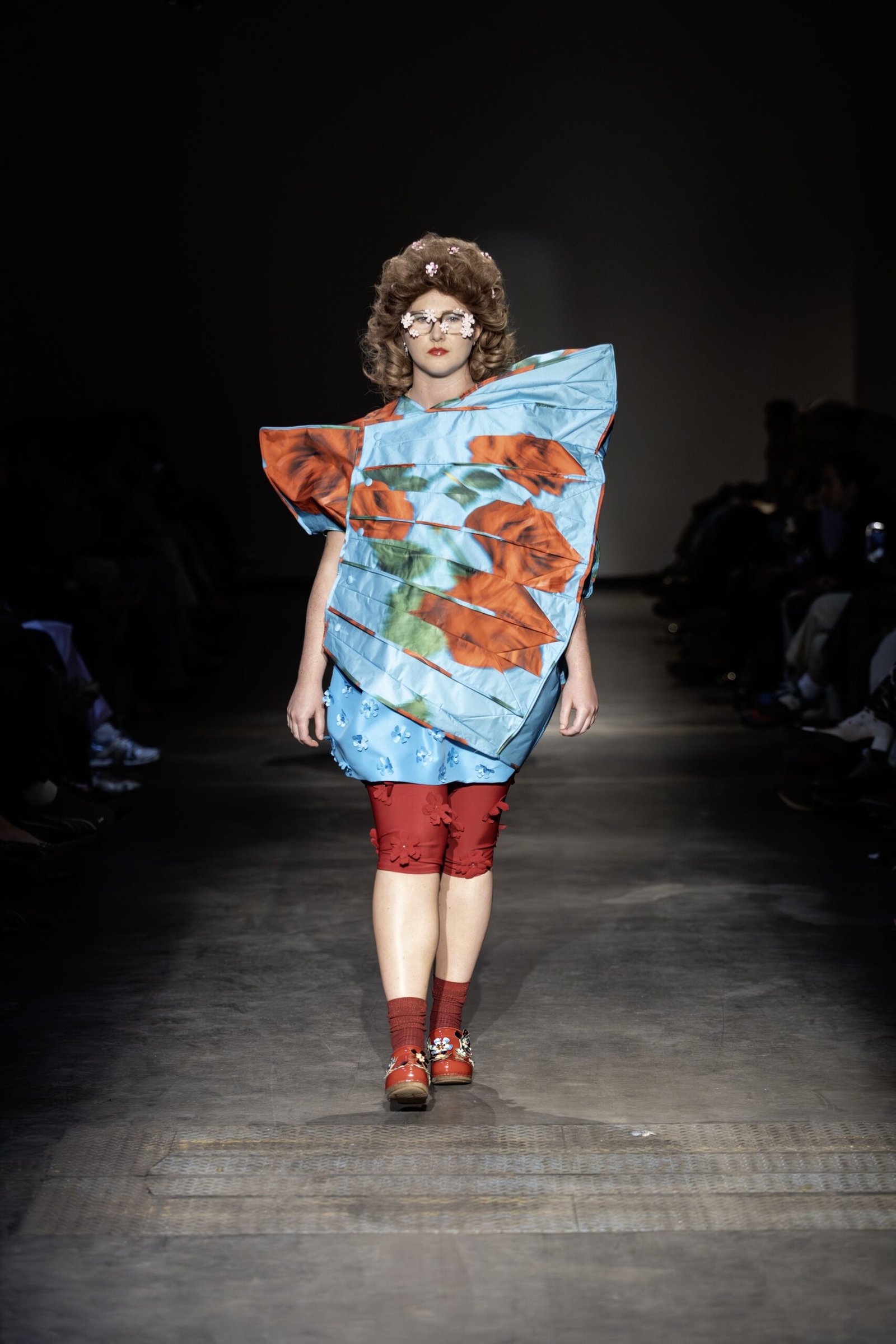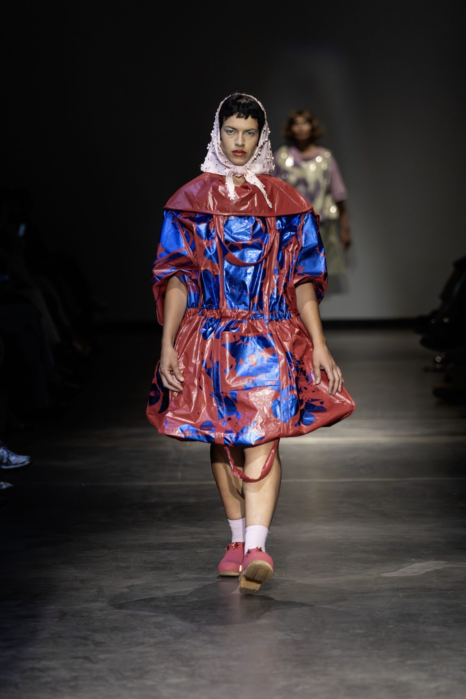 This collection combines vibrant florals, shine, and embellishment to translate the spirit of these women into a tactile language. Flowers – central to their wardrobes and culture – appear through laser-cut appliqué, foil prints, photographic prints, prints on sequins, and beading. Market bags inspired both silhouettes and materials, with plastic-coated textiles, shiny “tacky” surfaces, and kitchen tablecloths used to hold the voluminous shapes. I wanted to evoke the sensory richness of markets and banquet halls – spaces full of abundance, texture, and joy that celebrate community and togetherness.