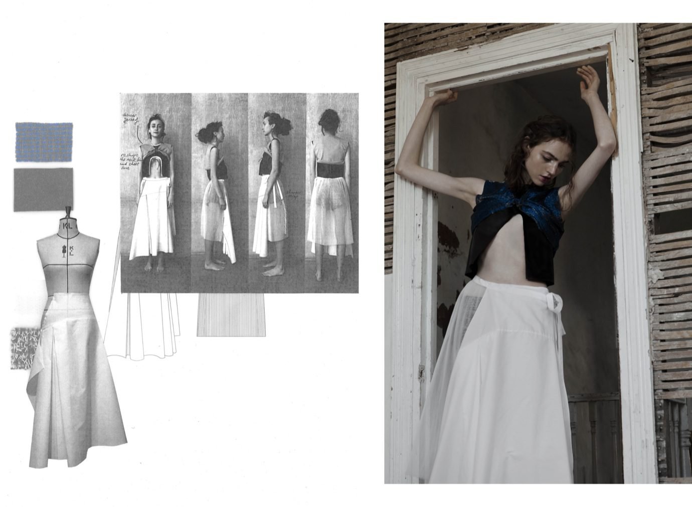 It focuses a lot on working in sketchbooks and making illustrations. Especially I enjoy drawing directly on toiles and white garments; it helps me to think about garment constructions. I also like to get inspired by looking at fine art installations, paintings and books before I begin to sketch.