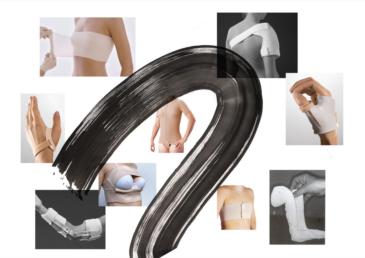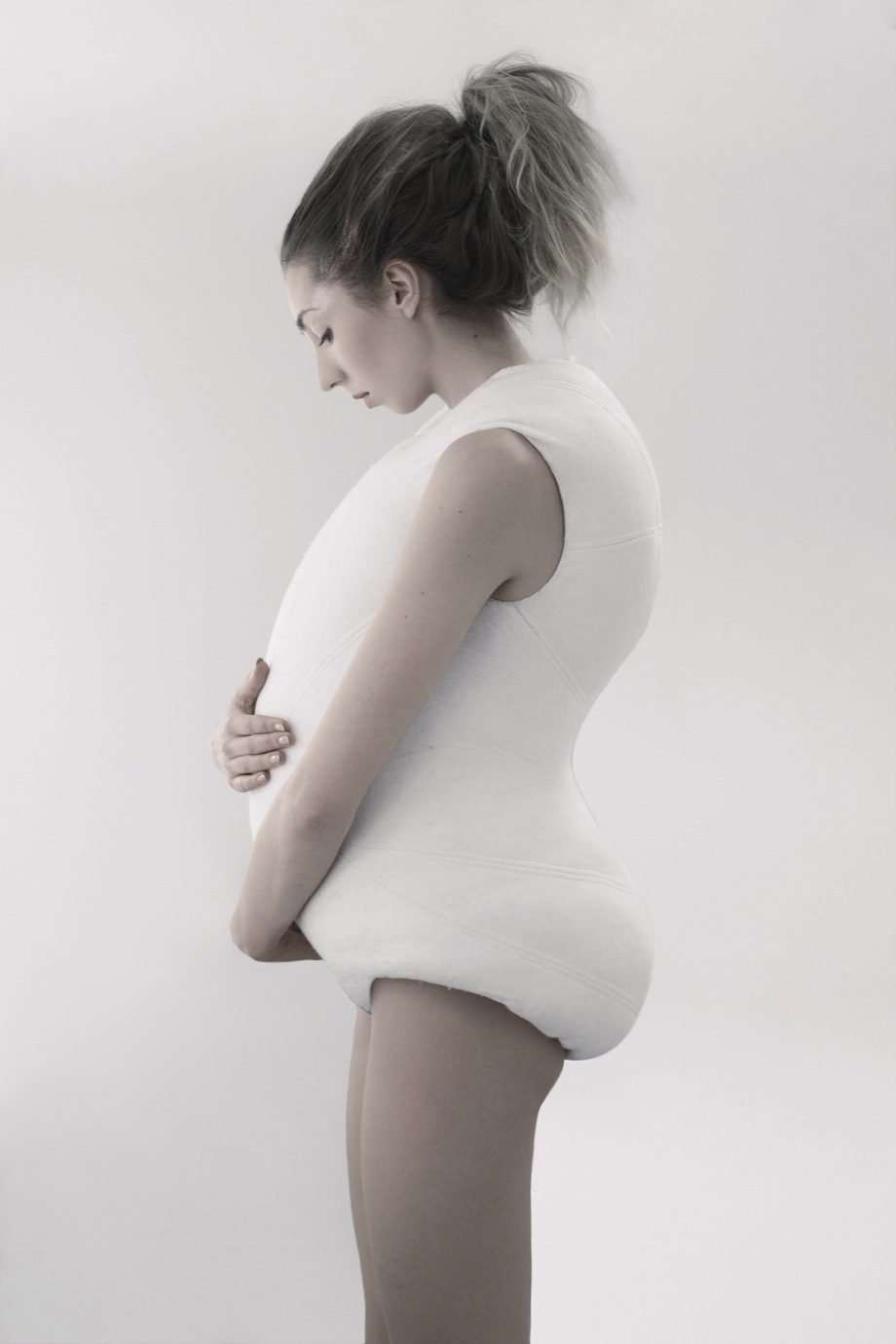 The trait also appeals for how it has influenced the core theme of her MA collection: a melding of dichotomies. On one side of the moodboard sits a clean, conceptual and reasonably commercial girl, represented in the neutral colours and negative space so pivotal to Emma’s references. On the other resides Sarah Lucas’ boldly coloured stockings, uncomfortable poses directed by Erwin Wurm and the bare skin inherent to Melanie Bonajo’s projects. “Collaging plays a really important role in my design process,” she explains. “It helped me to work out balance and proportion in my work – not only in terms of the garment itself, but also looking at negative space. Keeping the balance of this between my original collages and the final look was key.”