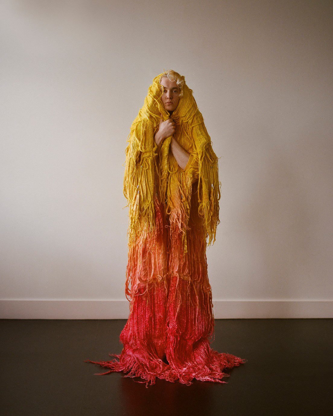 Alongside this practical approach, Xiang also considered different artistic techniques such as wood block printing and sketching, to investigate how certain artists have drawn people in the past, and to examine how to build a 3D vision on something flat. This made Xiang think about how she could personally use knitting techniques in order to “present the feeling of drawing in knit,” as well as the volume of the garments themselves. As a knitwear student, yarn was essential to her creations, but for this body of work, Xiang has put a special emphasis on colour. She started to draw clothes with her own drawing style and printed these life-size drawings of dresses on paper and put them on models. The end result of her collection came from this experimentation, and manifested in seven dresses that present different kinds of clothing and drawing.
