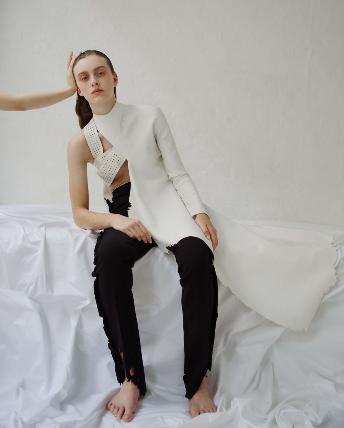 Lin’s quiet confidence exudes the more you get to know her and while majority of the world is fixated on keeping up with trends, Lin thinks how you dress isn’t as important as how you move with and in it. “Through the garment, I see you. It’s a layer of you that you are showing to the world.” While she was constantly questioning what defined her and her style since her year at CSM, she was frequently frustrated at having parts of her ideas lost in translation. Lin would draw inspiration from other works, be it performances or architecture, but there was always a certain part of ‘her’ missing. “Designing is honest. If your mind is not clear, your design will show it.” Yet it seemed to me that she had already subconsciously developed her own language over the years. A look over her past collections and immediately reveals a motif of hands. When asked if this was intentional or purely a coincidence, Lin laughed, “I don’t know what it was about the hands that intrigued me so, subconsciously. I was looking for an image that best summarized my very first collection. On hindsight, I think hands represent the body’s relationship with fashion to me.” An intimate and personal part of our body with the ability to communicate an infinite array of emotions to other people in a single gesture, the hands are Lin’s way of communicating her multitude of ideas beyond the corporeal. “You can present on the body but it doesn’t have to be on the body itself; you can define what the body is.”