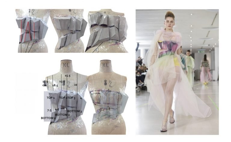 Her research process centred on finding a pure, subjective material—something intangible and related to personal experience, something not found in books—that would give voice to the intimate encounters between our bodies and our clothes. Her primary visual references were a collection of photographs and videos taken of her mother changing in her closet in Seoul. “I captured every moment of my mother’s movement in her closet because I really wanted to explore the body engaged in an intimate and private zone. My aesthetic is focussed on a mature woman and my mother is my mature idol,” she reveals. “Mature women like my mother have accumulated a closet across the various stages and moments of their lives; I find it fascinating, I can see characteristics that an individual has amassed,” says the designer, continuing with: “My mother always wears stockings whenever she goes out to work, but the looks she wears in public are very different from what she wears at home. She likes clothes that are made from intimate, comfortable, fragile fabrics, like silk. At home, she dresses in a very feminine manner, but wears more tailored, masculine garments when she goes out. Through my collection, I really wanted to express the unclear boundaries between these two styles of dress.”