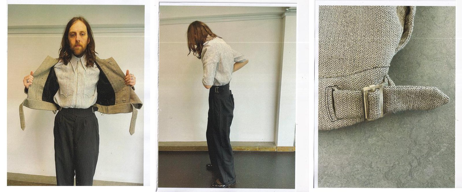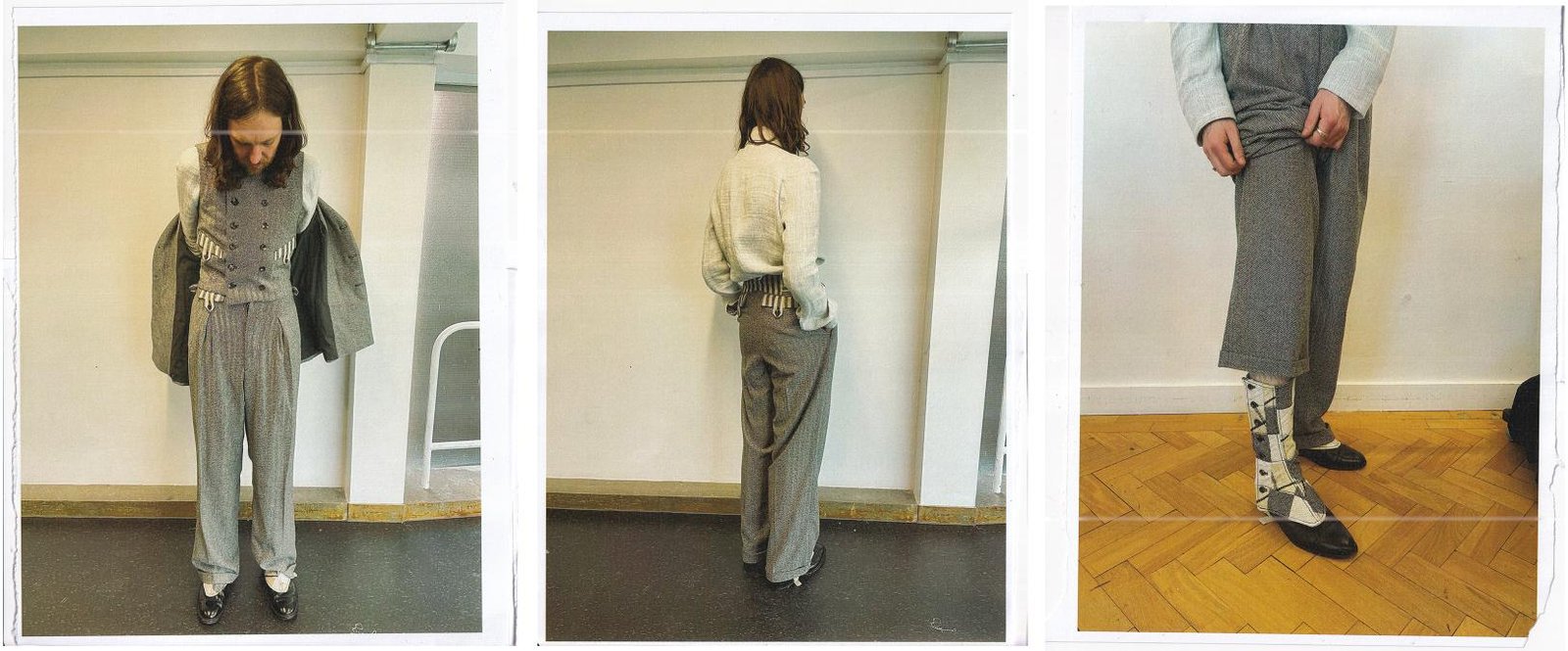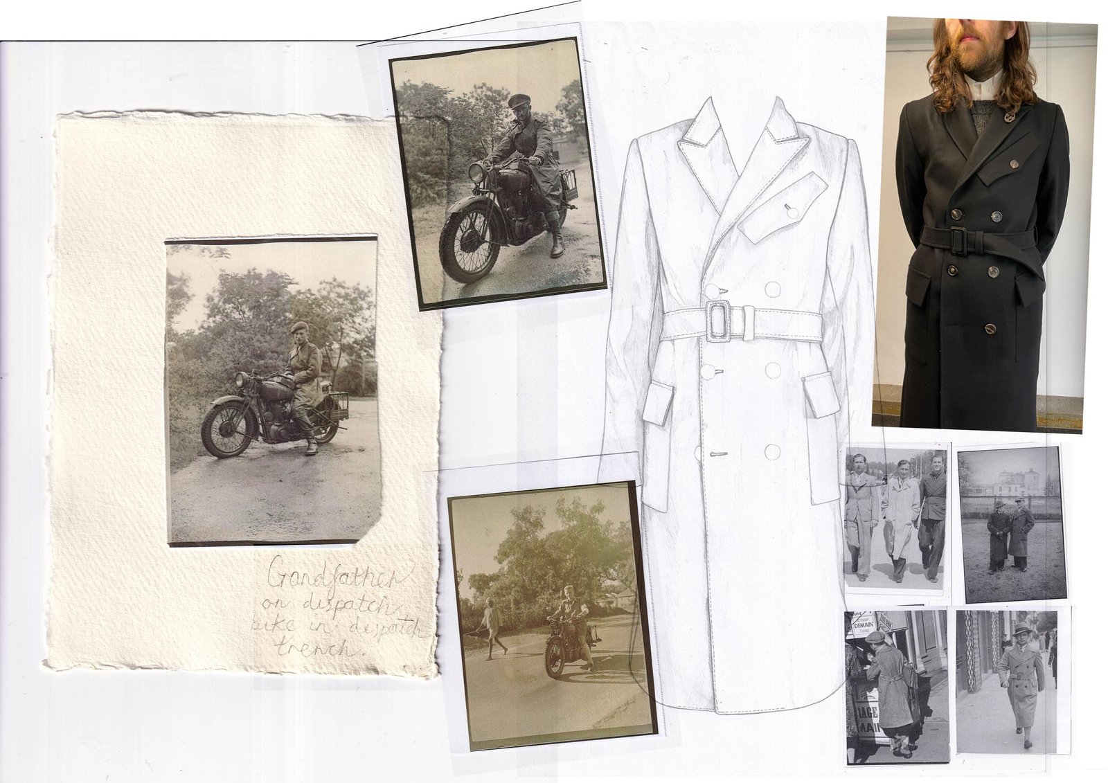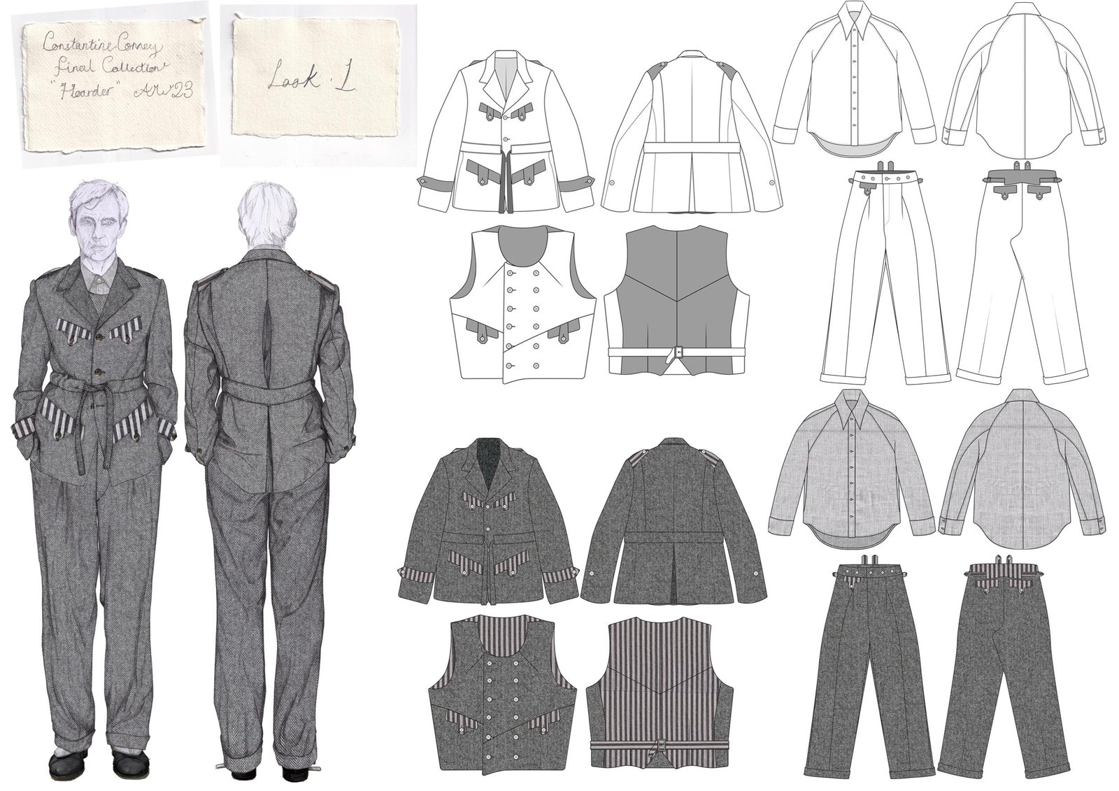 Extending beyond clothing, Cono collaborated with his friend, Solomon Upton-Jubber, to create a fragrance to complement his graduate collection. Inspired by the smells of his grandpa’s house, as well as scents that evoked his life experiences during the second World War, fresh sea scents juxtaposed more pungent, murky undertones. This incorporation of scent gave Cono’s collection a distinctive edge, serving as a means to further evoke the storytelling within his designs.