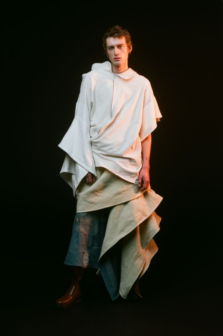 Technique was important, it became such a personal collection that I wanted everything to be as close to me as possible. I wanted the fewest degrees of separation possible between me and the outcome. I was lucky to get on so well with my helpers, and I knew they were invested in it and understood why everything had to be so delicate and considered. They got even better than me at making the flowers. I don’t think you need to stay away from vivid colours if you’re doing a collection with a sad theme. I think the colours were important. I’m not somebody who likes to let negative things affect me too much, I try to keep my environment colourful and happy even if horrible stuff is on my mind. I guess it’s a coping mechanism. From all my research and sketchbook work I was imagining there would be a lot more blue in the collection but there is blue in every look, even if it’s just a small bit. It’s a very specific tone which I think is very evocative of all that I was trying to say. It’s the whole ‘blue-for-a-boy’ trope, blue for sadness, blue for a clear sky.