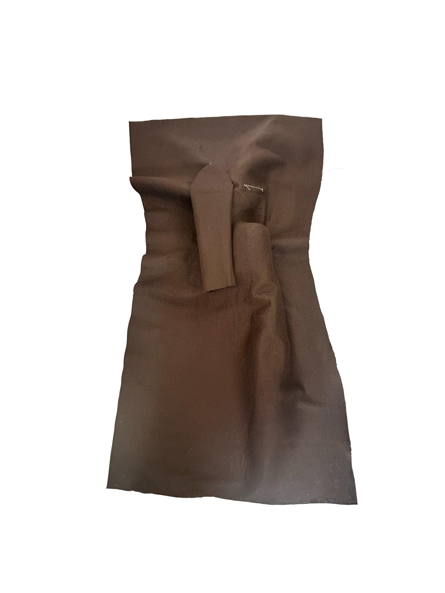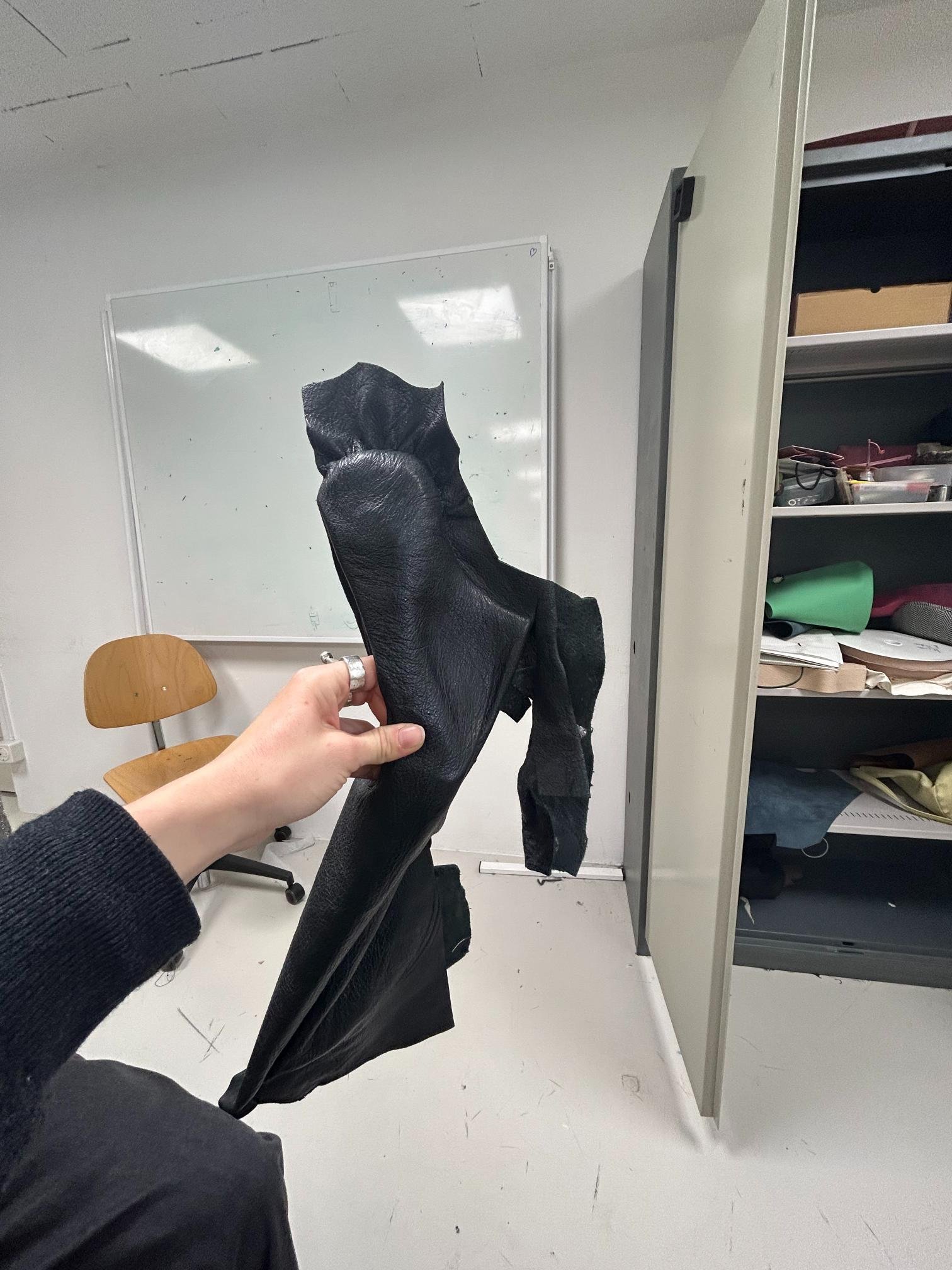I worked with traditional tailoring methods and avoided glued fusibles, using hand-reinforcement instead. I developed a technique that combines tailoring with millinery, which allowed me to build large volumes without any added structure. Pattern cutting also played an important role. I created one-piece patterns that form oversized bows when laid flat, which became a key symbol of the collection. Upcycling is central to the work. I repurposed T-shirts and fabrics found in Brussels, including discarded robrak. One skirt was built entirely through knots rather than seams. I also used a range of leather techniques throughout the collection.