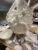 To create the texture, I manipulated damp tablecloth fabric around broomsticks and allowed it to set in place, producing curled forms with pleated crease details. The exaggerated volume of the skirt and sleeves is contrasted with a sleek, minimal top that accentuates the asymmetric waistline. This clean, clinical upper silhouette is intended to juxtapose the chaos, delusion, and hallucination expressed through the lower half of the look.