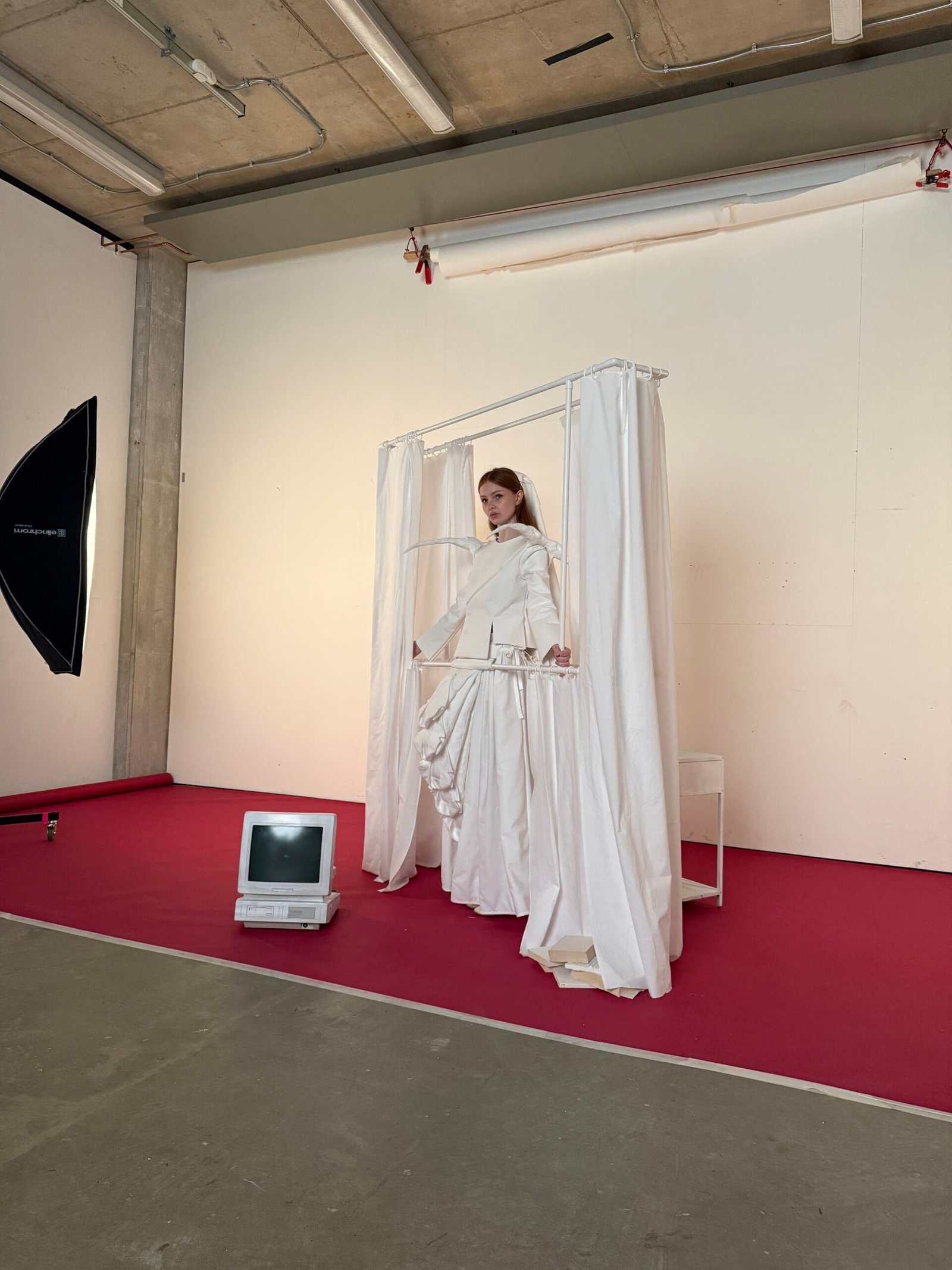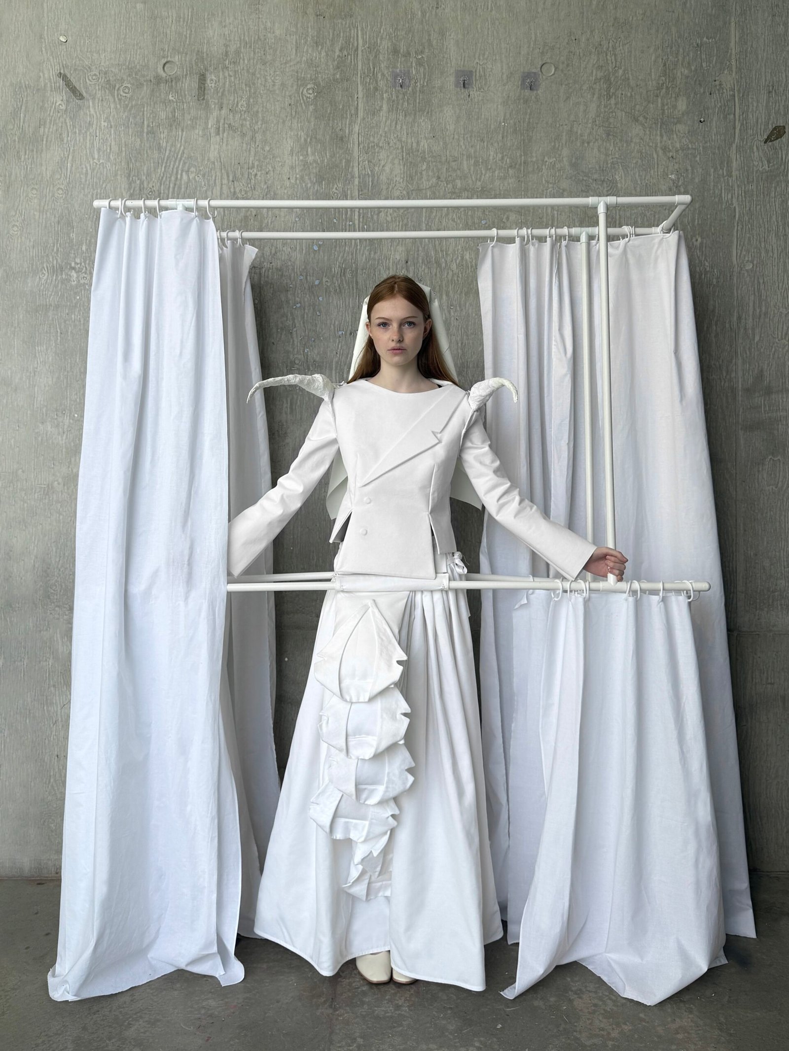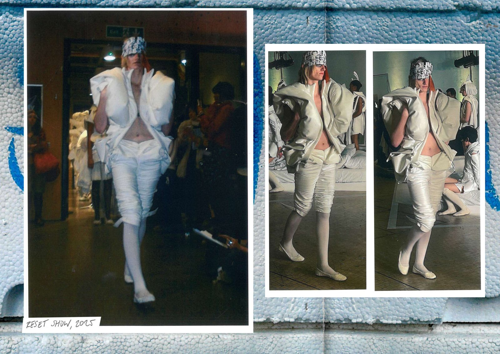 My Reset Show look explores the psychological effects of prolonged exposure to the colour white. Research revealed that extended immersion in white environments can cause perceptual distortion, delusion, and vivid hallucinations. These effects stem from extreme sensory deprivation, which forces the mind to overcompensate, warping one’s perception of reality.