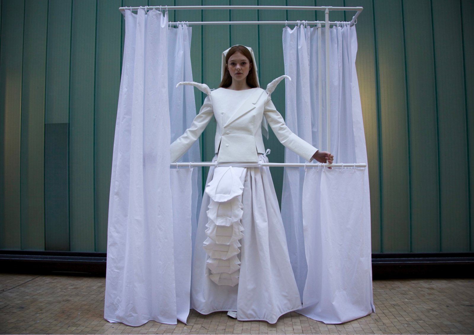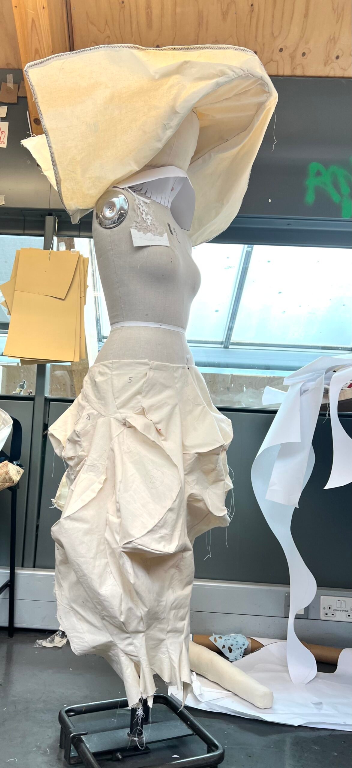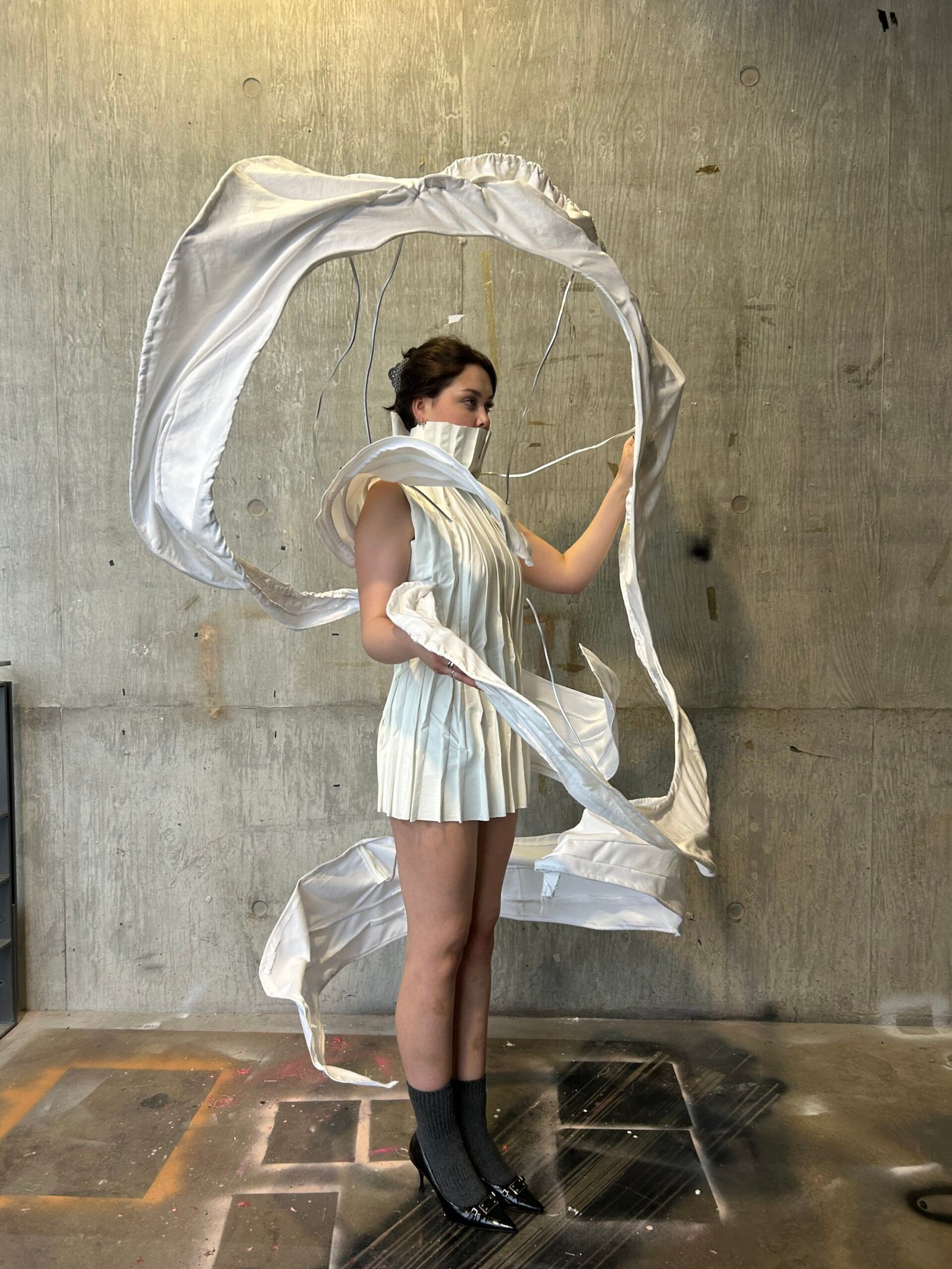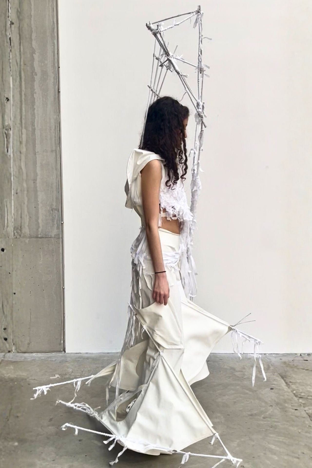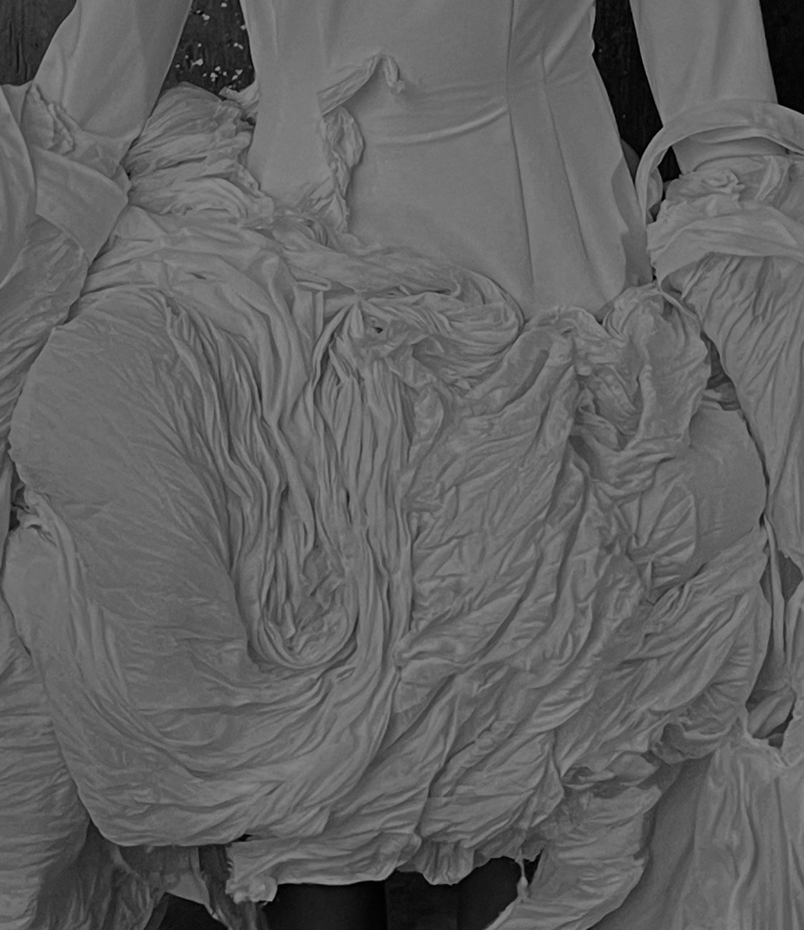 To create the texture, I manipulated damp tablecloth fabric around broomsticks and allowed it to set in place, producing curled forms with pleated crease details. The exaggerated volume of the skirt and sleeves is contrasted with a sleek, minimal top that accentuates the asymmetric waistline. This clean, clinical upper silhouette is intended to juxtapose the chaos, delusion, and hallucination expressed through the lower half of the look.