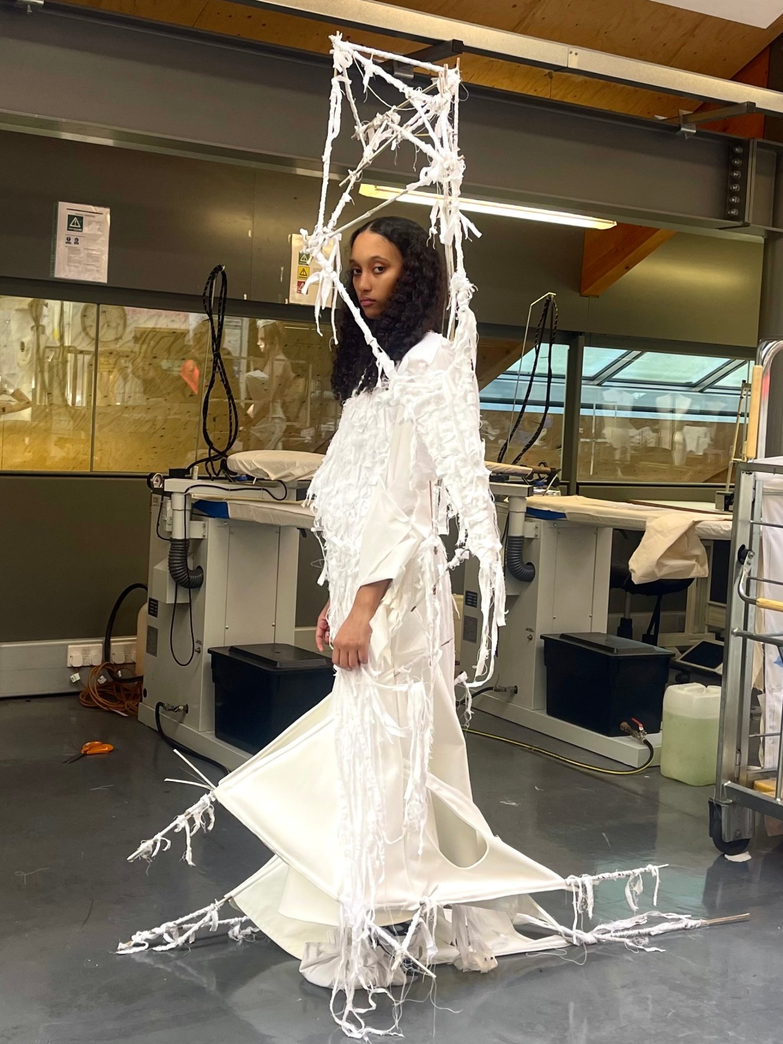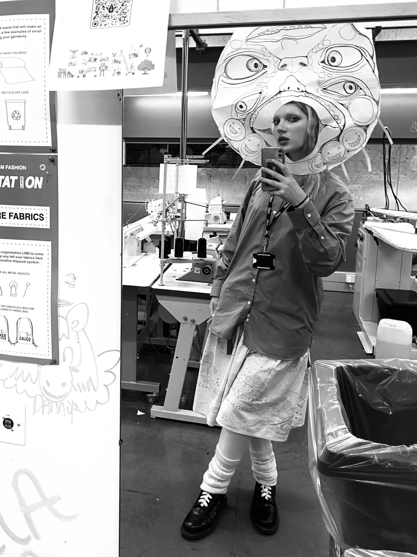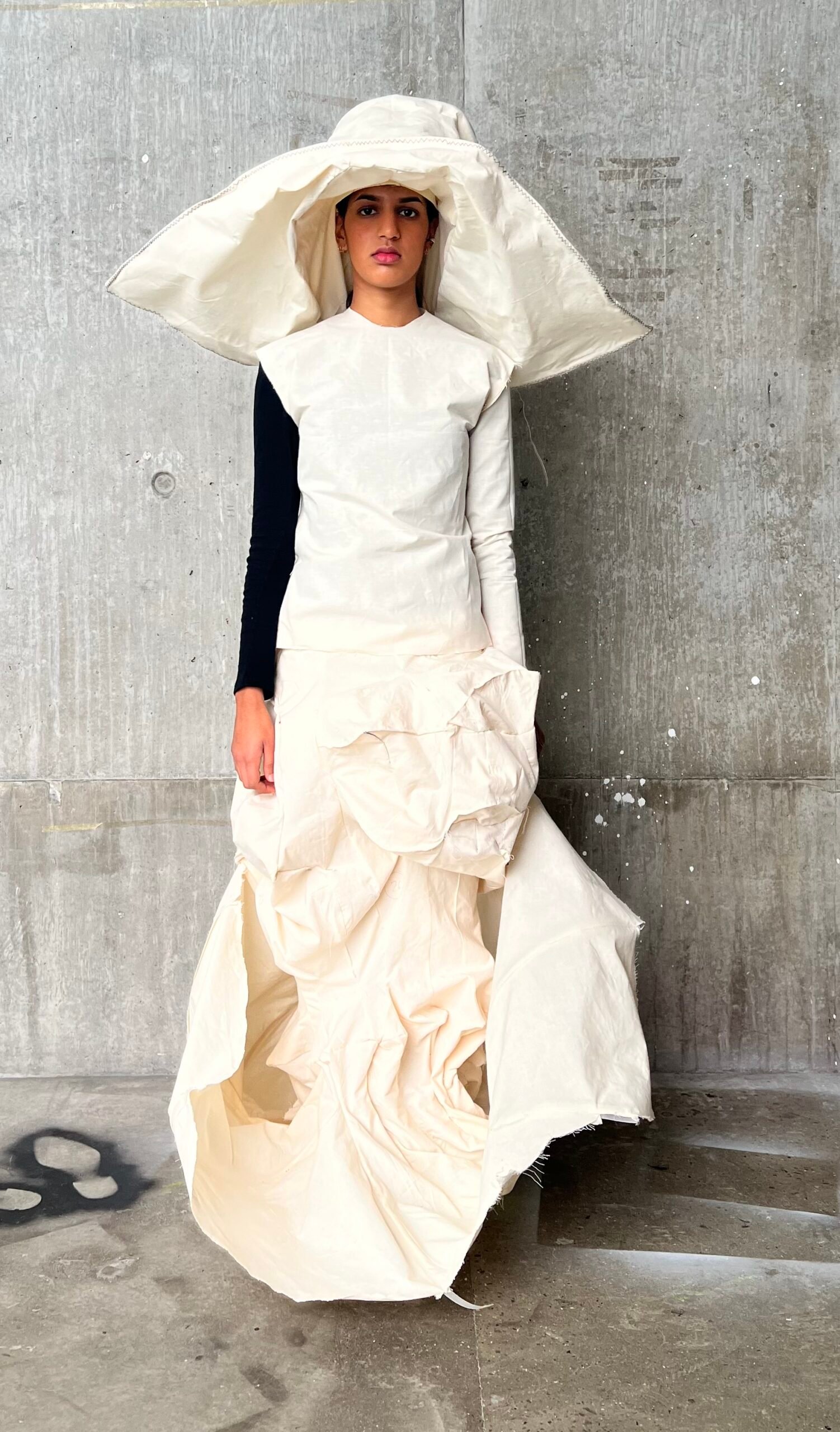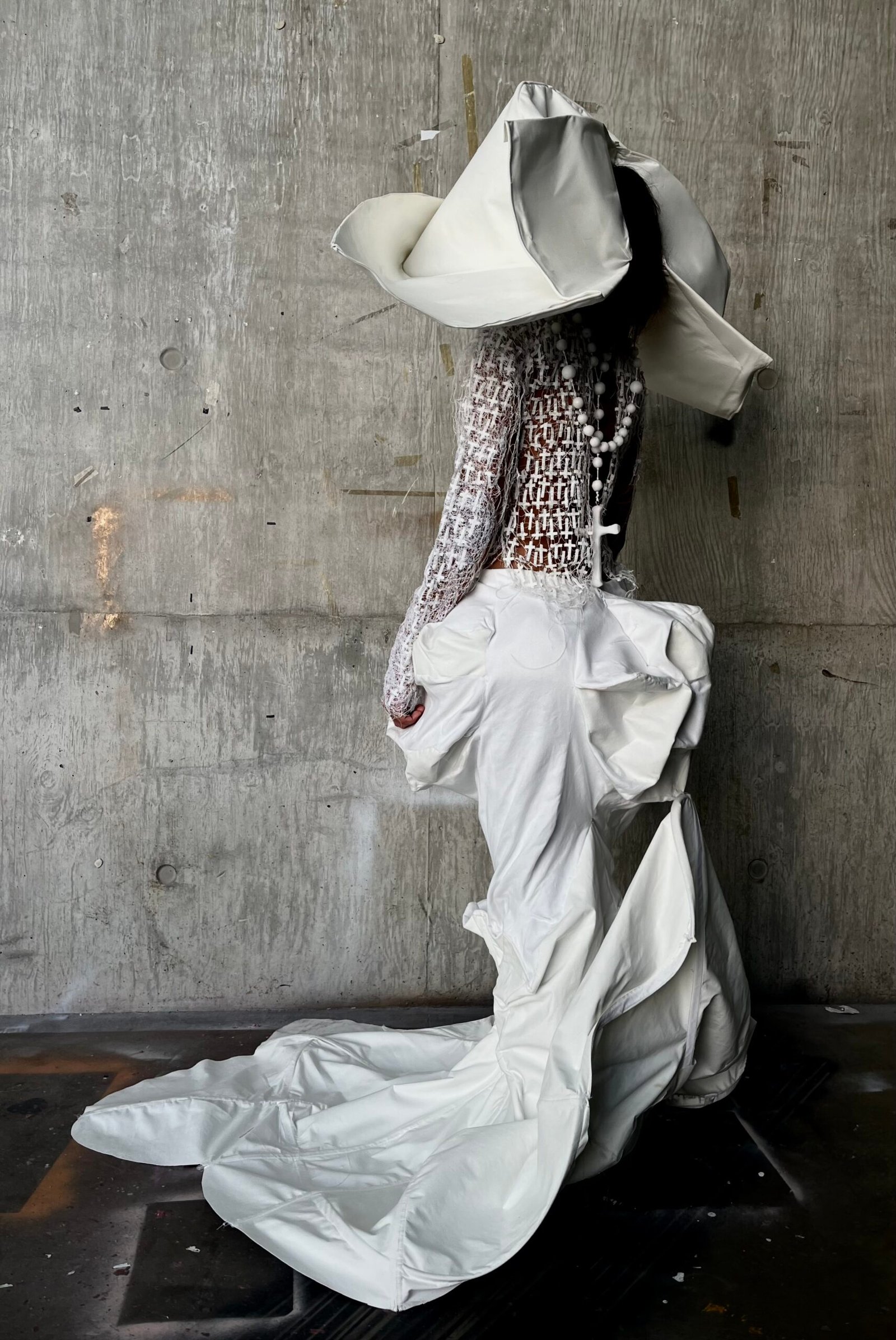 To create the texture, I manipulated damp tablecloth fabric around broomsticks and allowed it to set in place, producing curled forms with pleated crease details. The exaggerated volume of the skirt and sleeves is contrasted with a sleek, minimal top that accentuates the asymmetric waistline. This clean, clinical upper silhouette is intended to juxtapose the chaos, delusion, and hallucination expressed through the lower half of the look.