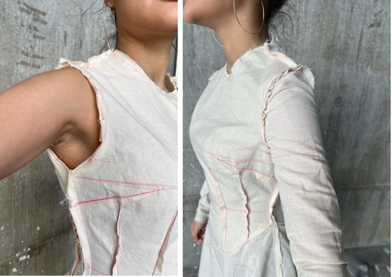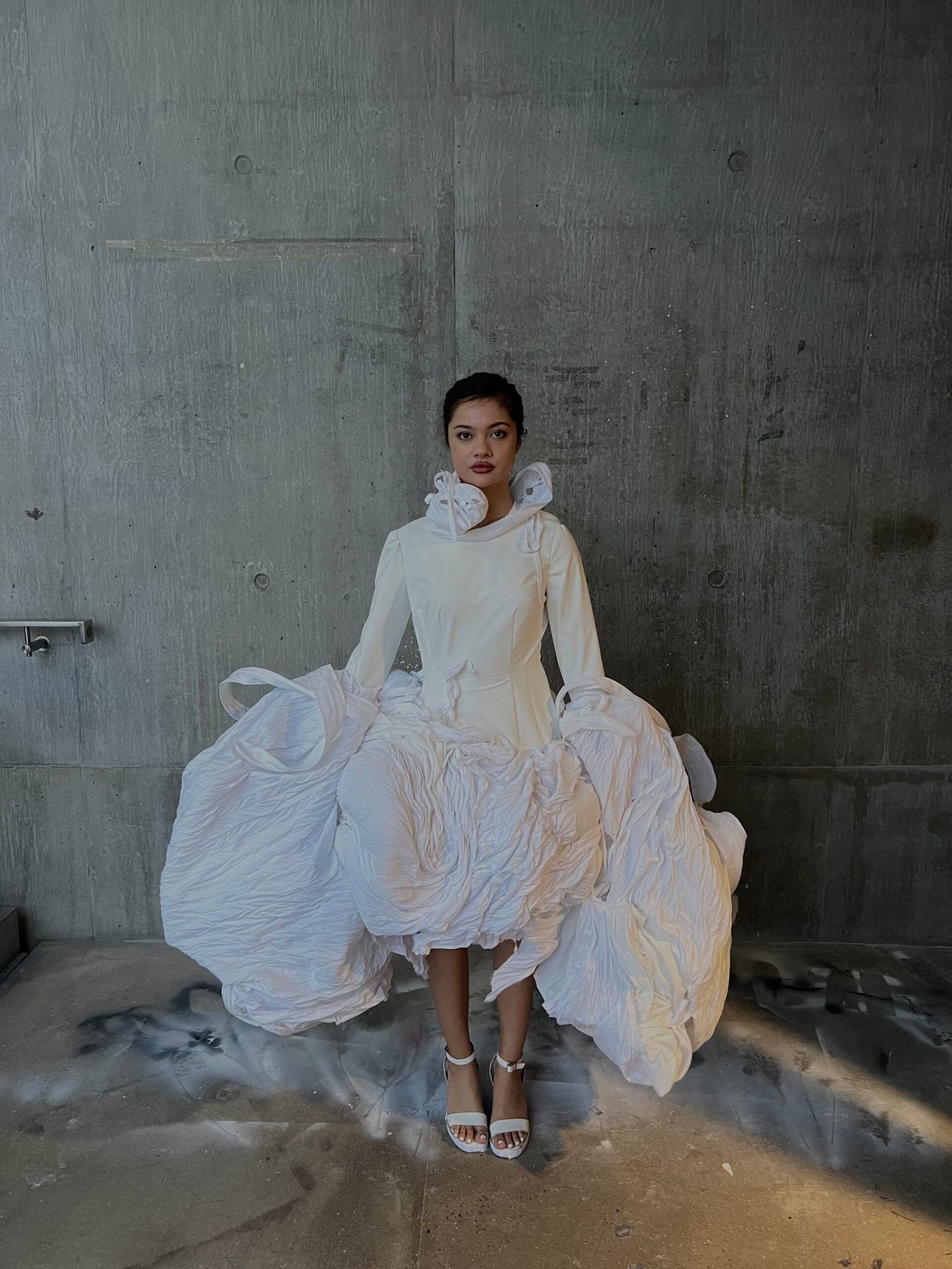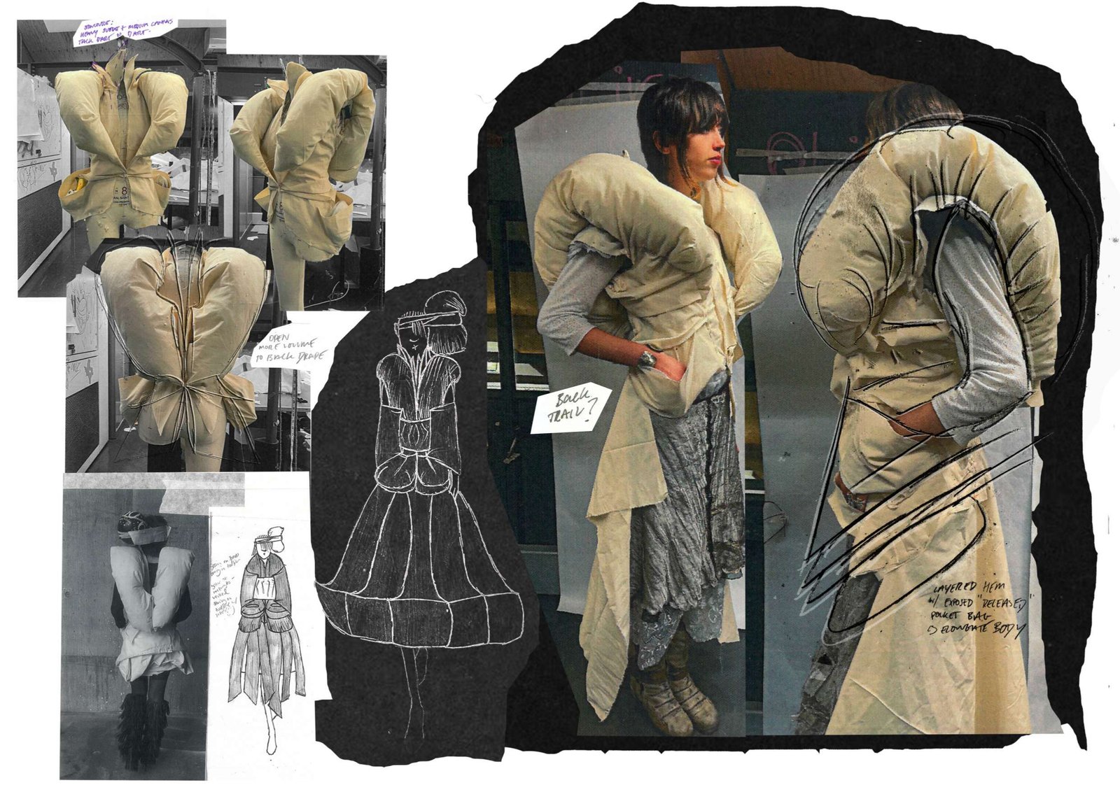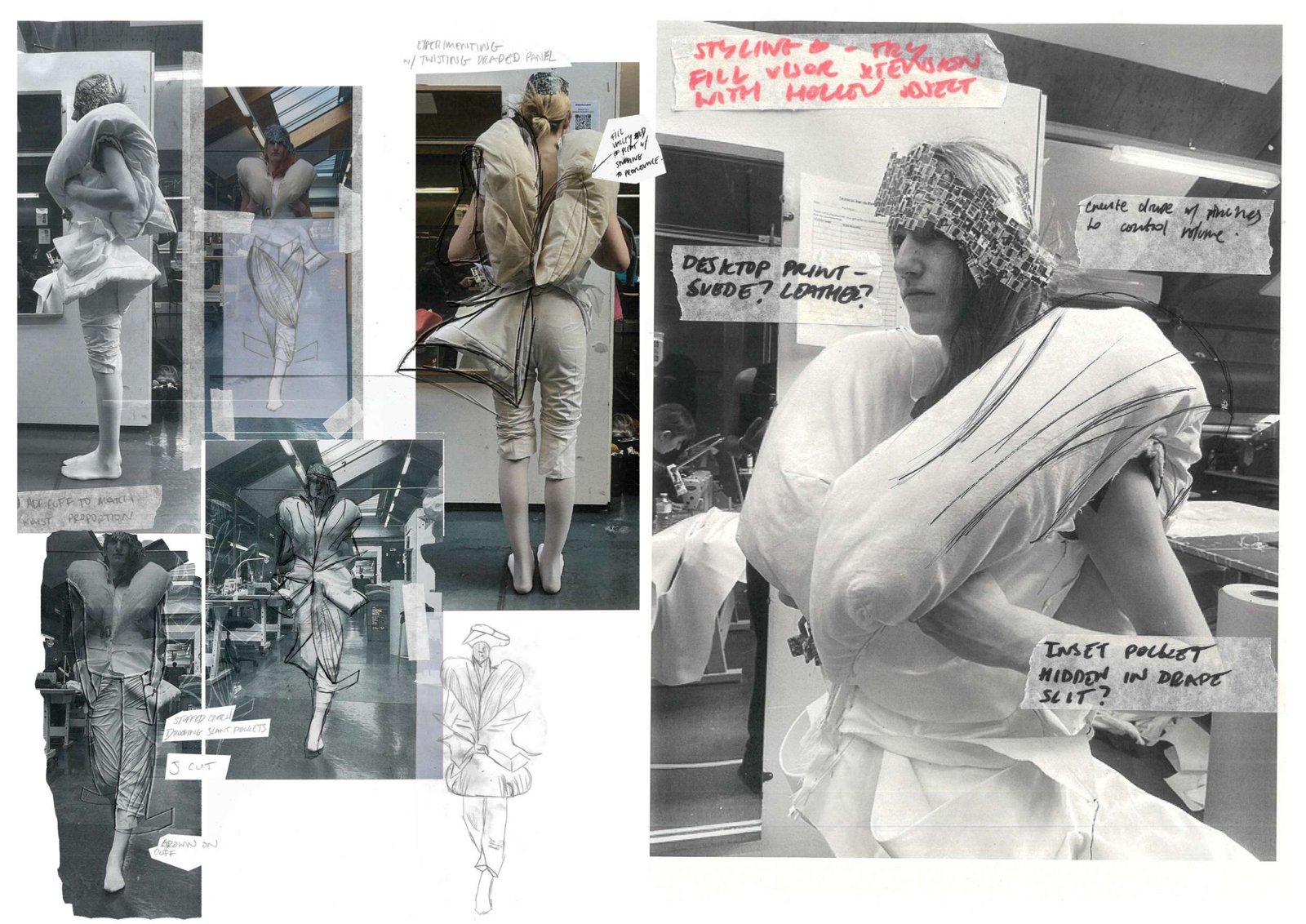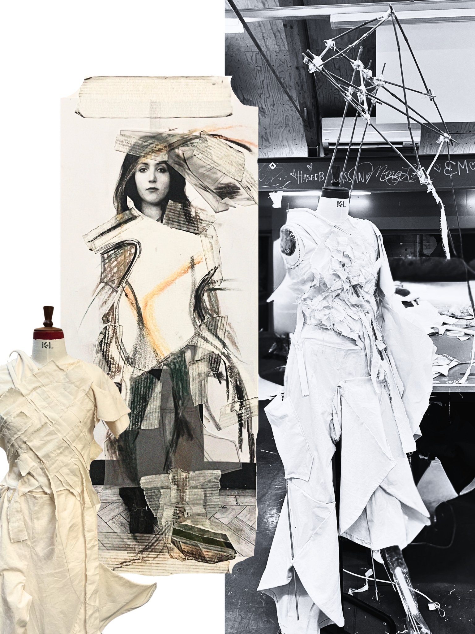 To create the texture, I manipulated damp tablecloth fabric around broomsticks and allowed it to set in place, producing curled forms with pleated crease details. The exaggerated volume of the skirt and sleeves is contrasted with a sleek, minimal top that accentuates the asymmetric waistline. This clean, clinical upper silhouette is intended to juxtapose the chaos, delusion, and hallucination expressed through the lower half of the look.