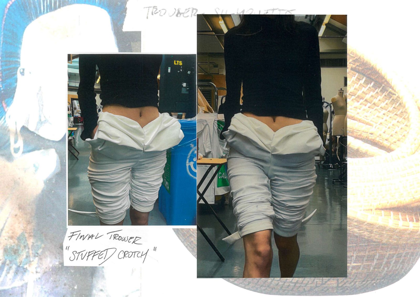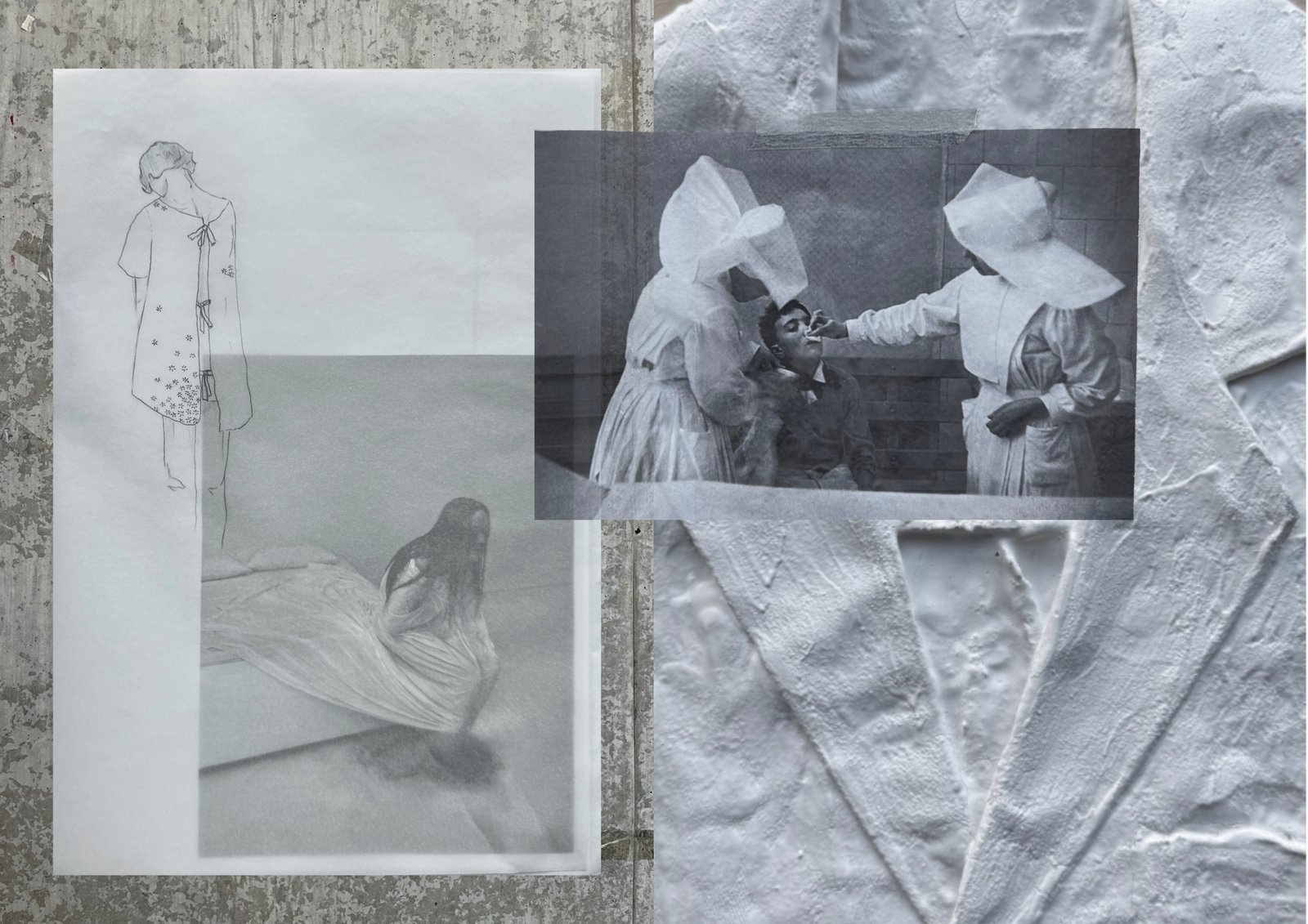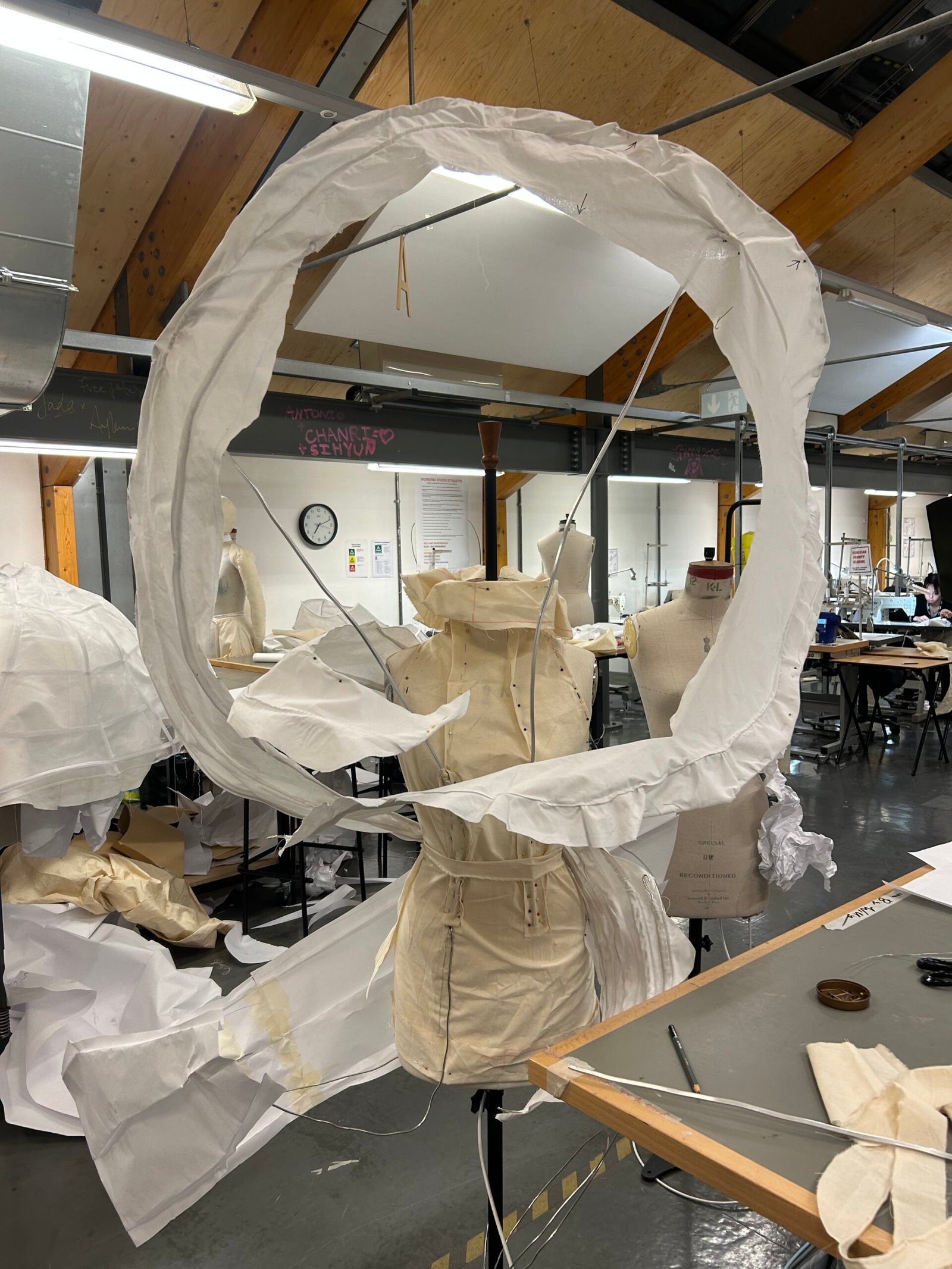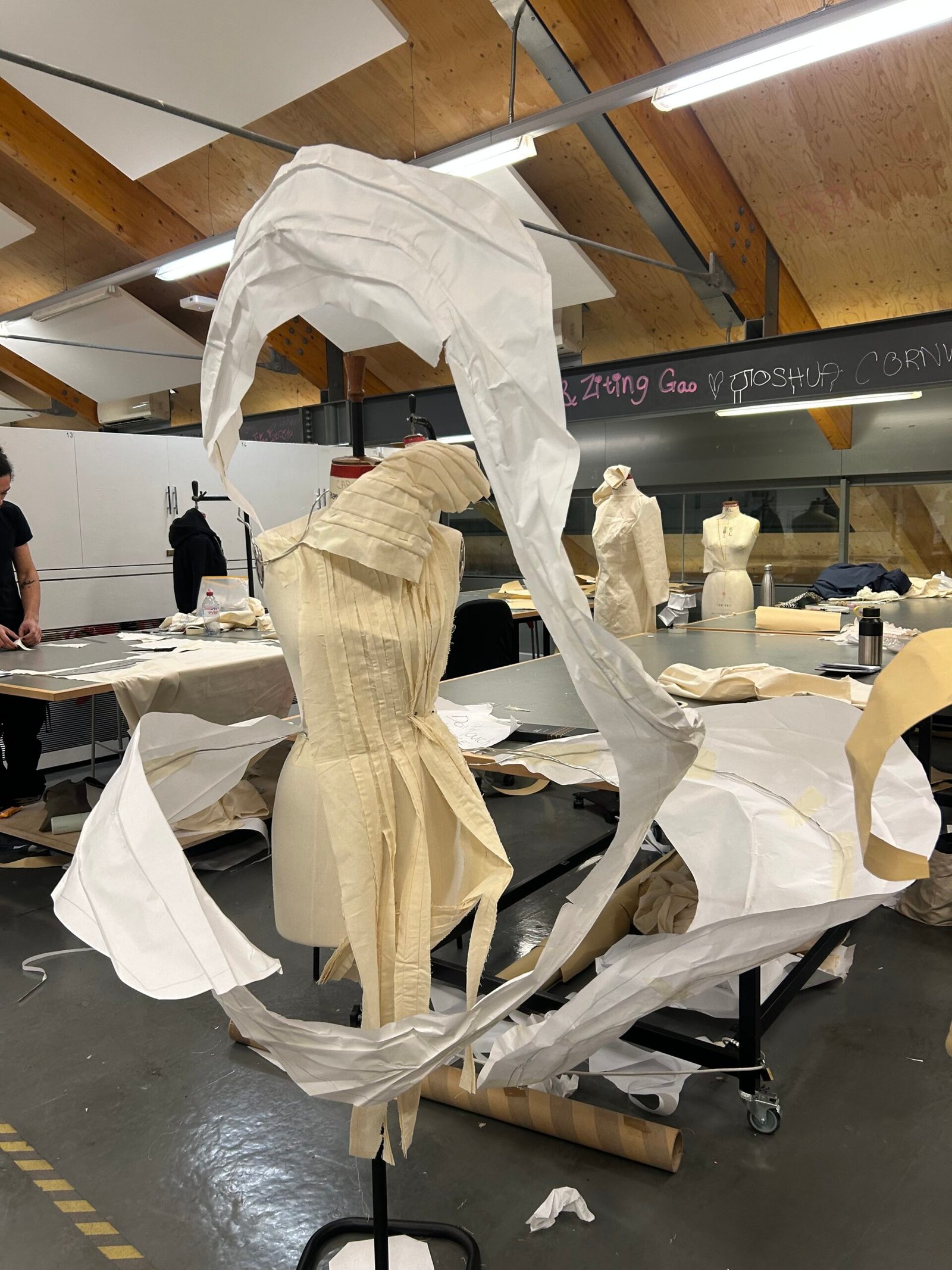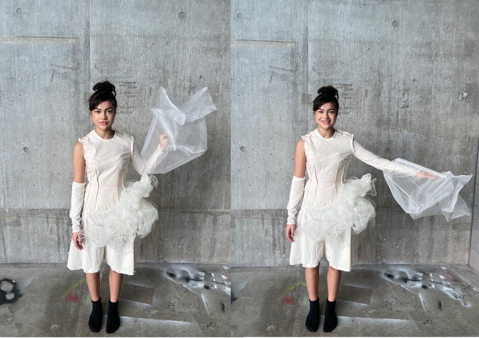 To create the texture, I manipulated damp tablecloth fabric around broomsticks and allowed it to set in place, producing curled forms with pleated crease details. The exaggerated volume of the skirt and sleeves is contrasted with a sleek, minimal top that accentuates the asymmetric waistline. This clean, clinical upper silhouette is intended to juxtapose the chaos, delusion, and hallucination expressed through the lower half of the look.