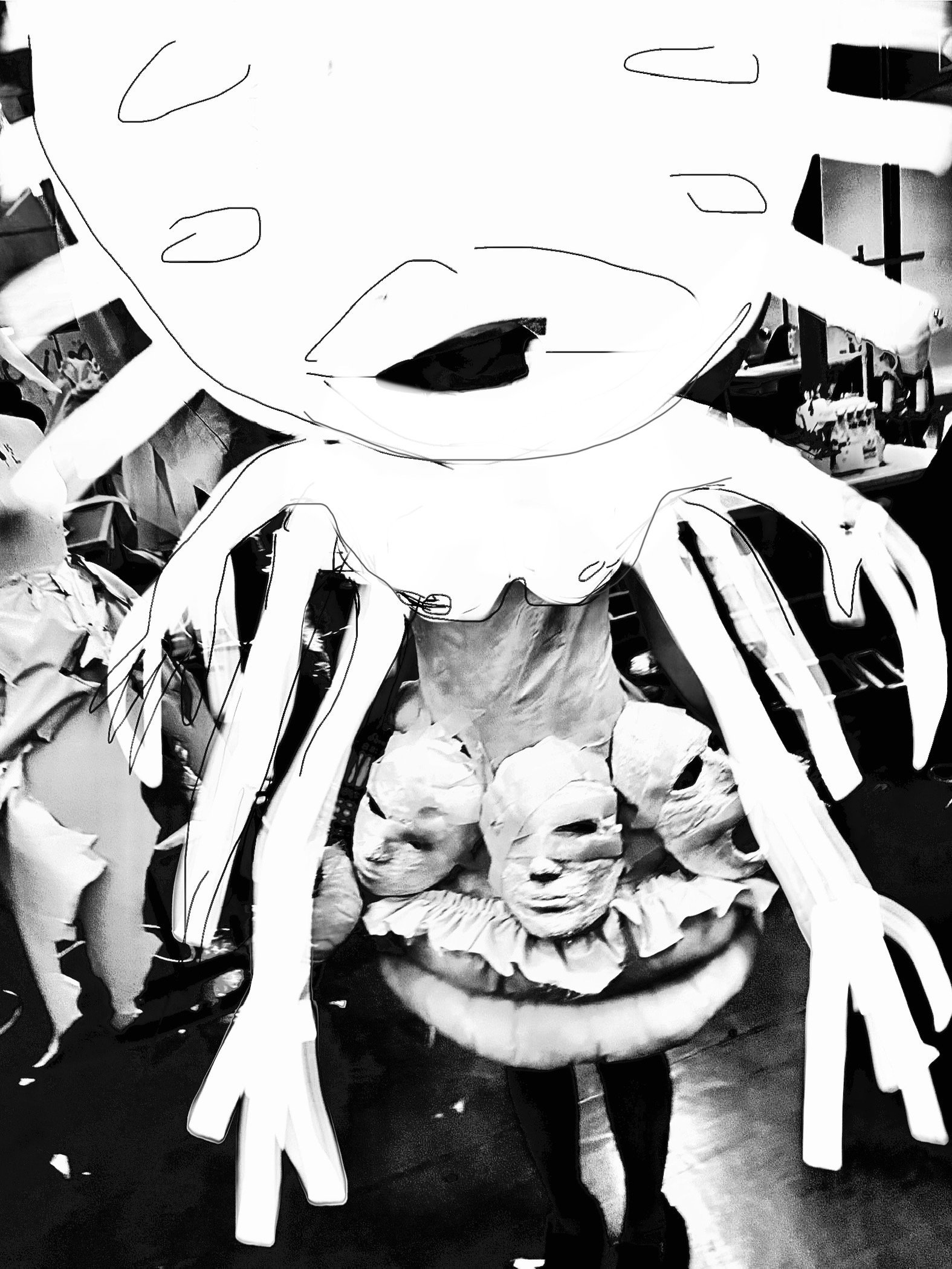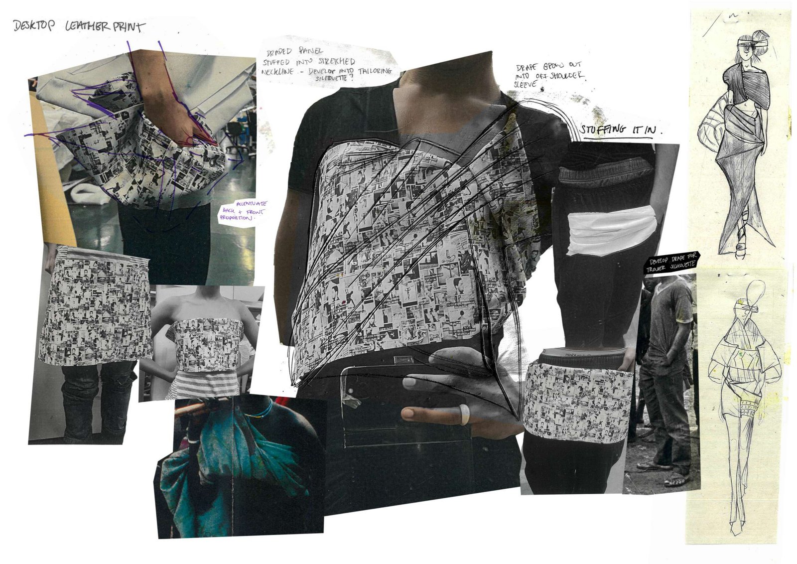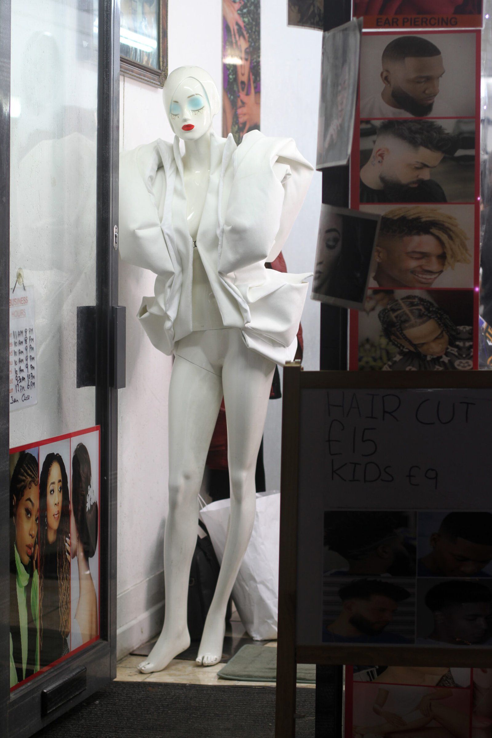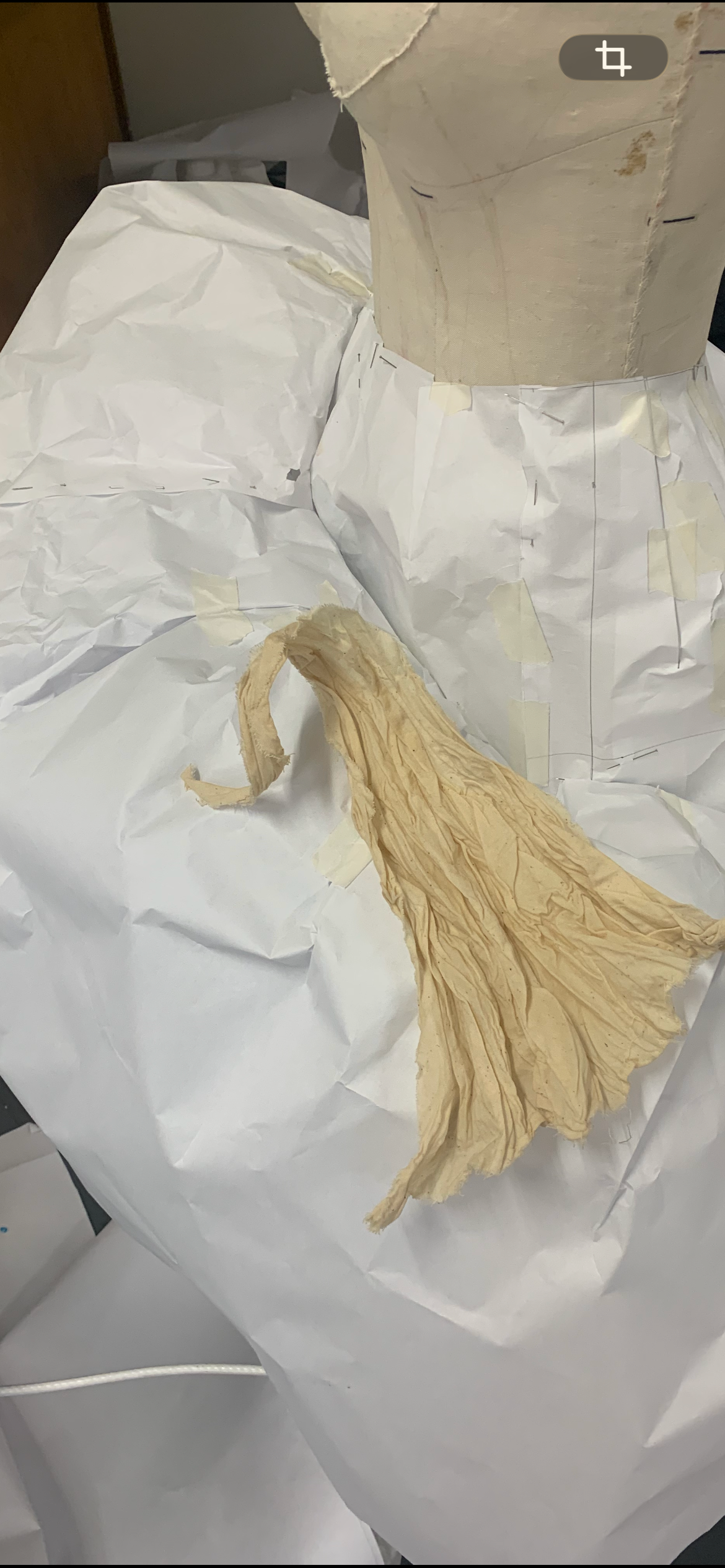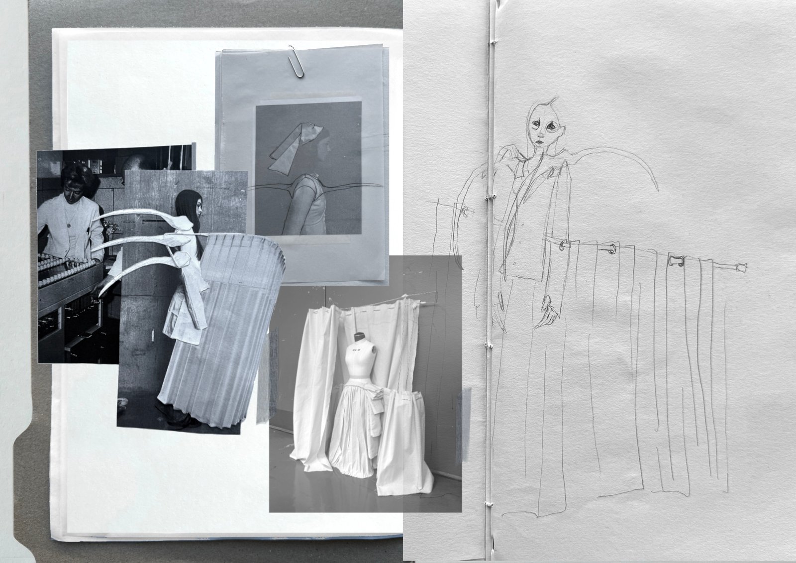 To create the texture, I manipulated damp tablecloth fabric around broomsticks and allowed it to set in place, producing curled forms with pleated crease details. The exaggerated volume of the skirt and sleeves is contrasted with a sleek, minimal top that accentuates the asymmetric waistline. This clean, clinical upper silhouette is intended to juxtapose the chaos, delusion, and hallucination expressed through the lower half of the look.