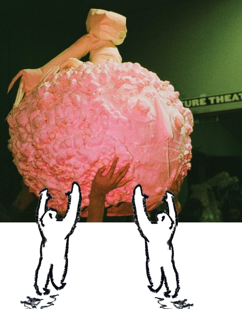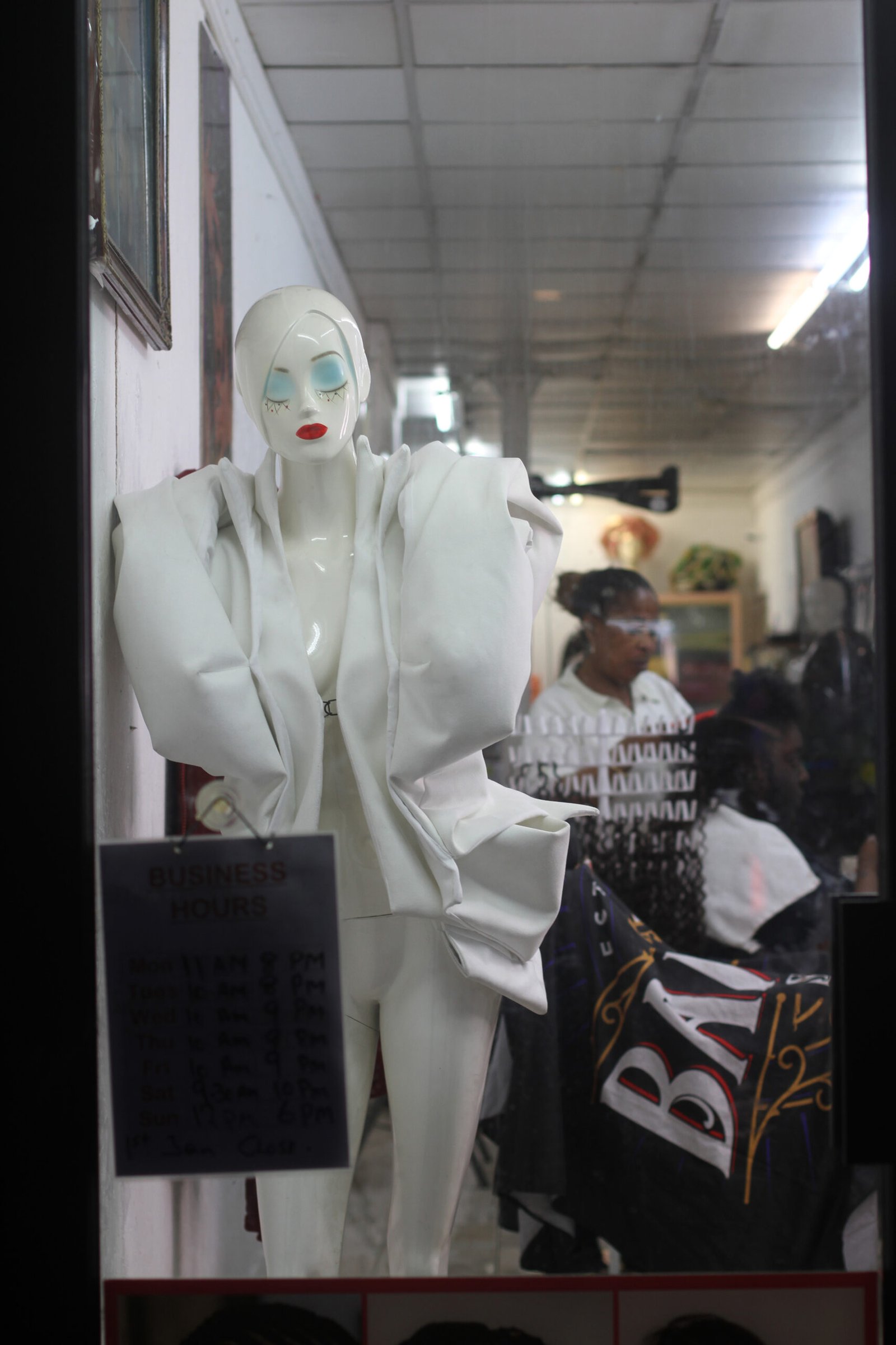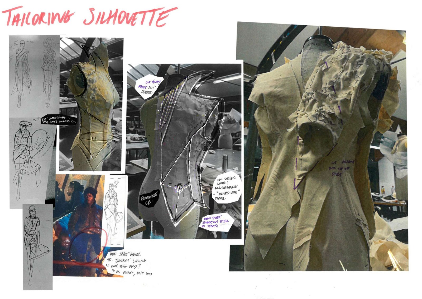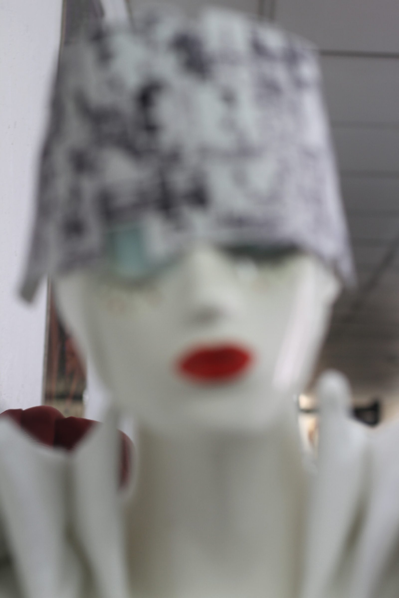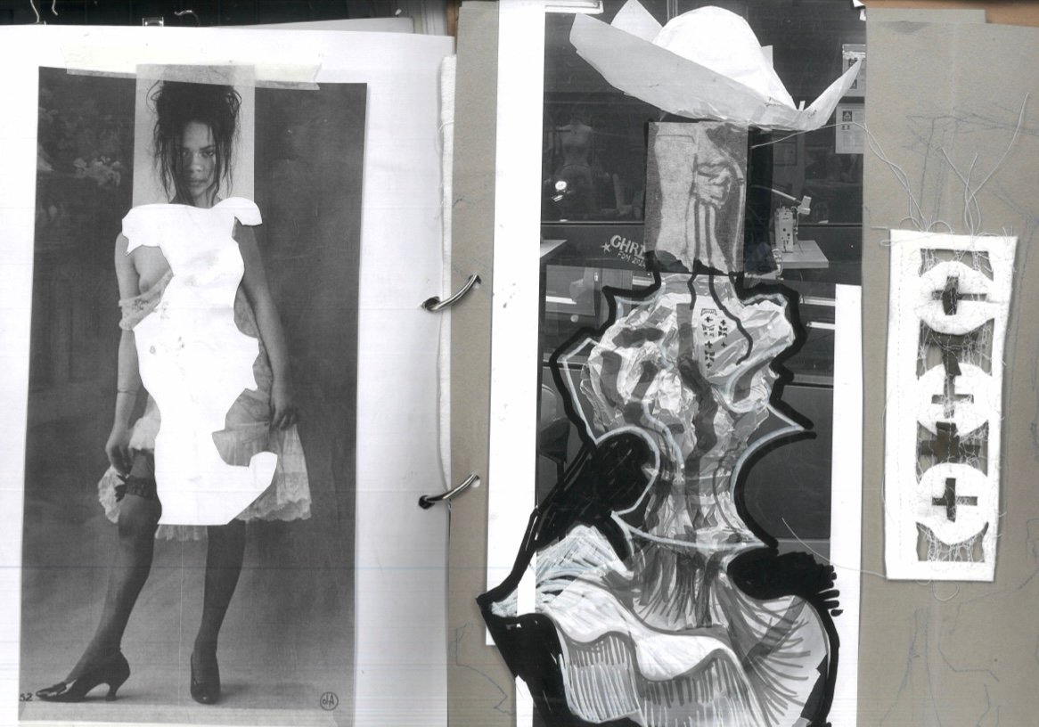To create the texture, I manipulated damp tablecloth fabric around broomsticks and allowed it to set in place, producing curled forms with pleated crease details. The exaggerated volume of the skirt and sleeves is contrasted with a sleek, minimal top that accentuates the asymmetric waistline. This clean, clinical upper silhouette is intended to juxtapose the chaos, delusion, and hallucination expressed through the lower half of the look.