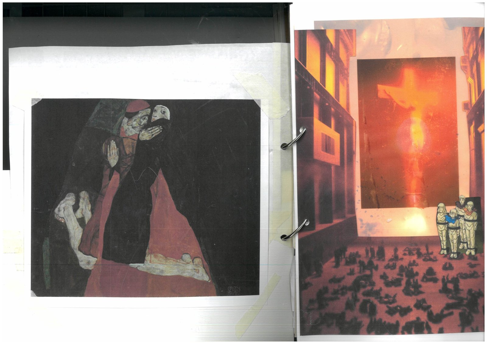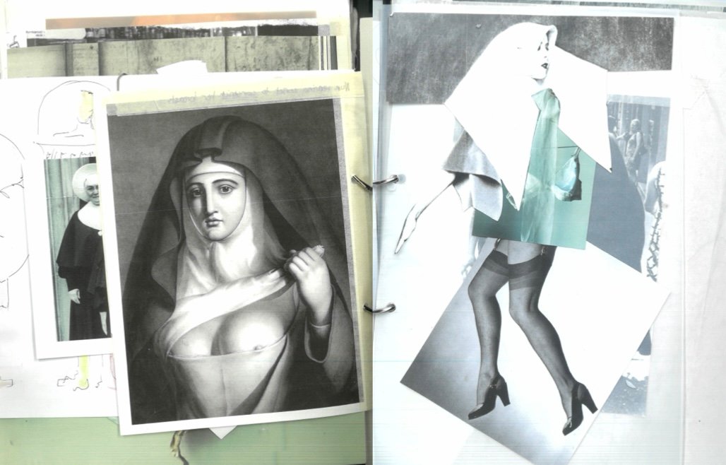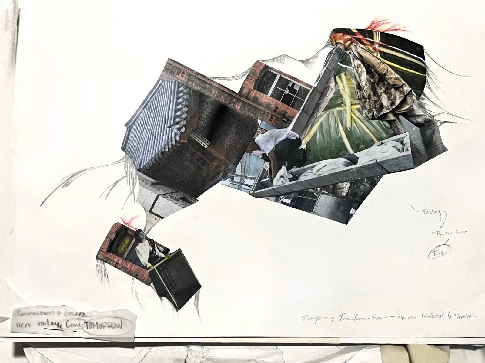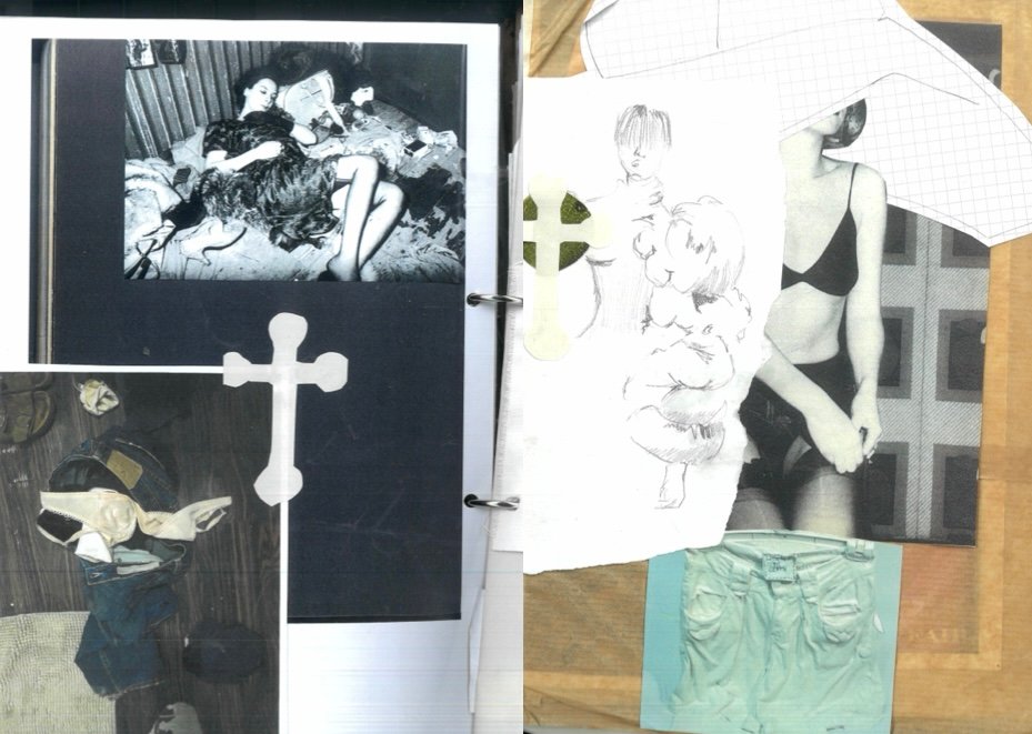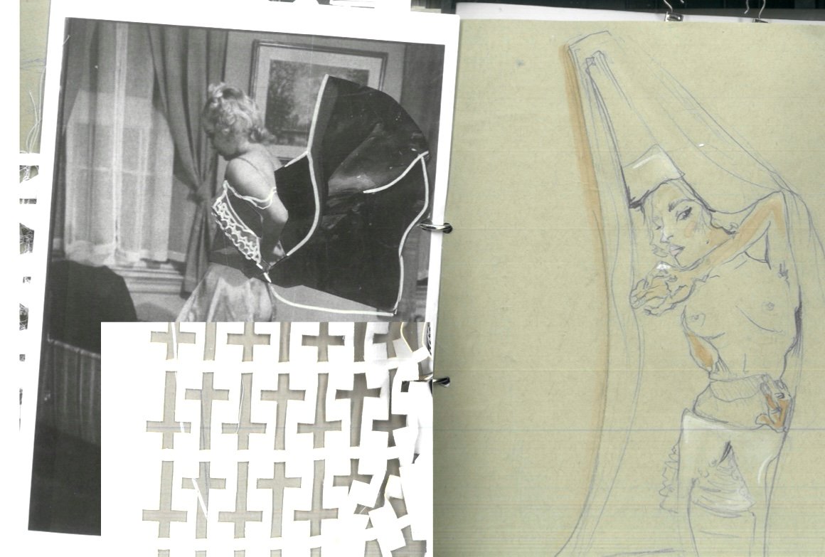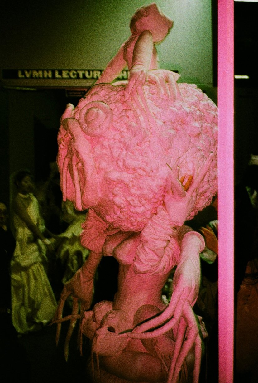 To create the texture, I manipulated damp tablecloth fabric around broomsticks and allowed it to set in place, producing curled forms with pleated crease details. The exaggerated volume of the skirt and sleeves is contrasted with a sleek, minimal top that accentuates the asymmetric waistline. This clean, clinical upper silhouette is intended to juxtapose the chaos, delusion, and hallucination expressed through the lower half of the look.