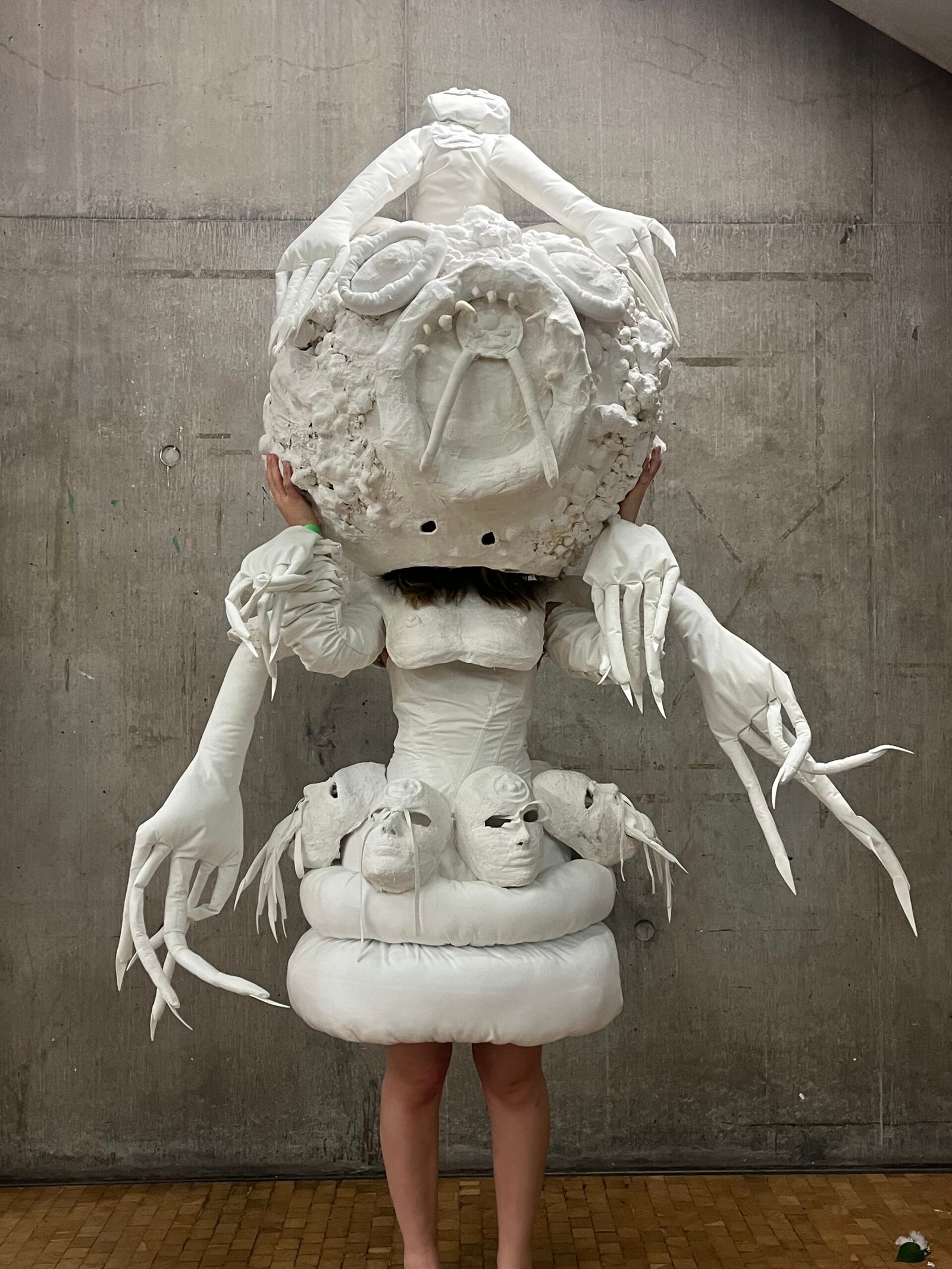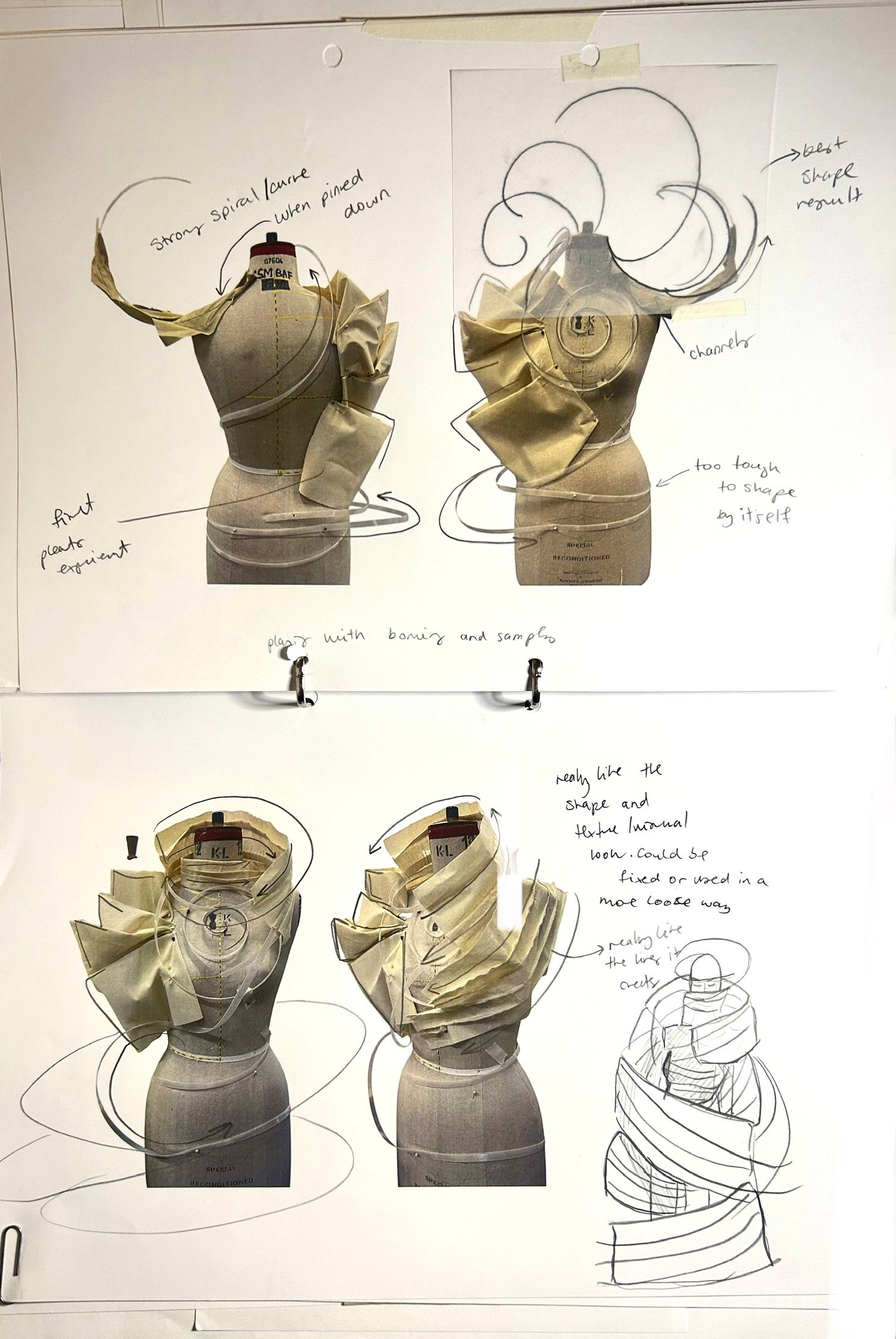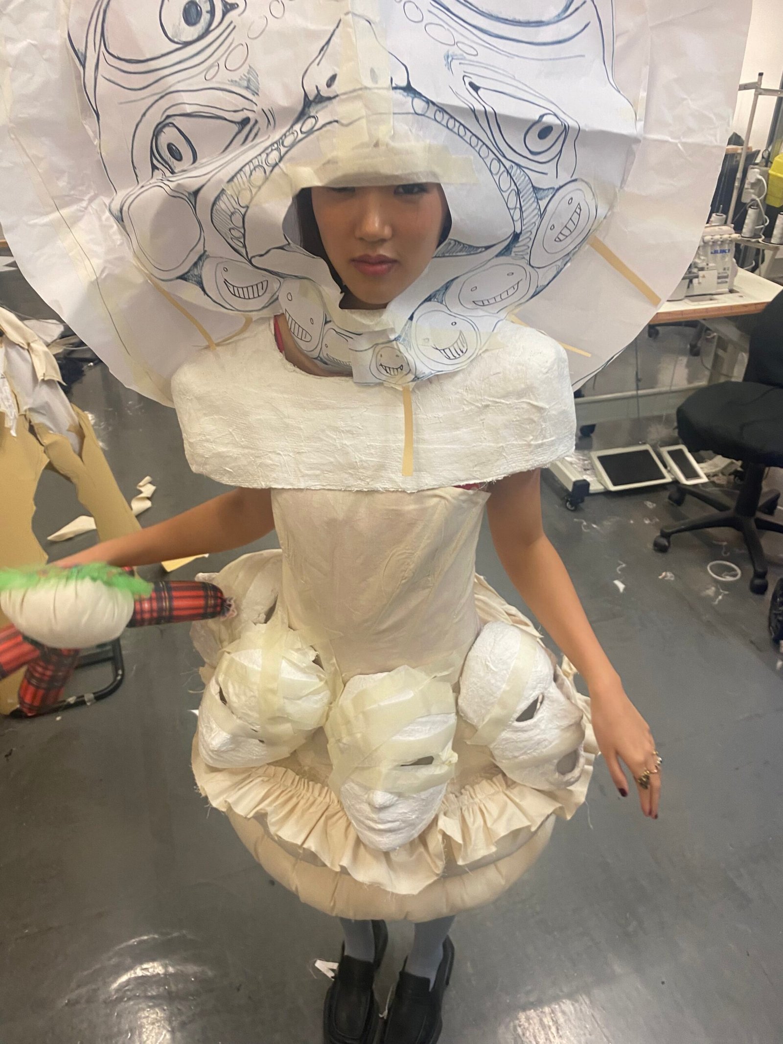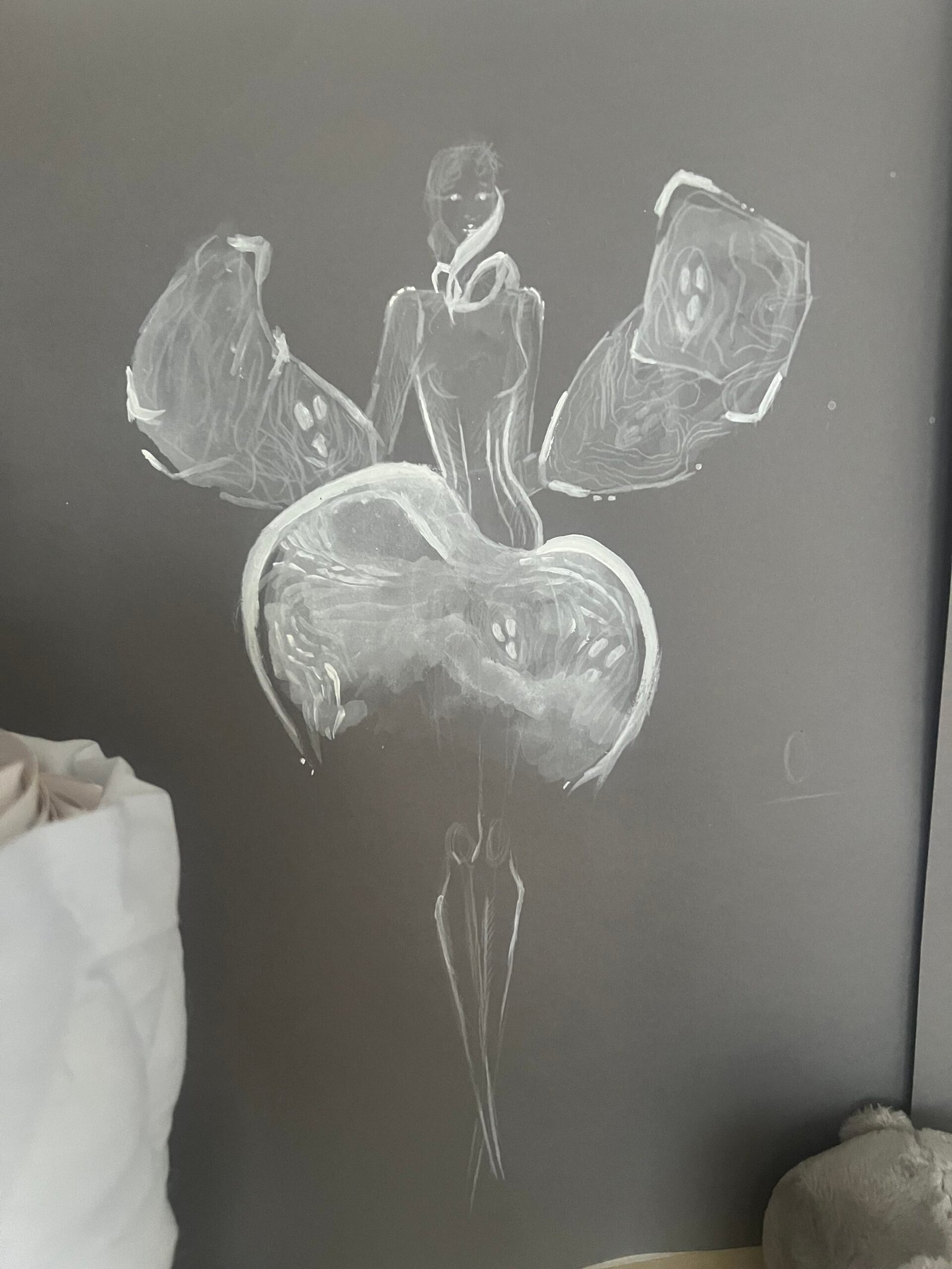 The swirling, rounded textures of the skirt represent how sensory deprivation can become overwhelming and all-consuming. The garment was designed to feel restrictive and unfamiliar, reflecting these psychological states. The dramatic silhouette of the skirt and oversized sleeves was developed by tracing and combining various organic shapes from my sketchbook, then experimenting with their placement on the body.