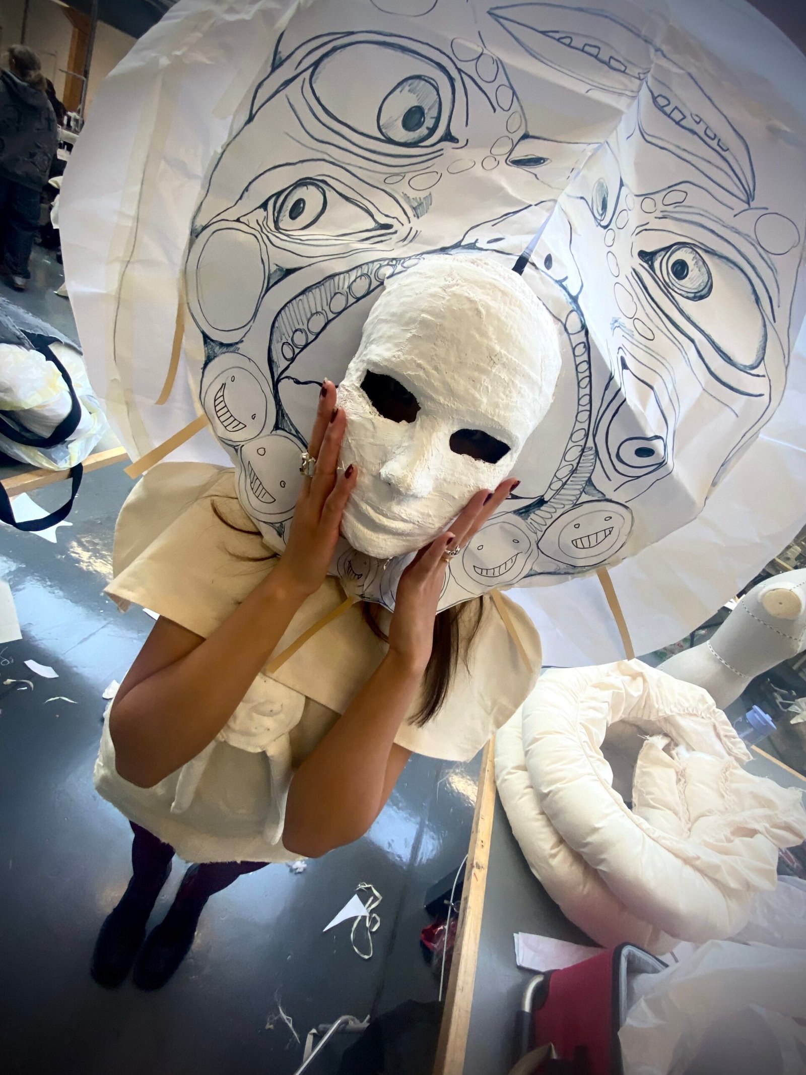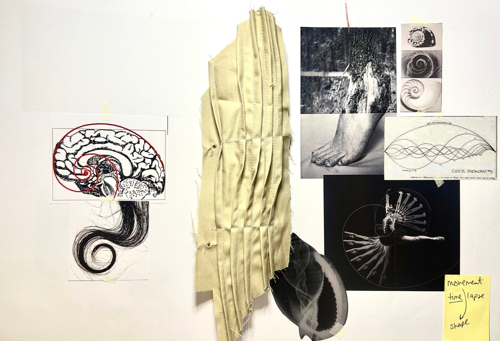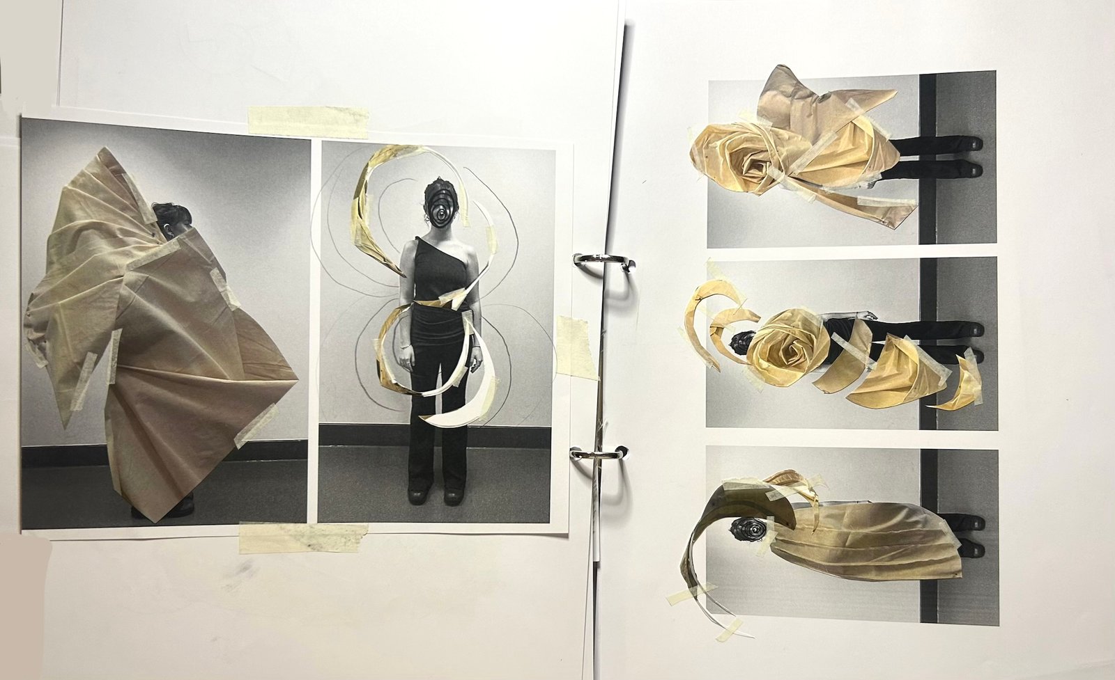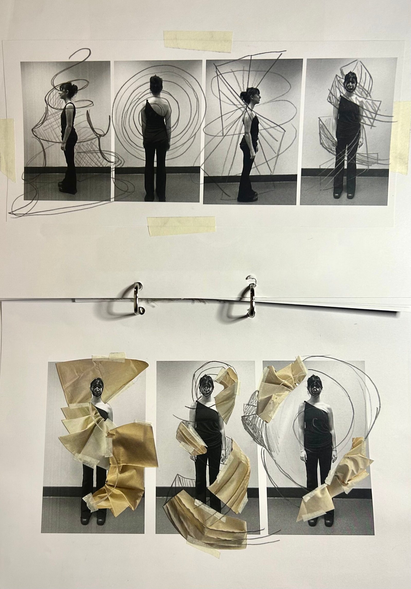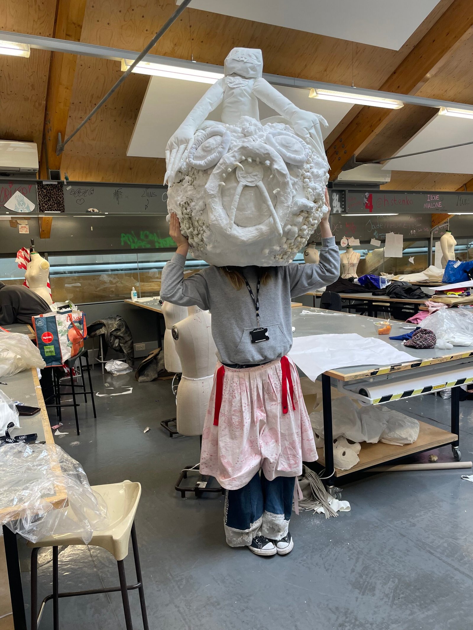 The swirling, rounded textures of the skirt represent how sensory deprivation can become overwhelming and all-consuming. The garment was designed to feel restrictive and unfamiliar, reflecting these psychological states. The dramatic silhouette of the skirt and oversized sleeves was developed by tracing and combining various organic shapes from my sketchbook, then experimenting with their placement on the body.
