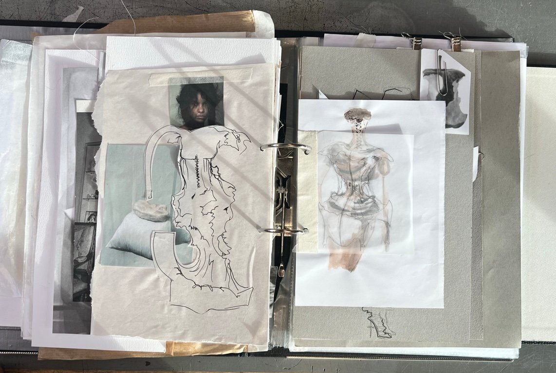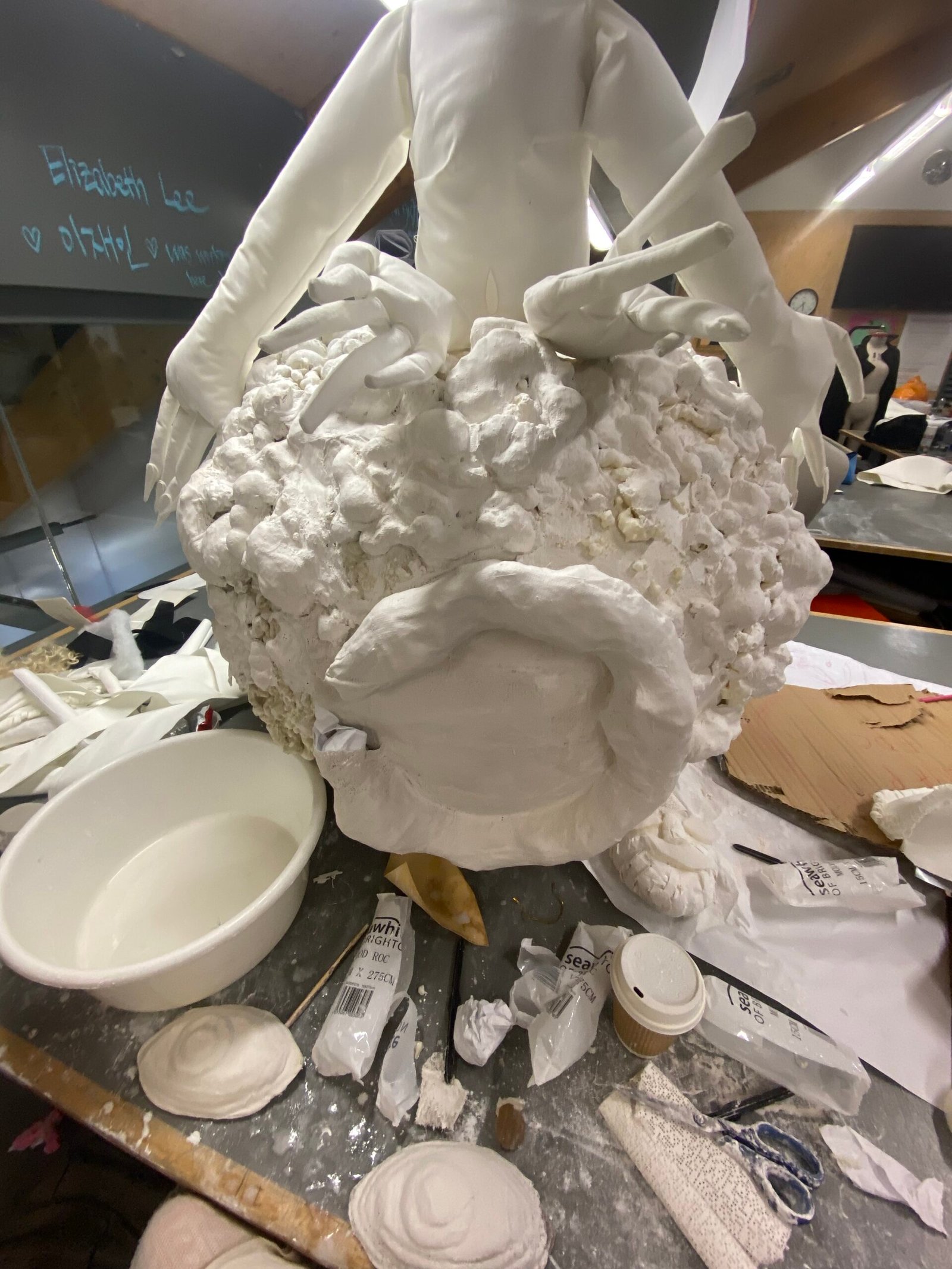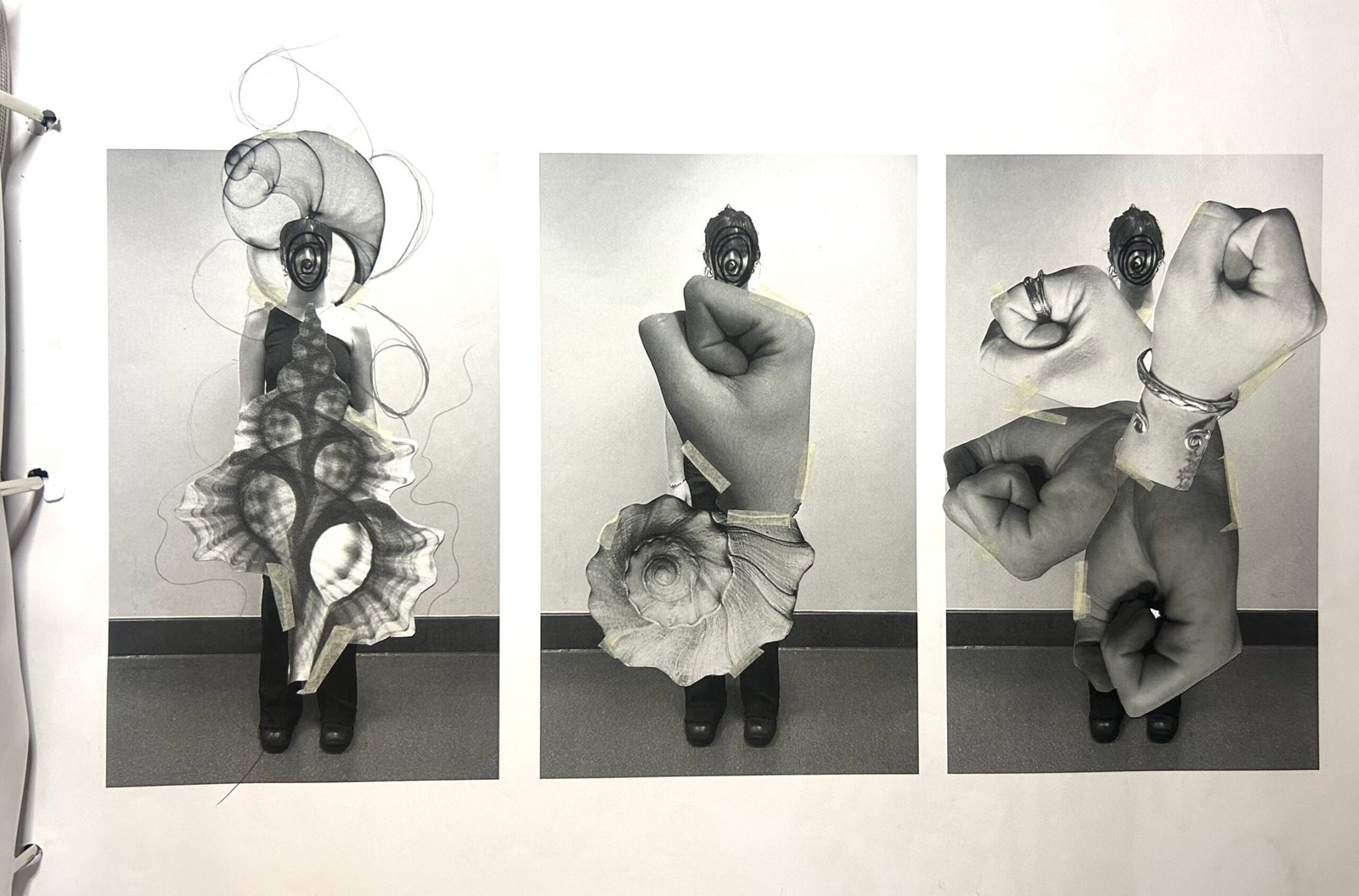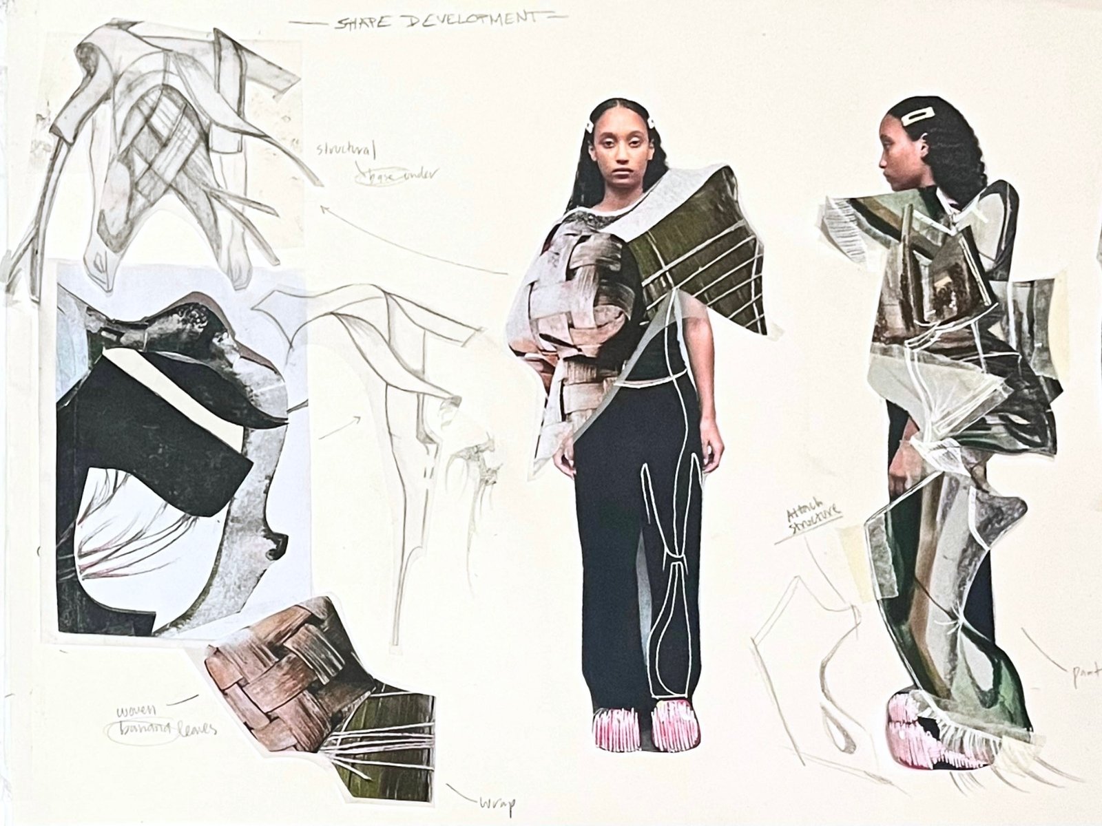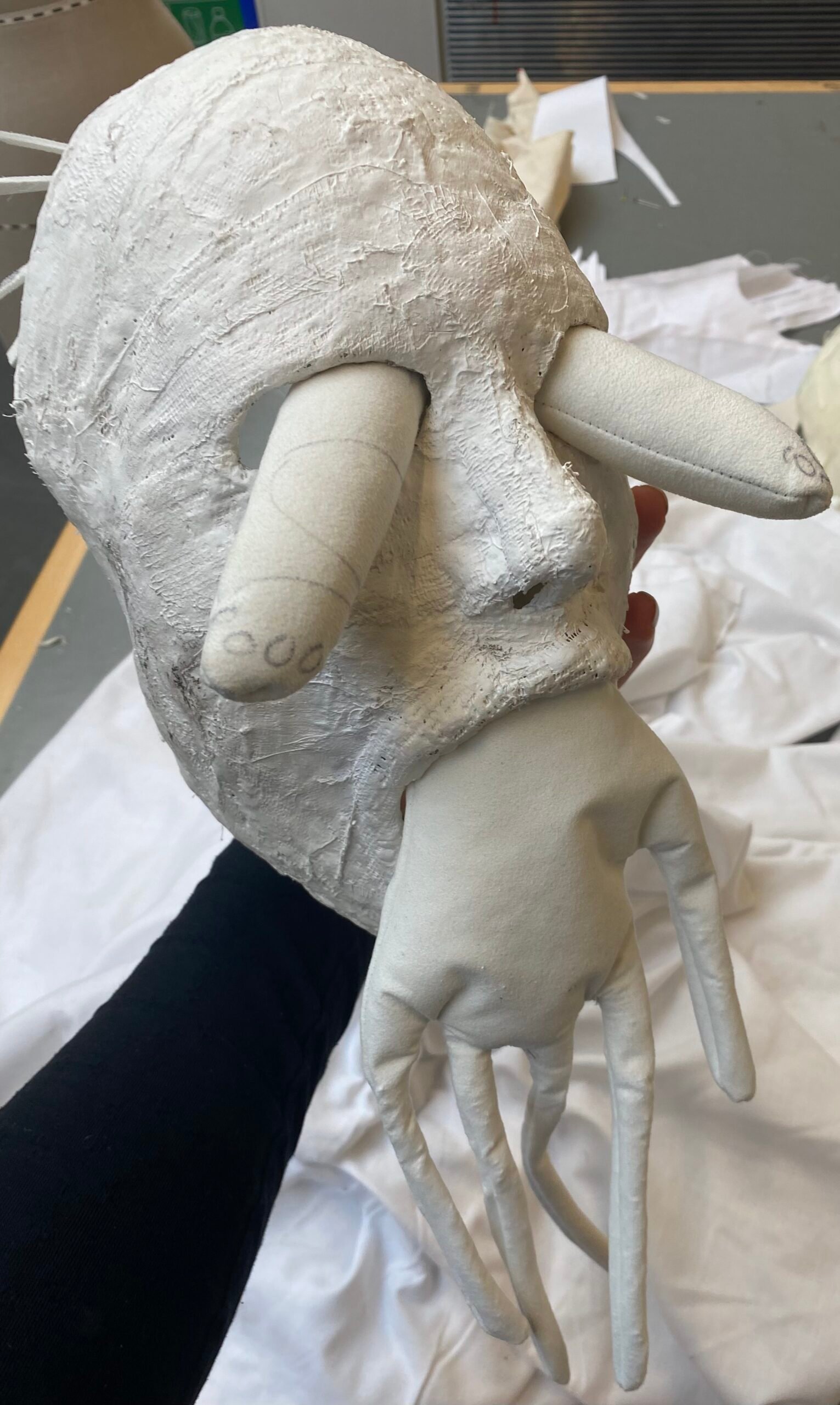 The swirling, rounded textures of the skirt represent how sensory deprivation can become overwhelming and all-consuming. The garment was designed to feel restrictive and unfamiliar, reflecting these psychological states. The dramatic silhouette of the skirt and oversized sleeves was developed by tracing and combining various organic shapes from my sketchbook, then experimenting with their placement on the body.