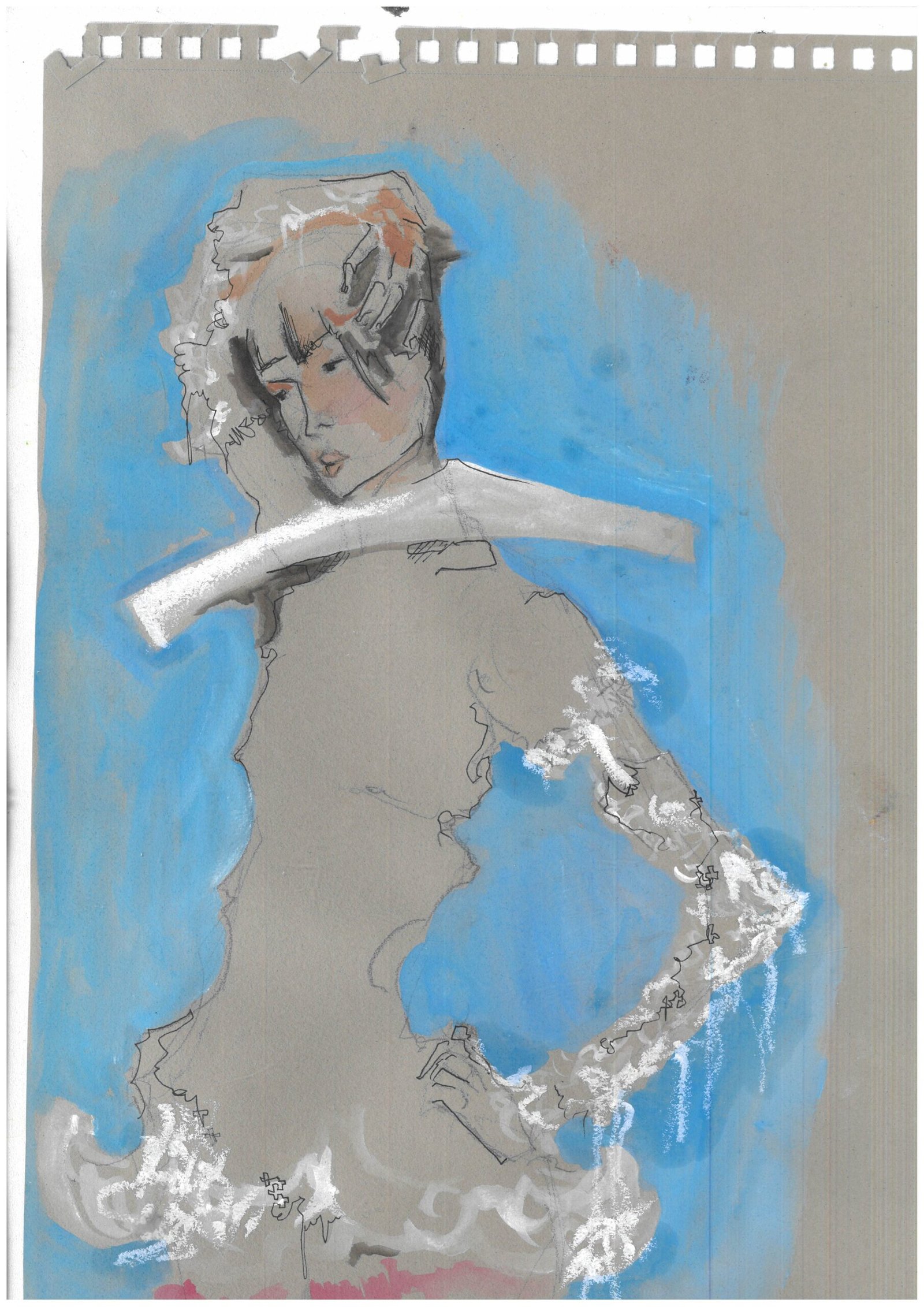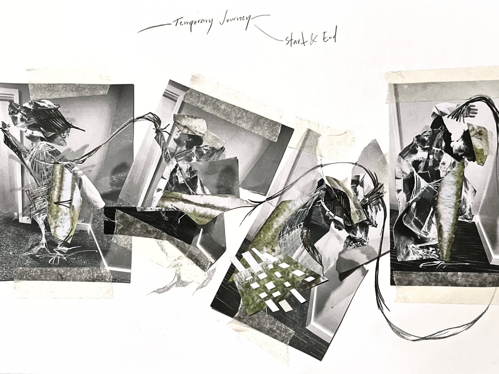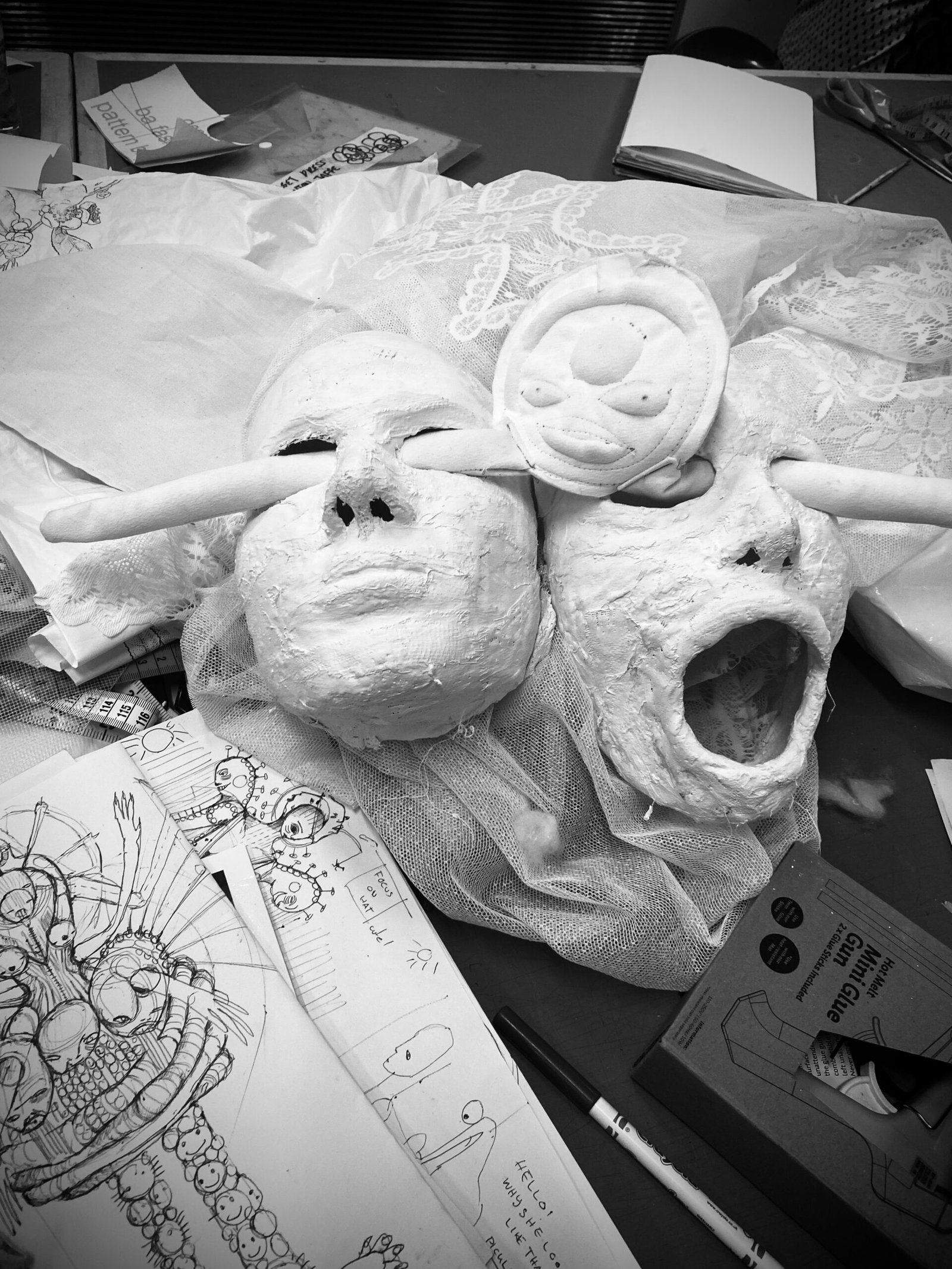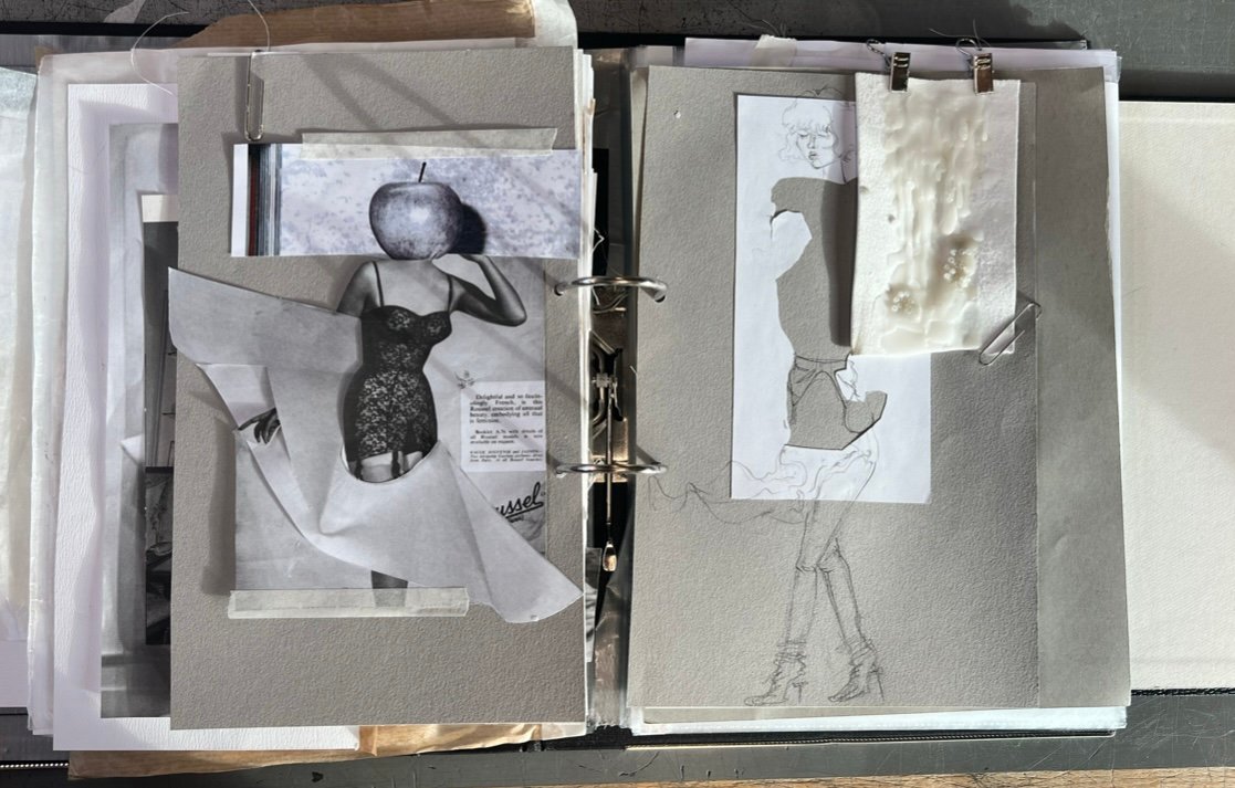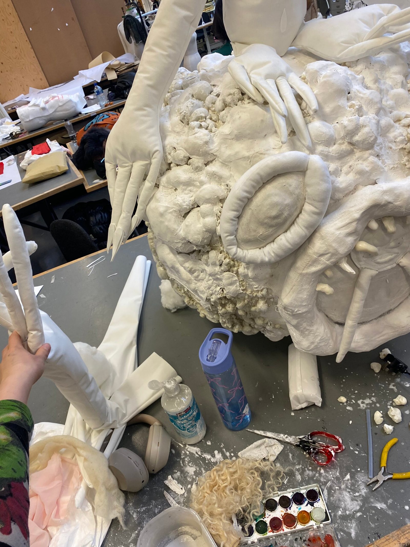 The swirling, rounded textures of the skirt represent how sensory deprivation can become overwhelming and all-consuming. The garment was designed to feel restrictive and unfamiliar, reflecting these psychological states. The dramatic silhouette of the skirt and oversized sleeves was developed by tracing and combining various organic shapes from my sketchbook, then experimenting with their placement on the body.