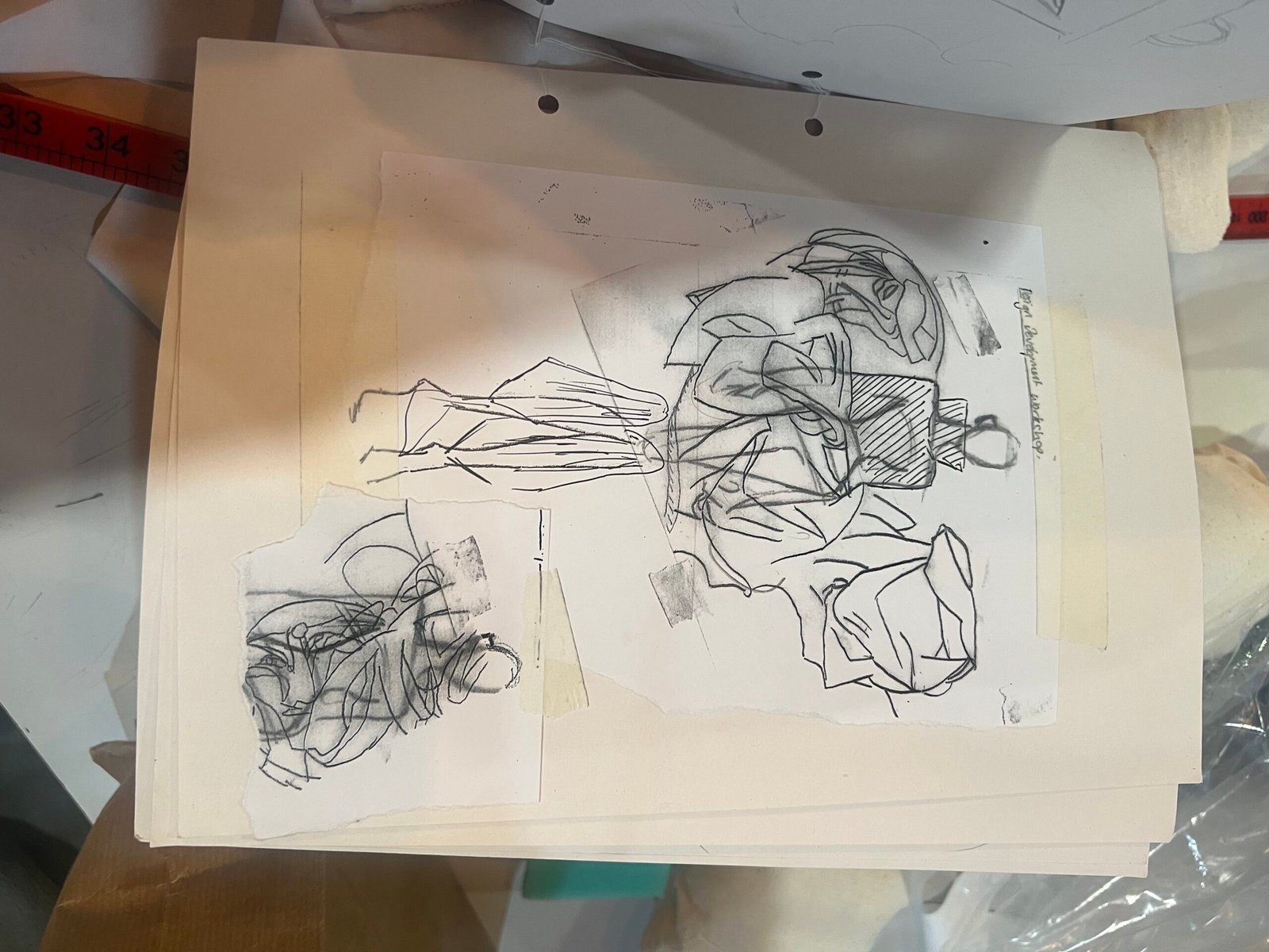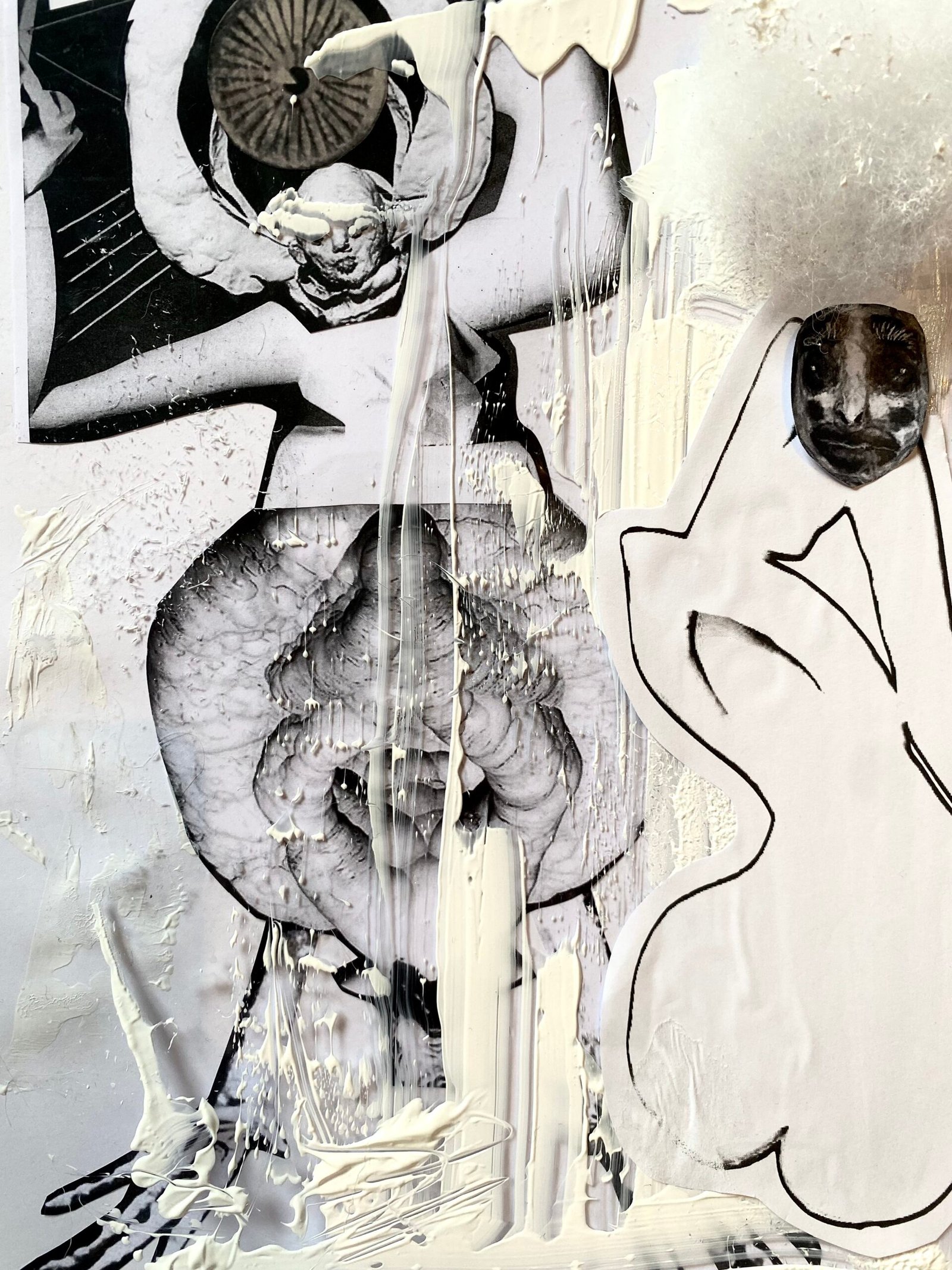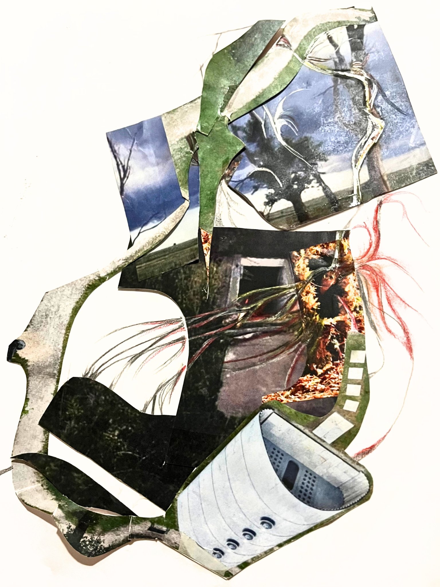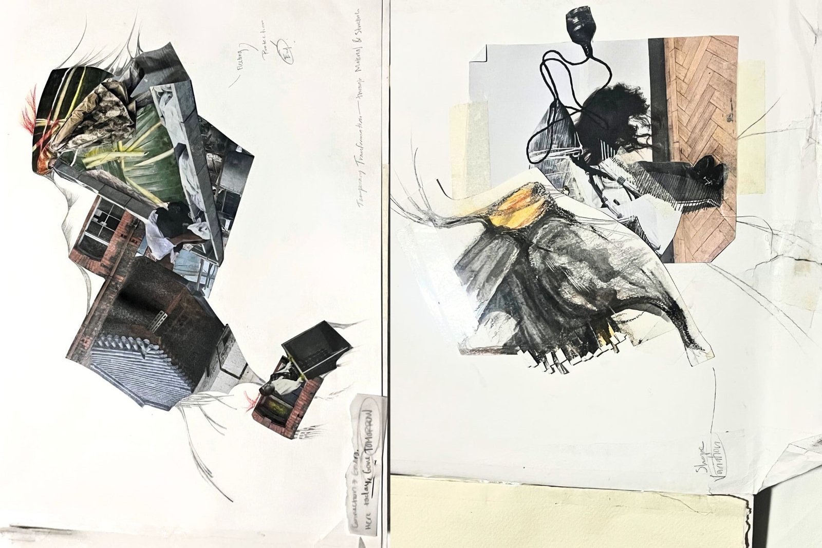 The swirling, rounded textures of the skirt represent how sensory deprivation can become overwhelming and all-consuming. The garment was designed to feel restrictive and unfamiliar, reflecting these psychological states. The dramatic silhouette of the skirt and oversized sleeves was developed by tracing and combining various organic shapes from my sketchbook, then experimenting with their placement on the body.